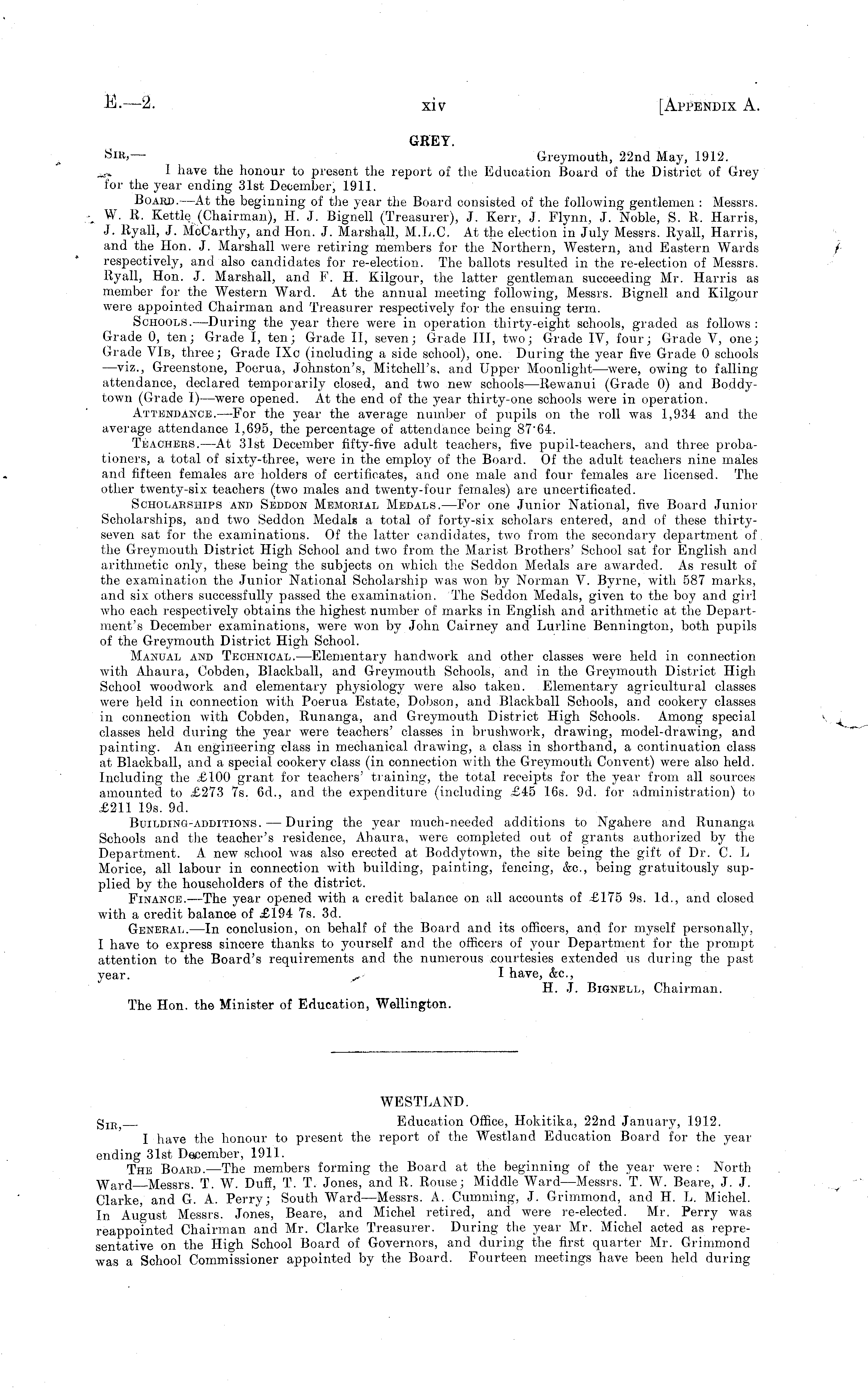 WESTLAND. g IE Education Office, Hokitika, 22nd January, 1912. I have the honour to present the report of the Westland Education Board for the year ending 31st December, 1911. The Board. —The members forming the Board at the beginning of the year were : North Ward Messrs. T. W. Duff, T. T. Jones, and R. Rouse; Middle Ward—Messrs. T. W. Beare, J. J. Clarke, and G. A. Perry; South Ward —Messrs. A. Cumming, J. Grimmond, and H. L. Michel. In August Messrs. Jones, Beare, and Michel retired, and were re-elected. Mr. Perry was reappointed Chairman and Mr. Clarke Treasurer. During the year Mr. Michel acted as representative on the High School Board of Governors, and during the first quarter Mr. Grimmond was a School Commissioner appointed by the Board. Fourteen meetings have been held during