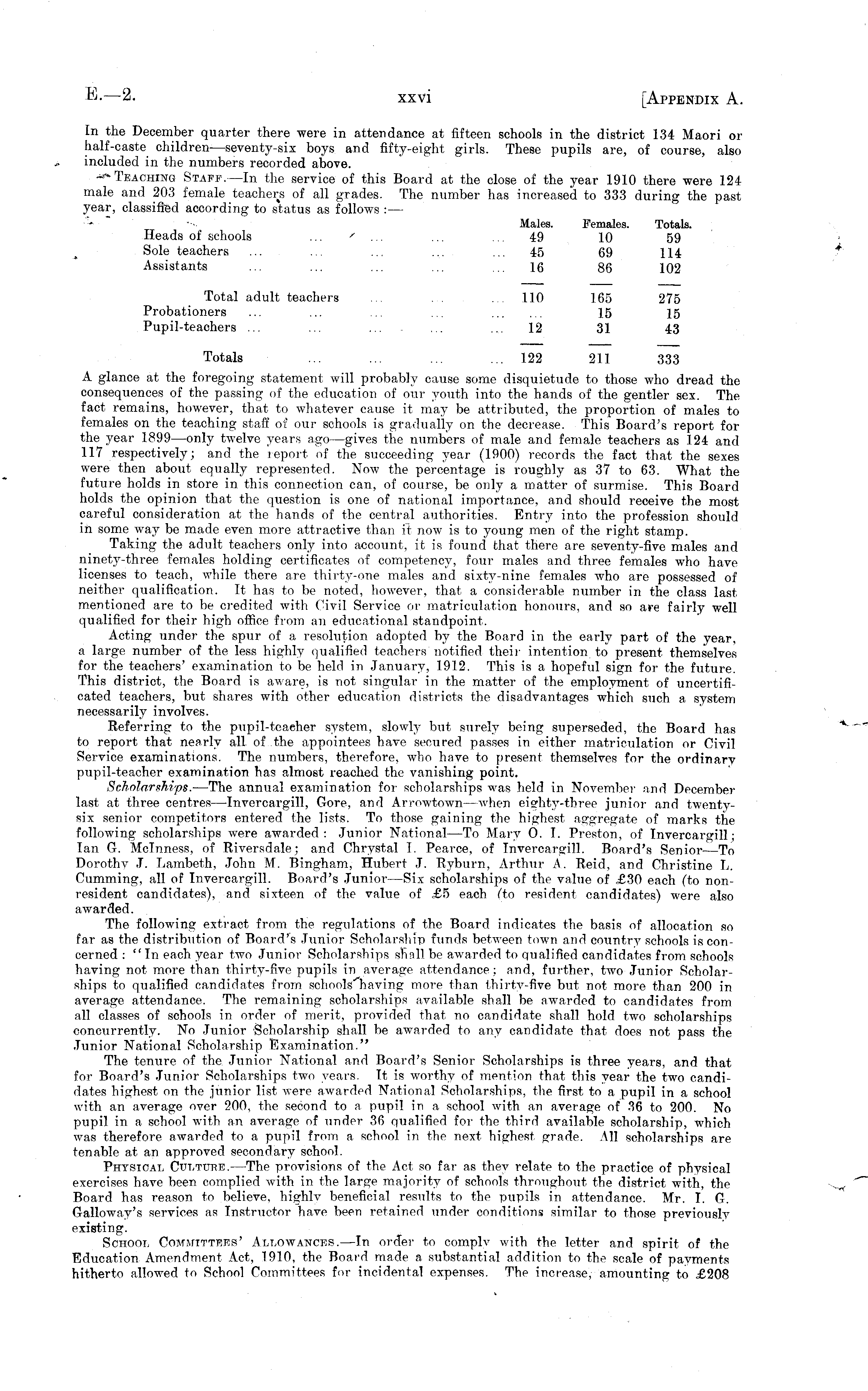 In the December quarter there were in attendance at fifteen schools in the district 134 Maori or half-caste children —seventy-six boys and fifty-eight girls. These pupils are, of course, also included in the numbers recorded above. ~~Teaching Staff.—ln the service of this Board at the close of the year 1910 there were 124 male and 203 female teachers of all grades. The number has increased to 333 during the past year, classified according to status as follows :— Males. Females. Totals. Heads of schools ... y ... ... ... 49 10 59 Sole teachers ... ... ... ... ... 45 69 114 Assistants ... ... ... ... ... 16 86 102 Total adult teachers ... ... ... 110 165 275 Probationers ... ... ... .. 15 15 Pupil-teachers ... ... ... ... 12 31 43 Totals ... ... ... ... 122 211 333 A glance at the foregoing statement will probably cause some disquietude to those who dread the consequences of the passing of the education of our youth into the hands of the gentler sex. The fact remains, however, that to whatever cause it may be attributed, the proportion of males to females on the teaching staff of our schools is gradually on the decrease. This Board's report for the year 1899 —only twelve years ago —gives the numbers of male and female teachers as 124 and 117 respectively; and the report of the succeeding year (1900) records the fact that the sexes were then about equally represented. Now the percentage is roughly as 37 to 63. What the future holds in store in this connection can, of course, be only a matter of surmise. This Board holds the opinion that the question is one of national importance, and should receive the most careful consideration at the hands of the central authorities. Entry into the profession should in some way be made even more attractive than it now is to young men of the right stamp. Taking the adult teachers only into account, it is found that there are seventy-five males and ninety-three females holding certificates of competency, four males and three females who have licenses to teach, while there are thirty-one males and sixty-nine females who are possessed of neither qualification. It has to be noted, however, that a considerable number in the class last mentioned are to be credited with Civil Service or matriculation honours, and so are fairly well qualified for their high office from an educational standpoint. Acting under the spur of a resolution adopted by the Board in the early part of the year, a large number of the less highly qualified teachers notified their intention to present themselves for the teachers' examination to be held in January, 1912. This is a hopeful sign for the future. This district, the Board is aware, is not singular in the matter of the employment of uncertificated teachers, but shares with other education districts the disadvantages which such a system necessarily involves. Referring to the pupil-teacher system, slowly but surely being superseded, the Board has to report that nearly all of the appointees have secured passes in either matriculation or Civil Service examinations. The numbers, therefore, who have to present themselves for the ordinary pupil-teacher examination has almost reached the vanishing point. Scholarships. —The annual examination for scholarships was held in November and December last at three centres —Invercargill, Gore, and Arrowtown —when eighty-three junior and twentysix senior competitors entered the lists. To those gaining the highest aggregate of marks the following scholarships were awarded: Junior National—To Mary O. I. Preston, of Invercargill; lan G. Mclnness, of Riversdale; and Chrystal I. Pearce, of Invercargill. Board's Senior—To Dorothy J. Lambeth, John M. Bingham, Hubert J. Ryburn, Arthur A. Reid, and Christine L. Cumming, all of Invercargill. Board's Junior—Six scholarships of the value of £30 each (to nonresident candidates), and sixteen of the value of £5 each (to resident candidates) were also awarded. The following extract from the regulations of the Board indicates the basis of allocation so far as the distribution of Board's Junior Scholarship funds between town and country schools is concerned : "In each year two Junior Scholarships shall be awarded to qualified candidates from schools having not more than thirty-five pupils in average attendance; and, further, two Junior Scholarships to qualified candidates from schools'Tiaving more than thirty-five but not more than 200 in average attendance. The remaining scholarships available shall be awarded to candidates from all classes of schools in order of merit, provided that no candidate shall hold two scholarships concurrently. No Junior Scholarship shall be awarded to any candidate that does not pass the Junior National Scholarship Examination." The tenure of the Junior National and Board's Senior Scholarships is three years, and that for Board's Junior Scholarships two years. It is worthy of mention that this year the two candidates highest on the junior list were awarded National Scholarships, the first to a pupil in a school with an average over 200, the second to a pupil in a school with an average of 36 to 200. No pupil in a school with an average of under 36 qualified for the third available scholarship, which was therefore awarded to a pupil from a school in the next highest grade. All scholarships are tenable at an approved secondary school. Physical Culture. —The provisions of the Act so far as they relate to the practice of physical exercises have been complied with in the large majority of schools throughout the district with, the Board has reason to believe, highly beneficial results to the pupils in attendance. Mr. I. G. Galloway's services as Instructor have been retained under conditions similar to those previously existing. School Committees' Allowances. —In order to comply with the letter and spirit of the Education Amendment Act, 1910, the Board made a substantial addition to the scale of payments hitherto allowed