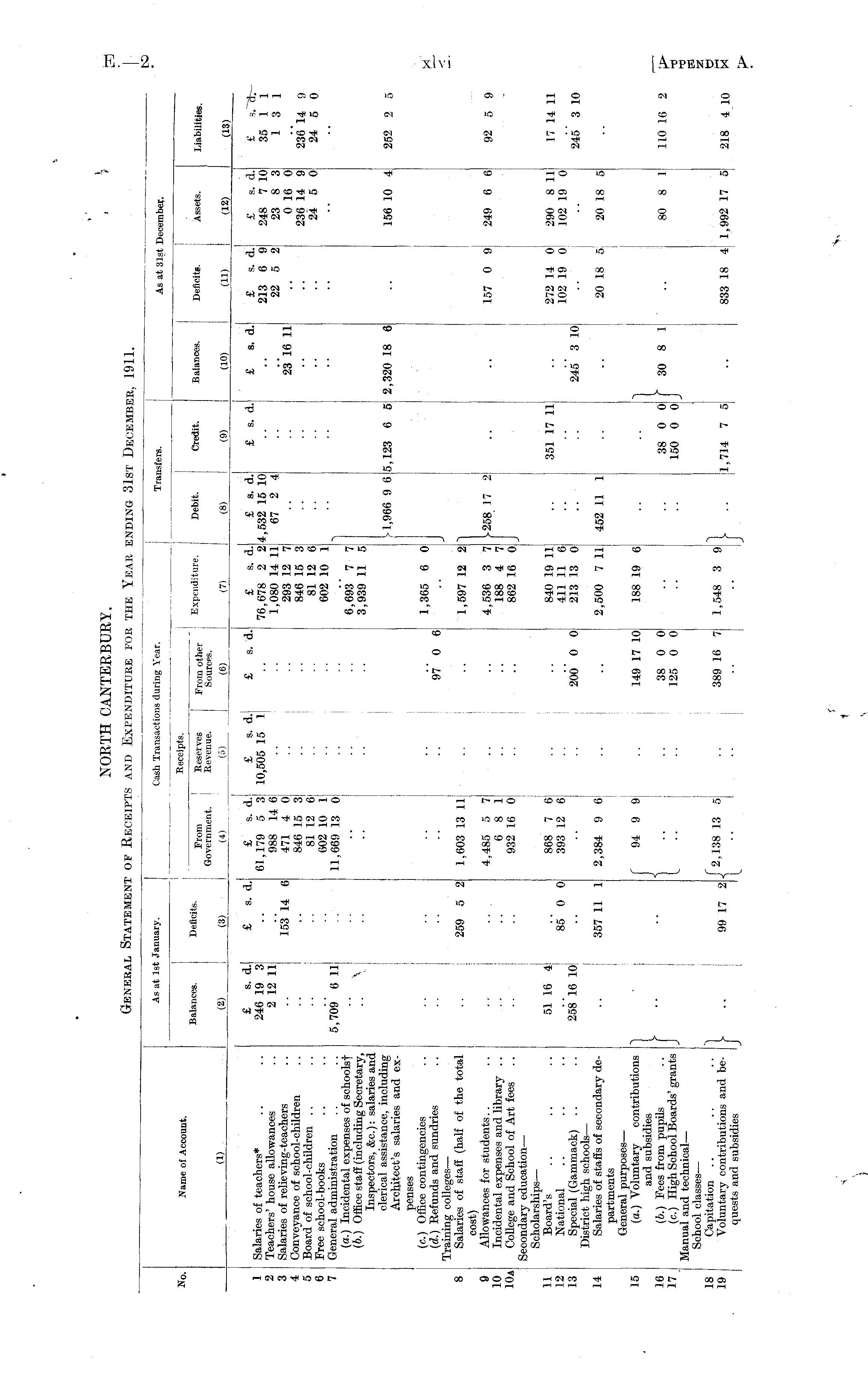 As at 1st January. Cash Transactions during Year. Transfers. As at 31st December. So. JVame of Account. Balances. Deficits. (8) From Government. Reserves Revenue. (5) ' Receipts. From other Sources. (6) Expenditure. Debit. Credit. Balances. (10) Deficits. (11) Assets. (12) Liabilities. (1) (7> (8) (9) (13) 1 2 3 4 5 6 7 Salaries of teachers* Teachers' house allowances Salaries of relieving-teachers Conveyance of school-children Board of school-children Free school-books General administration (a. ) Incidental expenses of sehoolsf (b. ) Office staff (including Secretary, Inspectors, &c): salaries and clerical assistance, including Architect's salaries and ex- £ s. d. 246 19 3 2 12 11 £ s. d. 153' 14 6 £ s. d. £ s. d. 61,179 5 3 10,505 15 ll 988 14 6 471 4 0 846 15 3 81 12 6 602 10 1 11,669 13 0 £ s. d. £ s. d. 76,678 2 2 1,080 14 11 293 12 7 846 15 3 81 12 6 602 10 1 £ s. d. ,532 15 10 67 2 4 £ s. d. •• £ s. d. 23 16 11 £ s. d. 213 6 9 22 5 2 £ s. d. 248 7 10 23 8 3 0 16 0 236 14 9 24 5 0 £ s.~rjr 35 1 1 1 3 1 236 14 9 24 5 0 .. ■• ! 5,709 6 11 •■ , i :: \ .. .. ■• 6,693' 7 7 3,939 11 5 > 1,966 9 6 5,123 6 5 2,320 18 6 156 10 4 252 2 5 8 penses (c.) Office contingencies (d.) Refunds and sundries Training colleges — Salaries of staff (half of the total cost) Allowances for students Incidental expenses and library .. College and School of Art fees Secondary education — Scholarships — Board's National Special (Gammack) District high schools — Salaries of staffs of secondary departments General purposes — (a.) Voluntary contributions and subsidies (b.) Pees from pupils (c.) High School Boards' grants Manual and technical — School classes — Capitation Voluntary contributions and bequests and subsidies 1,365 6 0 ! • • •• " 97' 0 6 259 5 2 1,603 13 11 1,597 12 2 9 10 10a 4,485 5 7 6 8 1 932 16 0 4,536 3 7 188 4 7 862 16 0 ►258 17 2 157 0 9 249 6 6 92 5 9 11 12 13 51 16 4 258 16 10 85' 0 0 868 7 6 393 12 6 200 0 0 840 19 11 411 11 6 213 13 0 351 17 11 272 14 0 102 19 0 290 8 11 102 19 0 17 14 11 245 3 10 245 3 10 14 357 11 1 2,384 9 6 2,500 7 11 452 11 1 20 18 5 20 18 5 15 16 17 } f 94 9 9 { :: :: 149 17 10 38 0 0 125 0 0 188 19 6 } 30 8 1 80 8 1 110 16 2 38 0 0 150 0 0 18 19 } 99 17 2 /2.138 13 5 389 16 7 1,548 3 9 1 j l,714 7 5 833 18 4 1,992 17 5 218 4 10 I