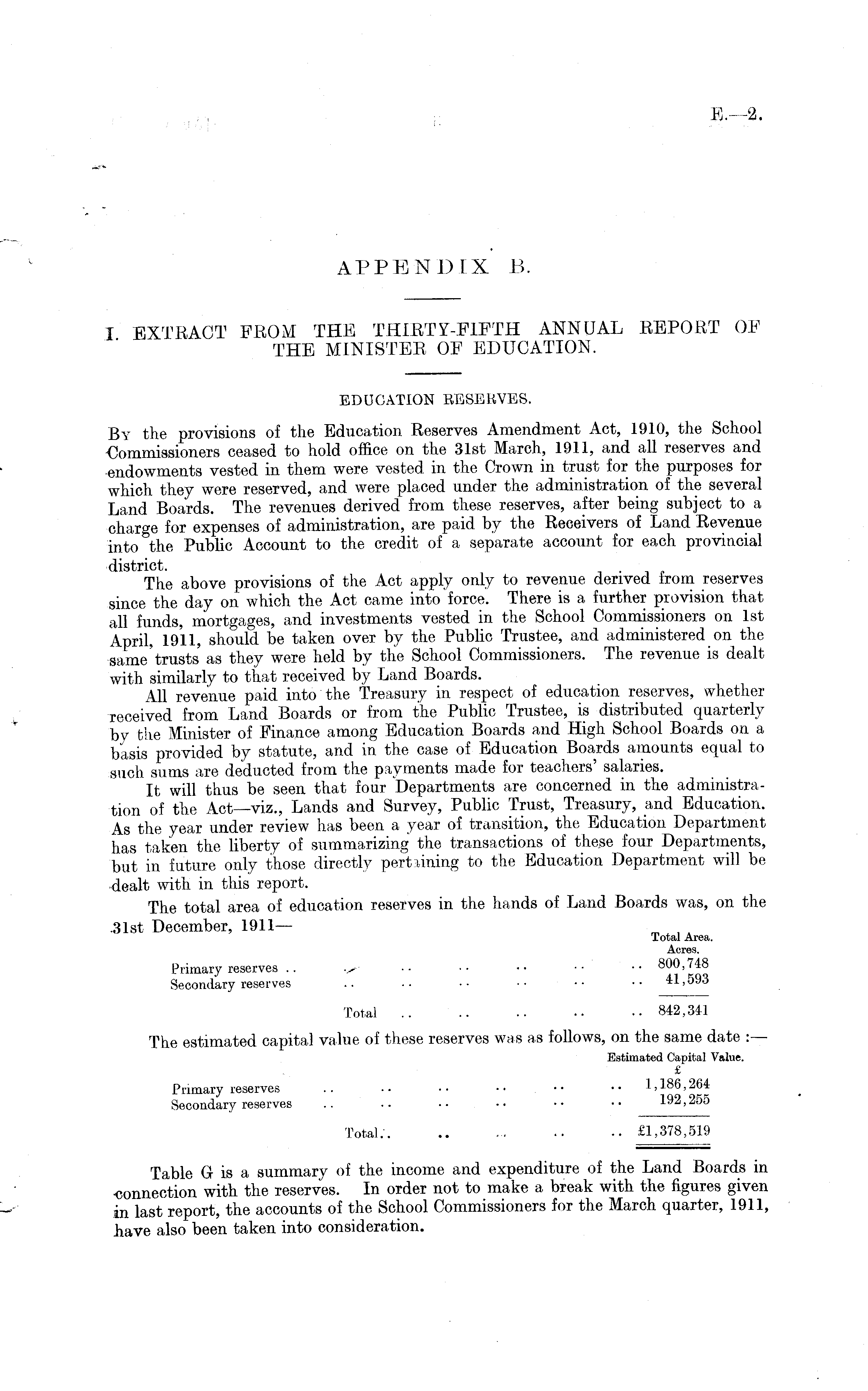 EDUCATION EESBRVES. By the provisions of the Education Reserves Amendment Act, 1910, the School Commissioners ceased to hold office on the 31st March, 1911, and all reserves and endowments vested in them were vested in the Crown in trust for the purposes for which they were reserved, and were placed under the administration of the several Land Boards. The revenues derived from these reserves, after being subject to a charge for expenses of administration, are paid by the Receivers of Land Revenue into the Public Account to the credit of a separate account for each provincial district. The above provisions of the Act apply only to revenue derived from reserves since the day on which the Act came into force. There is a further provision that all funds, mortgages, and investments vested in the School Commissioners on Ist April, 1911, should be taken over by the Public Trustee, and administered on the same'trusts' as they were held by the School Commissioners. The revenue is dealt with similarly to that received by Land Boards. All revenue paid into the Treasury in respect of education reserves, whether received from Land Boards or from the Public Trustee, is distributed quarterly by the Minister of Finance among Education Boards and High School Boards on a basis provided by statute, and in the case of Education Boards amounts equal to such sums are deducted from the payments made for teachers' salaries. It will thus be seen that four Departments are concerned in the administration of the Act—viz., Lands and Survey, Public Trust, Treasury, and Education. As the year under review has been a year of transition, the Education Department has taken the liberty of summarizing the transactions of these four Departments, but in future only those directly pert lining to the Education Department will be dealt with in this report. The total area of education reserves in the hands of Land Boards was, on the .31st December, 1911 — Total Area. Acres. Primary reserves .. ■■ ■■ ■• •• •• 800,74:8 Secondary reserves .. ■• •■ •• •■ •• 41,590 Total 842,341 The estimated capital value of these reserves was as follows, on the same date :— Estimated Capital Value. £ Primary reserves .. . • ■ • • • • • .. 1,186, 264 Secondary reserves .. .. •• •• •• •• 192,255 Total. £1,378,519 Table G is a summary of the income and expenditure of the Land Boards in •connection with the reserves. In order not to make a break with the figures given in last report, the accounts of the School Commissioners for the March quarter, 1911, have also been taken into consideration.