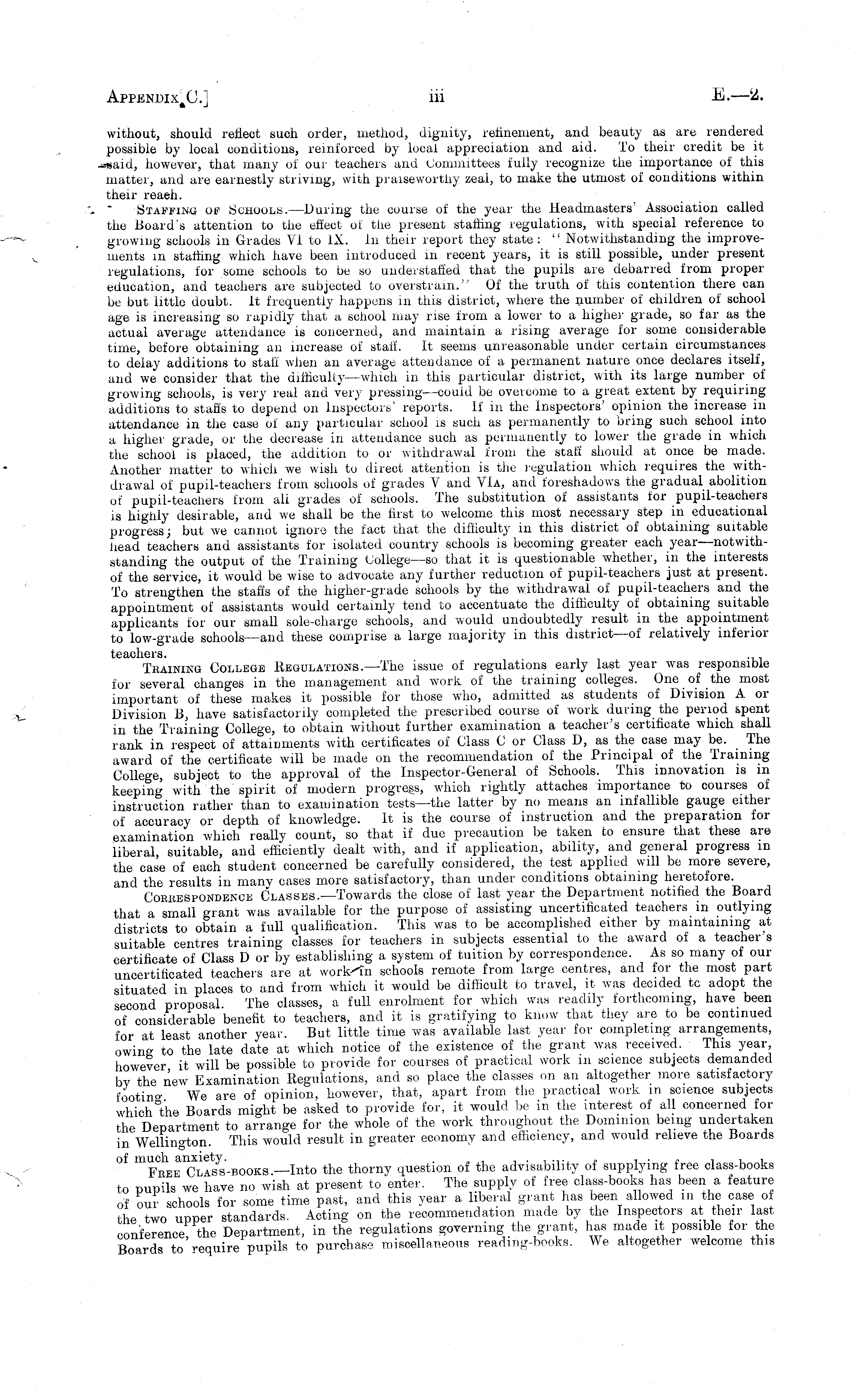 without, should reflect such order, method, dignity, refinement, and beauty as are rendered possible by local conditions, reinforced by local appreciation and aid. To their credit be it ~-i*aid, however, that many of our teachers and Committees fully recognize the importance of this matter, and are earnestly striving, with praiseworthy zeal, to make the utmost of conditions within their reach. Staffing of Schools. —During the course of the year the Headmasters' Association called the Board's attention to the effect of the present staffing regulations, with special reference to growing schools in Grades VI to IX. In their report they state: " Notwithstanding the improvements in staffing which have been introduced in recent years, it is still possible, under present regulations, for some schools to be so understaffed that the pupils are debarred from proper education, and teachers are subjected to overstrain." Of the truth of this contention there can be but little doubt. It frequently happens in this district, where the number of children of school age is increasing so rapidly that a school may rise from a lower to a higher grade, so far as the actual average attendance is concerned, and maintain a rising average for some considerable time, before obtaining an increase of stall. It seems unreasonable under certain circumstances to delay additions to stall when an average attendance of a permanent nature once declares itself, and we consider that the difficulty—which in this particular district, with its large number of growing schools, is very real and very pressing—could be overcome to a great extent by requiring additions to staffs to depend on Inspectors' reports. If in the Inspectors' opinion the increase in attendance in the case of any particular school is such as permanently to bring such school into a higher grade, or the decrease in attendance such as permanently to lower the grade in which the school is placed, the addition to or withdrawal from the staff should at once be made. Another matter to which we wish to direct attention, is the regulation which requires the withdrawal of pupil-teachers from schools of grades V and Vla, and foreshadows the gradual abolition ot pupil-teachers from all grades of schools. The substitution of assistants for pupil-teachers is highly desirable, and we shall be the first to welcome this most necessary step in educational progress; but we cannot ignore the tact that the difficulty in this district of obtaining suitable head teachers and assistants for isolated country schools is becoming greater each year—notwithstanding the output of the Training College—so that it is questionable whether, in the interests of the service, it would be wise to advocate any further reduction of pupil-teachers just at present. To strengthen the staffs of the higher-grade schools by the withdrawal of pupil-teachers and the appointment of assistants would certainly tend to accentuate the difficulty of obtaining suitable applicants for our small sole-charge schools, and would undoubtedly result in the appointment to low-grade schools—and. these comprise a large majority in this district—of relatively inferior ijGSiCIIGI'S Training College Regulations.—The issue of regulations early last year was responsible for several changes in the management and work of the training colleges. One of the most important of these makes it possible for those who, admitted as students of Division A or Division B, have satisfactorily completed the prescribed course of work during the period spent in the Training College, to obtain without further examination a teacher's certificate which shall rank in respect of attainments with certificates of Class Cor Class D, as the case may be. The award of the certificate will be made on the recommendation of the Principal of the Training College, subject to the approval of the Inspector-General of Schools. This innovation is in keeping with the spirit of modern progress, which rightly attaches importance to courses of instruction rather than to examination tests—the latter by no means an infallible gauge either of accuracy or depth of knowledge. It is the course of instruction and the preparation for examination which really count, so that if due precaution be taken to ensure that these are liberal suitable, and efficiently dealt with, and if application, ability, and general progress in the case of each student concerned be carefully considered, the test applied will be more severe, and the results in many cases more satisfactory, than under conditions obtaining heretofore. Correspondence Classes.—Towards the close of last year the Department notified the Board that a small grant was available for the purpose of assisting uncertificated teachers in outlying districts to obtain a full qualification. This was to be accomplished either by maintaining at suitable centres training classes for teachers in subjects essential to the award of a teacher's certificate of Class Dor by establishing a system of tuition by correspondence. As so many of our uncertificated teachers are at work-in schools remote from large centres, and for the most part situated in places to and from which it would be difficult to travel, it was decided tc adopt the second proposal. The classes, a full enrolment for which was readily forthcoming, have been of considerable benefit to teachers, and it is gratifying to know that they are to be continued for at least another year. But little time was available last year for completing arrangements, owing to the late date at which notice of the existence of the grant was received. This year however it will be possible to provide for courses of practical work in science subjects demanded by the new Examination Regulations, and so place the classes on an altogether more satisfactory footing We are of opinion, however, that, apart from the practical work in science subjects which the Boards might be asked to provide f