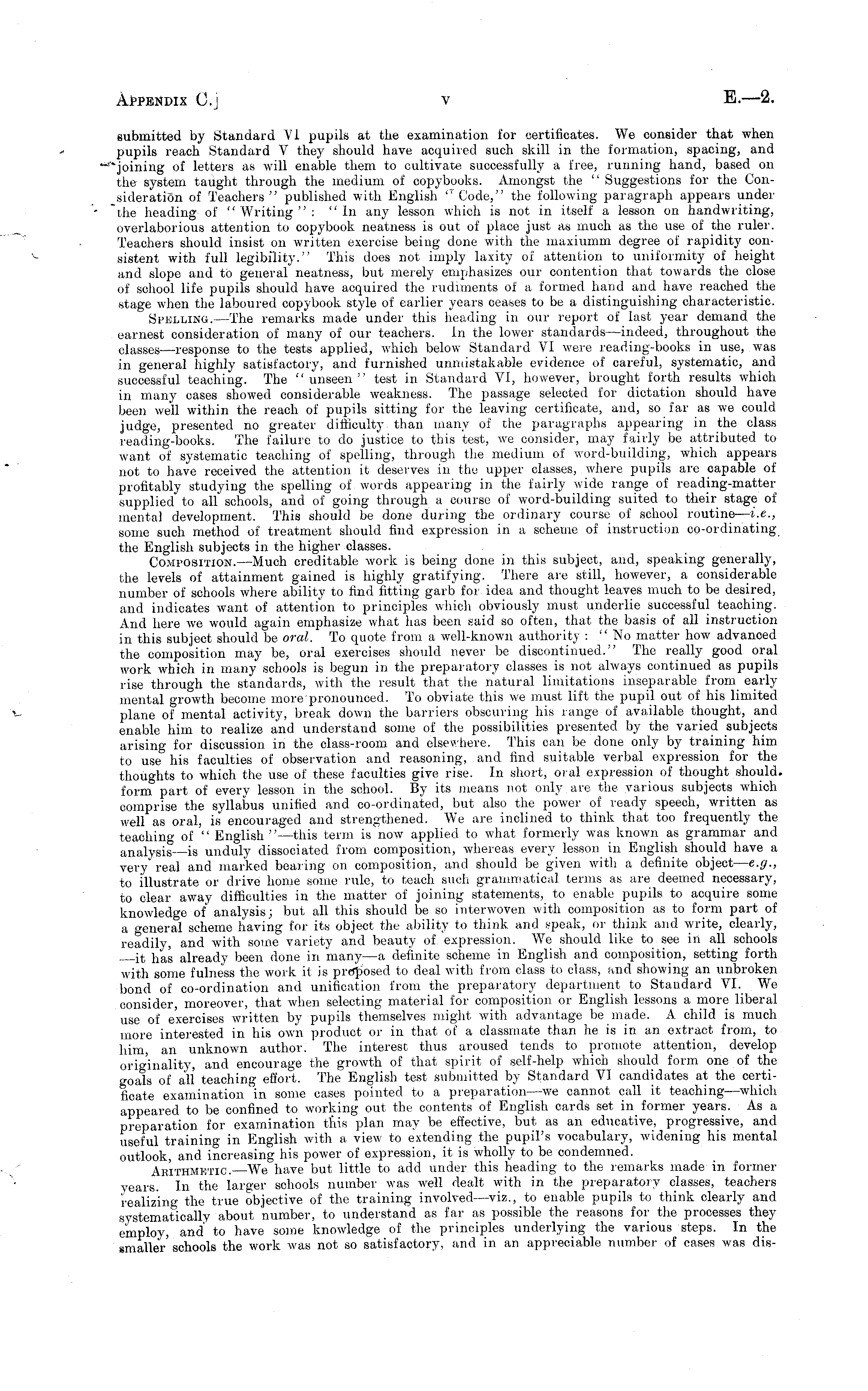 submitted by Standard VI pupils at the examination for certificates. We consider that when pupils reach Standard V they should have acquired such skill in the formation, spacing, and joining of letters as will enable them to cultivate successfully a free, running hand, based on the system taught through the medium of copybooks. Amongst the " Suggestions for the Consideration of Teachers" published with English " Code," the following paragraph appears under the heading of "Writing": "In any lesson which is not in itself a lesson on handwriting, overlaborious attention to copybook neatness is out of place just as much as the use of the ruler. Teachers should insist on written exercise being done with the maxiumm degree of rapidity consistent with full legibility." This does not imply laxity of attention to uniformity of height and slope and to general neatness, but merely emphasizes our contention that towards the close of school life pupils should have acquired the rudiments of a formed hand and have reached the stage when the laboured copybook style of earlier years ceases to be a distinguishing characteristic. Spelling.—The remarks made under this heading in our report of last year demand the earnest consideration of many of our teachers. In the lower standards —indeed, throughout the classes —response to the tests applied, which below Standard VI were reading-books in use, was in general highly satisfactory, and furnished unmistakable evidence of careful, systematic, and successful teaching. The "unseen" test in Standard VI, however, brought forth results which in many cases showed considerable weakness. The passage selected for dictation should have been we'll within the reach of pupils sitting for the leaving certificate, and, so far as we could judge, presented no greater difficulty than many of the paragraphs appearing in the class reading-books. The failure to do justice to this test, we consider, may fairly be attributed to want of systematic teaching of spelling, through the medium of word-building, which appears not to have received the attention it deserves in the upper classes, where pupils are capable of profitably studying the spelling of words appearing in the fairly wide range of reading-matter supplied to all schools, and of going through a course of word-building suited to their stage of mental development. This should be done during the ordinary course of school routine — i.e., some such method of treatment should find expression in a scheme of instruction co-ordinating the English subjects in the higher classes. Composition.—Much creditable work is being done in this subject, and, speaking generally, the levels of attainment gained is highly gratifying. There are still, however, a considerable number of schools where ability to find fitting garb for idea and thought leaves much to be desired, and indicates want of attention to principles which obviously must underlie successful teaching. And here we would again emphasize what has been said so often, that the basis of all instruction in this subject should be oral. To quote from a well-known authority : "No matter how advanced the composition may be, oral exercises should never be discontinued." The really good oral work which in many schools is begun in the preparatory classes is not always continued as pupils rise through the standards, with the result that the natural limitations inseparable from early mental growth become more pronounced. To obviate this we must lift the pupil out of his limited plane of mental activity, break down the barriers obscuring his range of available thought, and enable him to realize and understand some of the possibilities presented by the varied subjects arising for discussion in the class-room and elsewhere. This can be done only by training him to use his faculties of observation and reasoning, and find suitable verbal expression for the thoughts to which the use of these faculties give rise. In short, oral expression of thought should, form part of every lesson in the school. By its means not only are the various subjects which comprise the syllabus unified and co-ordinated, but also the power of ready speech, written as well as oral, is encouraged and strengthened. We are inclined to think that too frequently the teaching of " English" —this term is now applied to what formerly was known as grammar and analysis is unduly dissociated from composition, whereas every lesson in English should have a very real and marked bearing on composition, and should be given with a definite object— e.g., to illustrate or drive home some rule, to teach such grammatical terms as are deemed necessary, to clear away difficulties in the matter of joining statements, to enable pupils to acquire some knowledge of analysis; but all this should be so interwoven with composition as to form part of a general scheme having for its object the ability to think and speak, or think and write, clearly, readily, and with some variety and beauty of expression. We should like to see in all schools —it has already been done in many —a definite scheme in English and composition, setting forth with some fulness the work it is proposed to deal with from class to class, and showing an unbroken bond of co-ordination and unification from the preparatory department to Standard VI. We consider, moreover, that when selecting material for composition or English lessons a more liberal use of exercises written by pupils themselves might with advantage be made. A child is much more interested in his own product or in that of a classmate than he is in an extract from, to him, an unknown author. The interest thus aroused tends to promote attention, develop originality, and encourage the growth of that spirit of self-help which should form one of the goals of all teaching effort. The English test submitted by Standard VI candidates at the certificate examination in some cases pointed to a preparation—we cannot cal