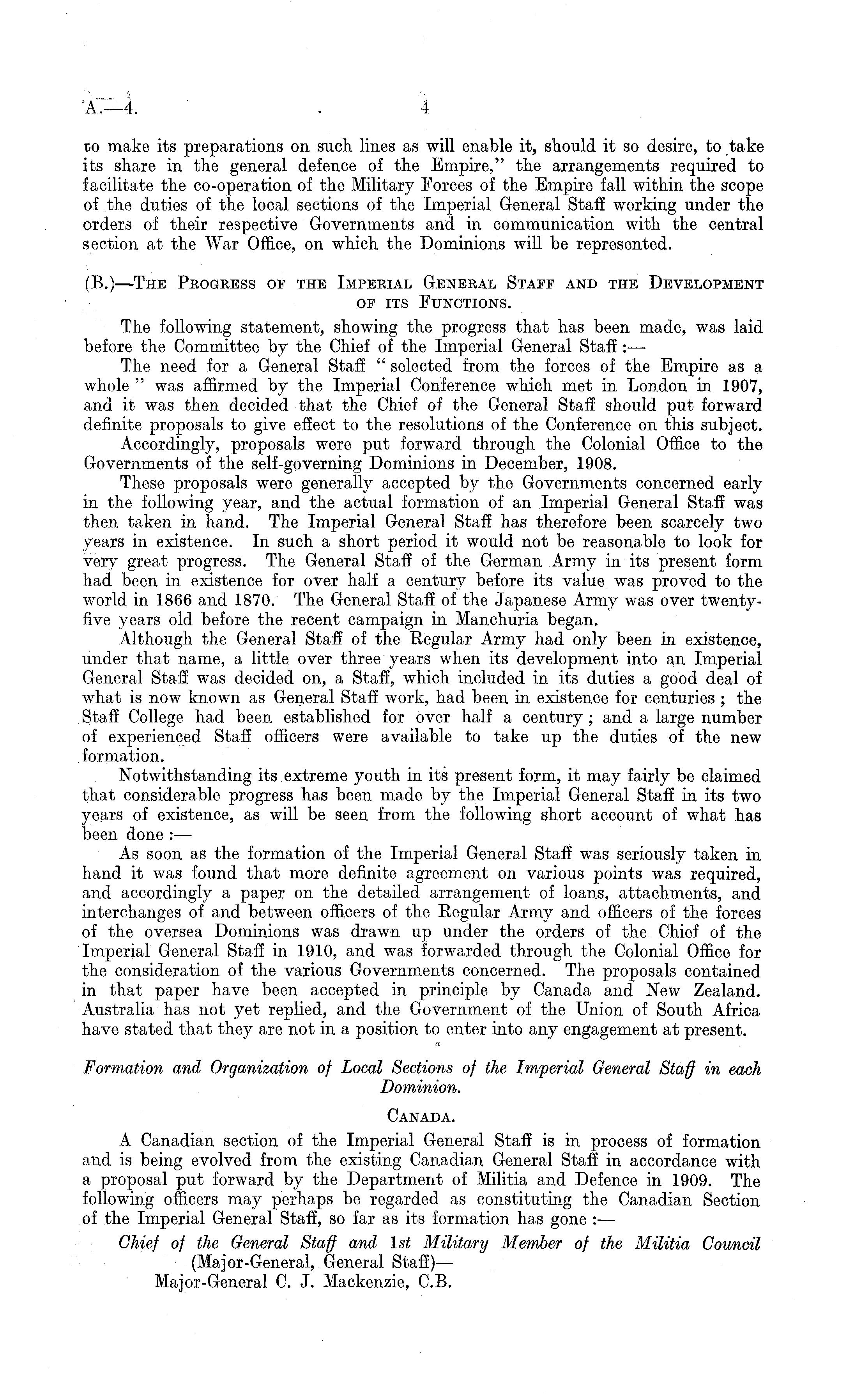 to make its preparations on such lines as will enable it, should it so desire, to take its share in the general defence of the Empire," the arrangements required to facilitate the co-operation of the Military Forces of the Empire fall within the scope of the duties of the local sections of the Imperial General Staff working under the orders of their respective Governments and in communication with the central section at the War Office, on which the Dominions will be represented. (B.) —The Progress op the Imperial General Staff and the Development of its Functions. The following statement, showing the progress that has been made, was laid before the Committee by the Chief of the Imperial General Staff:— The need for a General Staff " selected from the forces of the Empire as a whole " was affirmed by the Imperial Conference which met in London in 1907, and it was then decided that the Chief of the General Staff should put forward definite proposals to give effect to the resolutions of the Conference on this subject. Accordingly, proposals were put forward through the Colonial Office to the Governments of the self-governing Dominions in December, 1908. These proposals were generally accepted by the Governments concerned early in the following year, and the actual formation of an Imperial General Staff was then taken in hand. The Imperial General Staff has therefore been scarcely two years in existence. In such a short period it would not be reasonable to look for very great progress. The General Staff of the German Army in its present form had been in existence for over half a century before its value was proved to the world in 1866 and 1870. The General Staff of the Japanese Army was over twentyfive years old before the recent campaign in Manchuria began. Although the General Staff of the Kegular Army had only been in existence, under that name, a little over three years when its development into an Imperial General Staff was decided on, a Staff, which included in its duties a good deal of what is now known as General Staff work, had been in existence for centuries ; the Staff College had been established for over half a century ; and a large number of experienced Staff officers were available to take up the duties of the new formation. Notwithstanding its extreme youth in its present form, it may fairly be claimed that considerable progress has been made by the Imperial General Staff in its two years of existence, as will be seen from the following short account of what has been done :— As soon as the formation of the Imperial General Staff was seriously taken in hand it was found that more definite agreement on various points was required, and accordingly a paper on the detailed arrangement of loans, attachments, and interchanges of and between officers of the Regular Army and officers of the forces of the oversea Dominions was drawn up under the orders of the Chief of the Imperial General Staff in 1910, and was forwarded through the Colonial Office for the consideration of the various Governments concerned. The proposals contained in that paper have been accepted in principle by Canada and New Zealand. Australia has not yet replied, and the Government of the Union of South Africa have stated that they are not in a position to enter into any engagement at present. Formation and Organization of Local Sections of the Imperial General Staff in each Dominion. Canada. A Canadian section of the Imperial General Staff is in process of formation and is being evolved from the existing Canadian General Staff in accordance with a proposal put forward by the Department of Militia and Defence in 1909. The following officers may perhaps be regarded as constituting the Canadian Section of the Imperial General Staff, so far as its formation has gone : — Chief of the General Staff and Ist Military Member of the Militia Council (Major-General, General Staff) — Major-General C. J. Mackenzie, C.B.