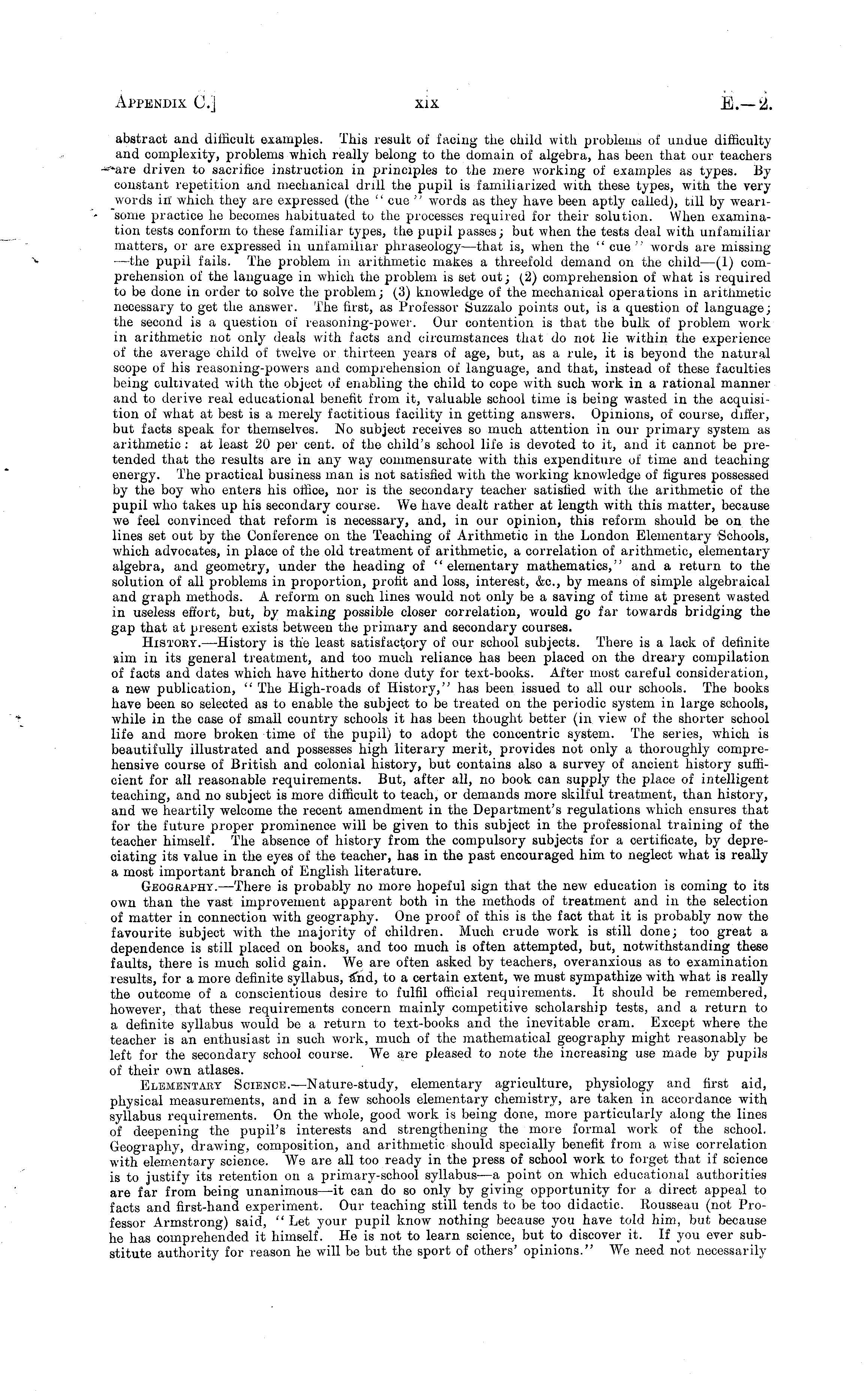 abstract and difficult examples. This result of facing the child with problems of undue difficulty and complexity, problems which really belong to the domain of algebra, has been that our teachers •"•are driven to sacrifice instruction in principles to the mere working of examples as types. By constant repetition and mechanical drill the pupil is familiarized with these types, with the very words in which they are expressed (the '' cue '' words as they have been aptly called), till by wearisome practice he becomes habituated to the processes required for their solution. When examination tests conform to these familiar types, the pupil passes; but when the tests deal with unfamiliar matters, or are expressed in unfamiliar phraseology—that is, when the " cue " words are missing —the pupil fails. The problem in arithmetic makes a threefold demand on the child —(1) comprehension of the language in which the problem is set out; (2) comprehension of what is required to be done in order to solve the problem; (3) knowledge of the mechanical operations in arithmetic necessary to get the answer. The first, as Professor Suzzalo points out, is a question of language; the second is a question of reasoning-power. Our contention is that the bulk of problem work in arithmetic not only deals with facts and circumstances that do not lie within the experience of the average child of twelve or thirteen years of age, but, as a rule, it is beyond the natural scope of his reasoning-powers and comprehension of language, and that, instead of these faculties being cultivated with the object of enabling the child to cope with such work in a rational manner and to derive real educational benefit from it, valuable school time is being wasted in the acquisition of what at best is a merely factitious facility in getting answers. Opinions, of course, differ, but facts speak for themselves. No subject receives so much attention in our primary system as arithmetic : at least 20 per cent, of the child's school life is devoted to it, and it cannot be pretended that the results are in any way commensurate with this expenditure of time and teachingenergy. The practical business man is not satisfied with the working knowledge of figures possessed by the boy who enters his office, nor is the secondary teacher satisfied with the arithmetic of the pupil who takes up his secondary course. We have dealt rather at length with this matter, because we feel convinced that reform is necessary, and, in our opinion, this reform should be on the lines set out by the Conference on the Teaching of Arithmetic in the London Elementary Schools, which advocates, in place of the old treatment of arithmetic, a correlation of arithmetic, elementary algebra, and geometry, under the heading of " elementary mathematics," and a return to the solution of all problems in proportion, profit and loss, interest, &c, by means of simple algebraical and graph methods. A reform on such lines would not only be a saving of time at present wasted in useless effort, but, by making possible closer correlation, would go far towards bridging the gap that at present exists between the primary and secondary courses. History.—History is the least satisfactory of our school subjects. There is a lack of definite aim in its general treatment, and too much reliance has been placed on the dreary compilation of facts and dates which have hitherto done duty for text-books. After most careful consideration, a new publication, " The High-roads of History," has been issued to all our schools. The books have been so selected as to enable the subject to be treated on the periodic system in large schools, while in the case of small country schools it has been thought better (in view of the shorter school life and more broken time of the pupil) to adopt the concentric system. The series, which is beautifully illustrated and possesses high literary merit, provides not only a thoroughly comprehensive course of British and colonial history, but contains also a survey of ancient history sufficient for all reasonable requirements. But, after all, no book can supply the place of intelligent teaching, and no subject is more difficult to teach, or demands more skilful treatment, than history, and we heartily welcome the recent amendment in the Department's regulations which ensures that for the future proper prominence will be given to this subject in the professional training of the teacher himself. The absence of history from the compulsory subjects for a certificate, by depreciating its value in the eyes of the teacher, has in the past encouraged him to neglect what is really a most important branch of English literature. Geography.—There is probably no more hopeful sign that the new education is coming to its own than the vast improvement apparent both in the methods of treatment and in the selection of matter in connection with geography. One proof of this is the fact that it is probably now the favourite subject with the majority of children. Much crude work is still done; too great a dependence is still placed on books, and too much is often attempted, but, notwithstanding these faults, there is much solid gain. We are often asked by teachers, overanxious as to examination results, for a more definite syllabus, And, to a certain extent, we must sympathize with what is really the outcome of a conscientious desire to fulfil official requirements. It should be remembered, however, that these requirements concern mainly competitive scholarship tests, and a return to a definite syllabus would be a return to text-books and the inevitable cram. Except where the teacher is an enthusiast in such work, much of the mathematical geography might reasonably be left for the secondary school course. We are pleased to note the increasing use made by pupils of their own atlases. Elementary Science.—Nature-study, elementary agriculture, physiology and first aid, physical measurements, an