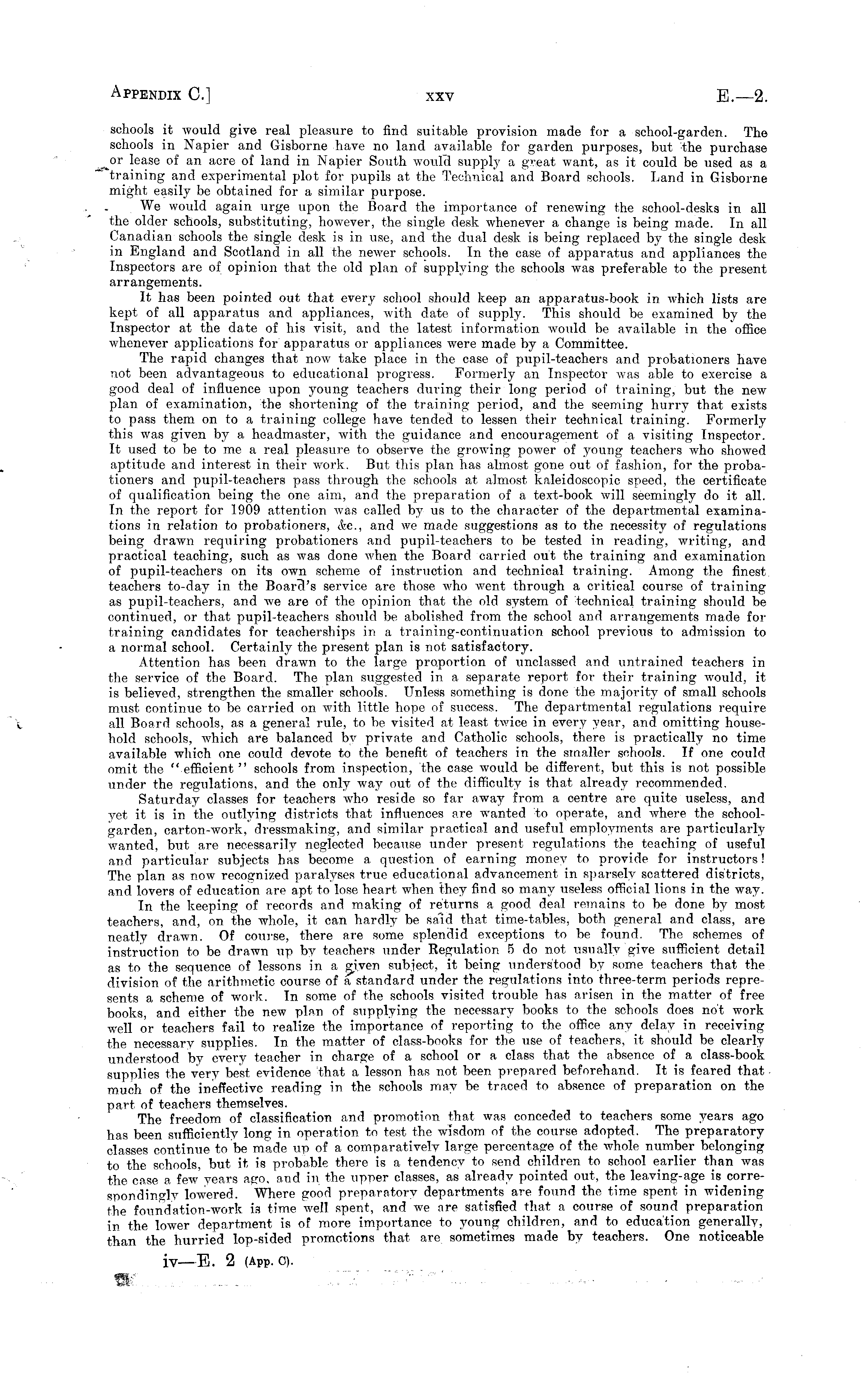 schools it would give real pleasure to find suitable provision made for a school-garden. The schools in Napier and Gisborne have no land available for garden purposes, but the purchase lease of an acre of land in Napier South would supply a great want, as it could be used as a 'training and experimental plot for pupils at the Technical and Board schools. Land in Gisborne might easily be obtained for a similar purpose. We would again urge upon the Board the importance of renewing the school-desks in all the older schools, substituting, however, the single desk whenever a change is being made. In all Canadian schools the single desk is in use, and the dual desk is being replaced by the single desk in England and Scotland in all the newer schools. In the case of apparatus and appliances the Inspectors are of opinion that the old plan of supplying the schools was preferable to the present arrangements. It has been pointed out that every school should keep an apparatus-book in which lists are kept of all apparatus and appliances, with date of supply. This should be examined by the Inspector at the date of his visit, and the latest information would be available in the office whenever applications for apparatus or appliances were made by a Committee. The rapid changes that now take place in the case of pupil-teachers and probationers have not been advantageous to educational progress. Formerly an Inspector was able to exercise a good deal of influence upon young teachers during their long period of training, but the new plan of examination, the shortening of the training period, and the seeming hurry that exists to pass them on to a training college have tended to lessen their technical training. Formerly this was given by a headmaster, with the guidance and encouragement of a visiting Inspector. It used to be to me a real pleasure to observe the growing power of young teachers who showed aptitude and interest in their work. But this plan has almost gone out of fashion, for the probationers and pupil-teachers pass through the schools at almost kaleidoscopic speed, the certificate of qualification being the one aim, and the preparation of a text-book will seemingly do it all. In the report for 1909 attention was called by T us to the character of the departmental examinations in relation to probationers, &c, and we made suggestions as to the necessity of regulations being drawn requiring probationers and pupil-teachers to be tested in reading, writing, and practical teaching, such as was done when the Board carried out the training and examination of pupil-teachers on its own scheme of instruction and technical training. Among the finest teachers to-day in the Board's service are those who went through a critical course of training as pupil-teachers, and we are of the opinion that the old system of technical training should be continued, or that pupil-teachers should be abolished from the school and arrangements made for training candidates for teacherships in a training-continuation school previous to admission to a normal school. Certainly the present plan is not satisfactory. Attention has been drawn to the large proportion of unclassed and untrained teachers in the service of the Board. The plan suggested in a separate report for their training would, it is believed, strengthen the smaller schools. Unless something is done the majority of small schools must continue to be carried on with little hope of success. The departmental regulations require all Board schools, as a general rule, to be visited at least twice in every year, and omitting household schools, which are balanced by private and Catholic schools, there is practically no time available which one could devote to the benefit of teachers in the smaller schools. If one could omit the "efficient " schools from inspection, the case would be different, but this is not possible under the regulations, and the only way out of the difficulty is that already recommended. Saturday classes for teachers who reside so far away from a centre are quite useless, and yet it is in the outlying districts that influences are wanted to operate, and where the schoolgarden, carton-work, dressmaking, and similar practical and useful employments are particularly wanted, but are necessarily neglected because under present regulations the teaching of useful and particular subjects has become a question of earning money to provide for instructors! The plan as now recognized paralyses true educational advancement in sparsely scattered districts, and lovers of education are apt to lose heart when they find so many useless official lions in the way. In the keeping of records and making of returns a good deal remains to be done by most teachers, and, on the whole, it can hardly be said that time-tables, both general and class, are neatly drawn. Of course, there are some splendid exceptions to be found. The schemes of instruction to be drawn up by teachers under Regulation 5 do not usually give sufficient detail as to the sequence of lessons in a given subject, it being understood by some teachers that the division of the arithmetic course of a standard under the regulations into three-term periods represents a scheme of work. In some of the schools visited trouble has arisen in the matter of free books, and either the new plan of supplying the necessary books to the schools does not work well or teachers fail to realize the importance of reporting to the office any delay in receiving the necessary supplies. In the matter of class-books for the use of teachers, it should be clearly understood by every teacher in charge of a school or a class that the absence of a class-book supplies the very best evidence that a lesson has not been prepared beforehand. It is feared that much of the ineffective reading in the schools may be traced to absence of preparation on the part of teachers themselves. The freedom of classification and promotion that was conceded to teachers