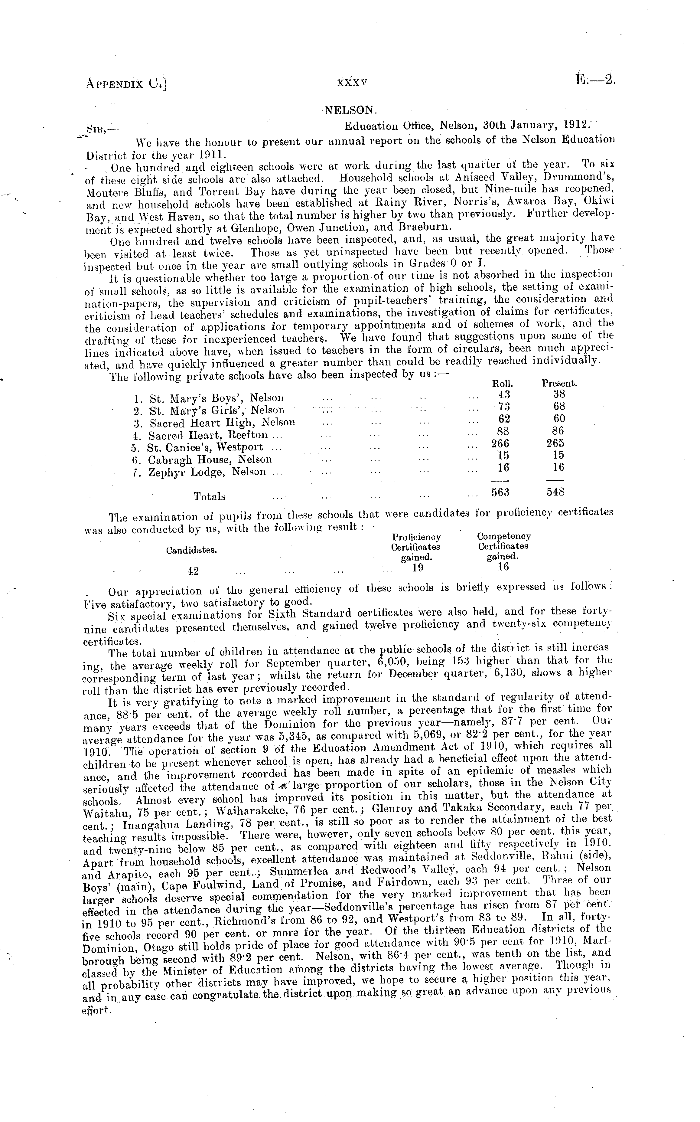 NELSON. y IK _ Education Office, Nelson, 30th January, 1912. We have the honour to present our annual report on the schools of the Nelson Education District for the year 1911. . One hundred and eighteen schools were at work during the last quarter ot the year. Io six of these eight side schools are also attached. Household schools at Aniseed Valley, Drummond's, Moutere Bluffs, and Torrent Bay have during the year been closed, but Nine-mile has reopened, and new household schools have been established at Rainy River, Norris's, Awaroa Bay, Okiwi Bay, and West Haven, so that the total number is higher by two than previously. Further development is expected shortly at Glenhope, Owen Junction, and Braeburn. One hundred and twelve schools have been inspected, and, as usual, the great majority have been visited at least twice. Those as yet uninspected have been but recently opened. Those inspected but once in the year are small outlying schools in Grades 0 or I. It is questionable whether too large a proportion of our time is not absorbed in the inspection of small schools, as so little is available for the examination of high schools, the setting of exami-nation-papers, the supervision and criticism of pupil-teachers' training, the consideration and criticism of head teachers' schedules and examinations, the investigation of claims for certificates, the consideration of applications for temporary appointments and of schemes of work, and the drafting of these for inexperienced teachers. We have found that suggestions upon some of the lines indicated above have, when issued to teachers in the form of circulars, been much appreciated, and have quickly influenced a greater number than could be readily reached individually. 'The following private schools have also been inspected by us : — ° r Roll. Present. 1. St. Mary's Boys', Nelson ... •• ••• 13 38 2. St. Mary's Girls', Nelson ..: ... ■■ •■• 73 b8 3. Sacred Heart High, Nelson 62 bO 4. Sacred Heart, Reef ton... ... •■• »8 8b 5. St. Canice's, Westport ... ... ... ••• •• -266 265 6. Cabragh House, Nelson ... ■■• ■■• Jjj 7. Zephyr Lodge, Nelson ... ••■ ■■■ ■•- '" __ Totals ... -. 563 548 The examination of pupils from these schools that were candidates for proficiency certificates was also conducted by us, with the following result :— Proficiency Competency Candidates. Certificates Certificates gained. gamed. 42 ... ■■■ ™ 16 Our appreciation of the general efficiency of these schools is briefly expressed as follows : Five satisfactory, two satisfactory to good. Six special examinations for Sixth Standard certificates were also held, and tor these fortynine candidates presented themselves, and gained twelve proficiency and twenty-six competencycertificates. , ~. , , ... ,'.• '. , . ..,, • The total number of children in attendance at the public schools of the district is still increasing the average weekly roll for September quarter, 6,050, being 153 higher than that for the corresponding term of "last year; whilst the return for December quarter, 6,130, shows a higher roll than the district has ever previously recorded. It is very gratifying to note a marked improvement in the standard ot regularity ot attendance 88-5 per cent, of the average weekly roll number, a percentage that for the first time for many years exceeds that of the Dominion for the previous year—namely, 877 per cent Our average attendance for the year was 5,345, as compared with 5,069 or 82"2 per cent for the year 1910 The operation of section 9of the Education Amendment Act of 1910, which requires all children to be present whenever school is open, has already had a beneficial effect upon the attendance and the improvement recorded has been made in spite of an epidemic o meases which seriously affected the attendance of •«* large proportion of our scholars, those the Nelson City schools. Almost every school has improved its position in this matter, but the attendance at Waitahu 75 per cent.; Waiharakeke, 76 per cent.; Glenroy and Takaka Secondary, each 77 per. cent ; Inangahua Landing, 78 per cent., is still so poor as to render the attainment of the best teaching results impossible. There were, however, only seven schools below 80 per cent this year, and twenty-nine below 85 per cent., as compared with eighteen and fifty respectively in 1910. Apart from household schools, excellent attendance was maintained at Seddonville, Rahui (side), and Arapito, each 95 per cent..; Summerlea and Redwood's Valley, each 94 per cent.; Nelson Boys' (main , Cape Foulwind, Land of Promise, and Fairdown, each 93 per cent. Three of our larger schools deserve special commendation for the very marked improvement that has been effected in the attendance during the year-Seddonville's percentage has risen from 87 per cent, in 1910 to 95 per cent., Richmond's from 86 to 92, and Westport's from 83 to 89. In all, fortyfive schools record 90 per cent, or more for the year. Of the thirteen Education districts of the Domnion Ot go still holds pride of place for good attendance with 905 per cent for 1910 Marl£,rou°h being Second with 892 per cent. Nelson, with 864 per cent was tenth on the list and classed by the Minister of Education among the districts having the lowest average. Though in all probability other districts may have improved, we hope to secure a higher position this year, and in any case can congratulate, the.district upon making so. great an advance upon any previous effort,