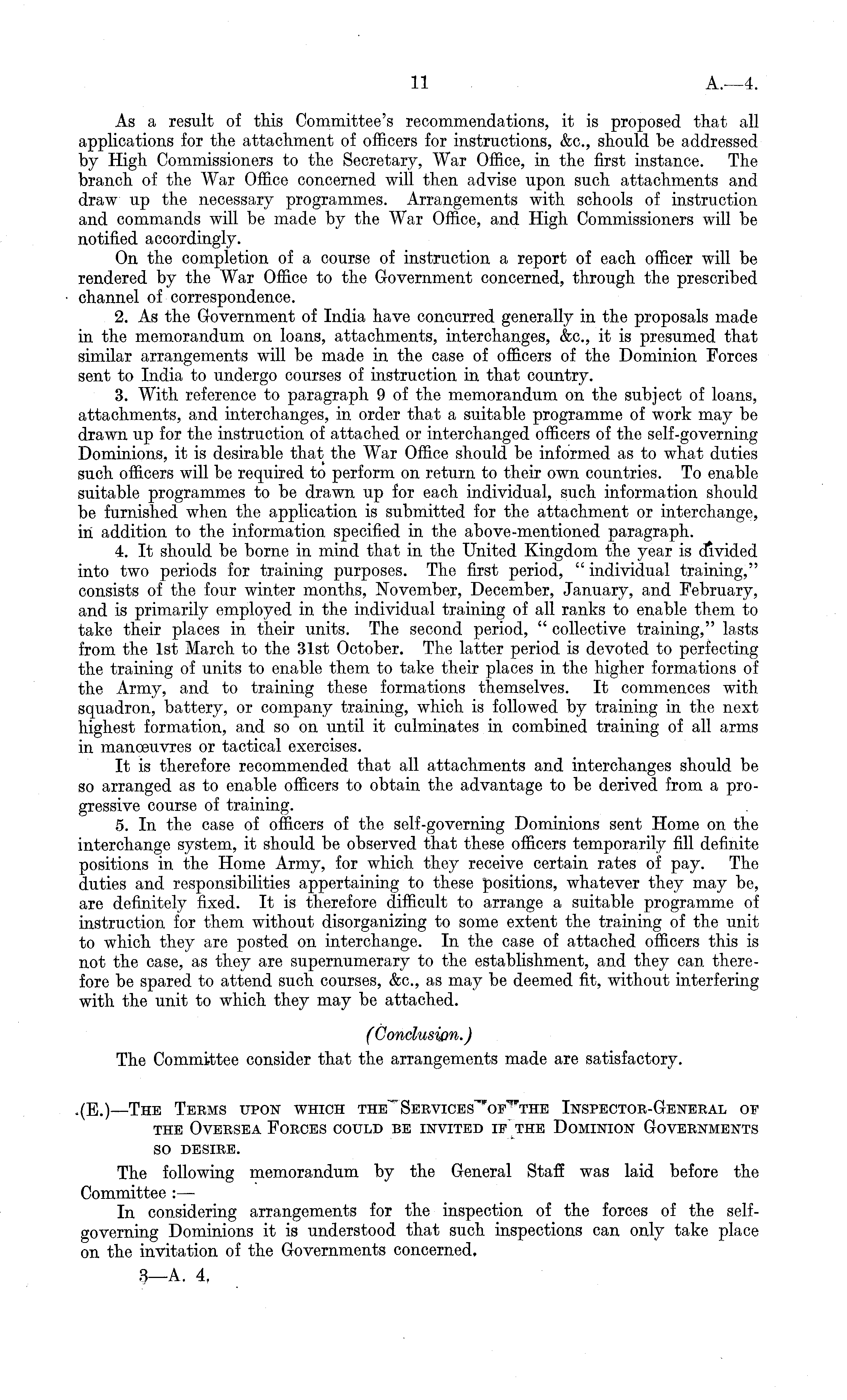 As a result of this Committee's recommendations, it is proposed that all applications for the attachment of officers for instructions, &c, should be addressed by High Commissioners to the Secretary, War Office, in the first instance. The branch of the War Office concerned will then advise upon such attachments and draw up the necessary programmes. Arrangements with schools of instruction and commands will be made by the War Office, and High Commissioners will be notified accordingly. On the completion of a course of instruction a report of each officer will be rendered by the War Office to the Government concerned, through the prescribed channel of correspondence. 2. As the Government of India have concurred generally in the proposals made in the memorandum on loans, attachments, interchanges, &c, it is presumed that similar arrangements will be made in the case of officers of the Dominion Forces sent to India to undergo courses of instruction in that country. 3. With reference to paragraph 9 of the memorandum on the subject of loans, attachments, and interchanges, in order that a suitable programme of work may be drawn up for the instruction of attached or interchanged officers of the self-governing Dominions, it is desirable that the War Office should be informed as to what duties such officers will be required to perform on return to their own countries. To enable suitable programmes to be drawn up for each individual, such information should be furnished when the application is submitted for the attachment or interchange, in addition to the information specified in the above-mentioned paragraph. 4. It should be borne in mind that in the United Kingdom the year is divided into two periods for training purposes. The first period, " individual training," consists of the four winter months, November, December, January, and February, and is primarily employed in the individual training of all ranks to enable them to take their places in their units. The second period, " collective training," lasts from the Ist March to the 31st October. The latter period is devoted to perfecting the training of units to enable them to take their places in the higher formations of the Army, and to training these formations themselves. It commences with squadron, battery, or company training, which is followed by training in the next highest formation, and so on until it culminates in combined training of all arms in manoeuvres or tactical exercises. It is therefore recommended that all attachments and interchanges should be so arranged as to enable officers to obtain the advantage to be derived from a progressive course of training. 5. In the case of officers of the self-governing Dominions sent Home on the interchange system, it should be observed that these officers temporarily fill definite positions in the Home Army, for which they receive certain rates of pay. The duties and responsibilities appertaining to these positions, whatever they may be, are definitely fixed. It is therefore difficult to arrange a suitable programme of instruction for them without disorganizing to some extent the training of the unit to which they are posted on interchange. In the case of attached officers this is not the case, as they are supernumerary to the establishment, and they can therefore be spared to attend such courses, &c, as may be deemed fit, without interfering with the unit to which they may be attached. (Conclusion.) The Committee consider that the arrangements made are satisfactory. ,(E.) —The Terms upon which Inspector-General of the Oversea Forces could be invited if the Dominion Governments so desire. The following memorandum by the General Staff was laid before the Committee : — In considering arrangements for the inspection of the forces of the selfgoverning Dominions it is understood that such inspections can only take place on the invitation of the Governments concerned.