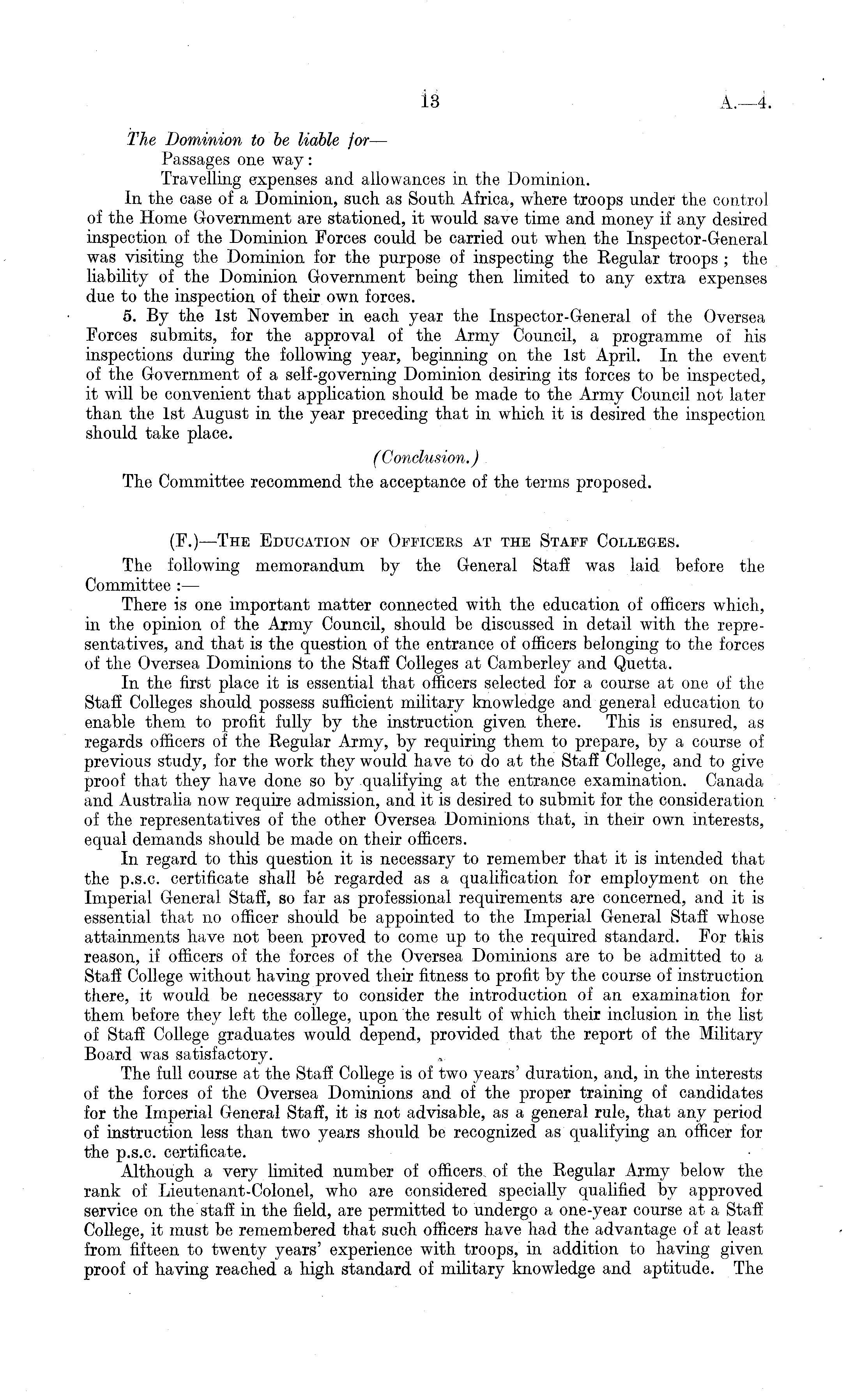 The Dominion to be liable for — Passages one way: Travelling expenses and allowances in the Dominion. In the case of a Dominion, such as South Africa, where troops under the control of the Home Government are stationed, it would save time and money if any desired inspection of the Dominion Forces could be carried out when the Inspector-General was visiting the Dominion for the purpose of inspecting the Regular troops ; the liability of the Dominion Government being then limited to any extra expenses due to the inspection of their own forces. 5. By the Ist November in each year the Inspector-General of the Oversea Forces submits, for the approval of the Army Council, a programme of his inspections during the following year, beginning on the Ist April. In the event of the Government of a self-governing Dominion desiring its forces to be inspected, it will be convenient that application should be made to the Army Council not later than the Ist August in the year preceding that in which it is desired the inspection should take place. (Conclusion.) The Committee recommend the acceptance of the terms proposed. (F.) —The Education of Officers at the Staff Colleges. The following memorandum by the General Staff was laid before the Committee : — There is one important matter connected with the education of officers which, in the opinion of the Army Council, should be discussed in detail with the representatives, and that is the question of the entrance of officers belonging to the forces of the Oversea Dominions to the Staff Colleges at Camberley and Quetta. In the first place it is essential that officers selected for a course at one of the Staff Colleges should possess sufficient military knowledge and general education to enable them to profit fully by the instruction given there. This is ensured, as regards officers of the Regular Army, by requiring them to prepare, by a course of previous study, for the work they would have to do at the Staff College, and to give proof that they have done so by qualifying at the entrance examination. Canada and Australia now require admission, and it is desired to submit for the consideration of the representatives of the other Oversea Dominions that, in their own interests, equal demands should be made on their officers. In regard to this question it is necessary to remember that it is intended that the p.s.c. certificate shall be regarded as a qualification for employment on the Imperial General Staff, so far as professional requirements are concerned, and it is essential that no officer should be appointed to the Imperial General Staff whose attainments have not been proved to come up to the required standard. For this reason, if officers of the forces of the Oversea Dominions are to be admitted to a Staff College without having proved their fitness to profit by the course of instruction there, it would be necessary to consider the introduction of an examination for them before they left the college, upon the result of which their inclusion in the list of Staff College graduates would depend, provided that the report of the Military Board was satisfactory. The full course at the Staff College is of two years' duration, and, in the interests of the forces of the Oversea Dominions and of the proper training of candidates for the Imperial General Staff, it is not advisable, as a general rule, that any period of instruction less than two years should be recognized as qualifying an officer for the p.s.c. certificate. Although a very limited number of officers of the Regular Army below the rank of Lieutenant-Colonel, who are considered specially qualified by approved service on the staff in the field, are permitted to undergo a one-year course at a Staff College, it must be remembered that such officers have had the advantage of at least from fifteen to twenty years' experience with troops, in addition to having given proof of having reached a high standard of military knowledge and aptitude. The