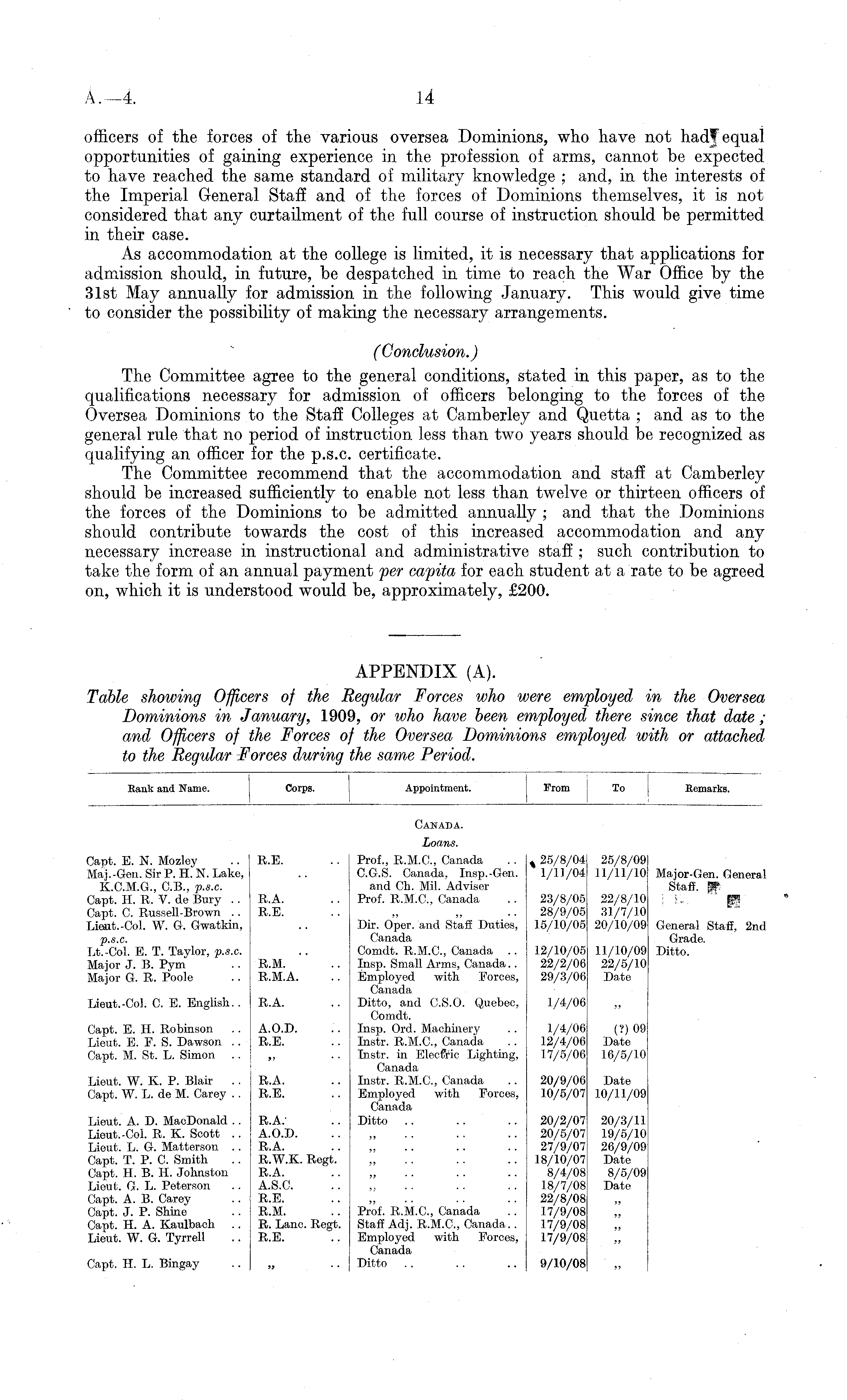 Hank and Name. Corps. Appointment. From To Eemarks. Canada. Loans. Capt. E. N. Mozley Maj.-Gen. Sir P. H. N. Lake, K.C.M.G., C.B., p.s.c. Capt. H. R. V. de Bury . . Capt. C. Russell-Brown .. Lieut.-Col. W. G. Gwatkin, p.s.c. Lt.-Col. E. T. Taylor, p.s.c. Major J. B. Pym Major G. R. Poole R.E. Prof., R.M.C., Canada C.G.S. Canada, Insp.-Gen. and Ch. Mil. Adviser Prof. R.M.C., Canada % 25/8/04 1/11/04 25/8/09 11/11/10 Major-Gen. General Staff. Pf. ■■ - ■ E.A. R.E. 23/8/05 28/9/05 15/10/05 22/8/10 31/7/10 20/10/09 Lieut.-Col. C. E. English. . Capt. E. H. Robinson Lieut. E. F. S. Dawson .. Capt. M. St. L. Simon R.M. R.M.A. R.A. A.O.D. R.E. Dir. Oper. and Staff Duties, Canada Comdt. R.M.C., Canada Insp. Small Arms, Canada.. Employed with Forces, Canada Ditto, and C.S.O. Quebec, Comdt. Insp. Ord. Machinery Instr. R.M.C., Canada Instr. in Elocfiric Lighting, Canada Instr. R.M.C., Canada Employed with Forces, Canada Ditto 12/10/05 22/2/06 29/3/06 1/4/06 1/4/06 12/4/06 17/5/06 11/10/09 22/5/10 Date (?) 09 Date 16/5/10 General Staff, 2nd Grade. Ditto. Lieut. W. K. P. Blair . . Capt. W. L. de M. Carey . . R.A. R.E. 20/9/06 10/5/07 Date 10/11/09 Lieut. A. D. MacDonald .. Lieut.-Col. R. K. Scott . . Lieut. L. G. Matterson .. Capt. T. P. C. Smith Capt. H. B. H. Johnston Lieut. Gγ. L. Peterson Capt. A. B. Carey Capt. J. P. Shine Capt. H. A. Kaulbach .. Lieut. W. G. Tyrrell R.A. A.O.D. R.A. R.W.K. Regt. R.A. A.S.C. R.E. R.M. R. Lane. Regt. R.E. 20/2/07 20/5/07 27/9/07 18/10/07 8/4/08 18/7/08 22/8/08 17/9/08 17/9/08 17/9/08 20/3/11 19/5/10 26/9/09 Date 8/5/09 Date Prof. R.M.C., Canada Staff Adj. R.M.C., Canada.. Employed with Forces, Canada Ditto Capt. H. L. Bingay )3 9/10/08