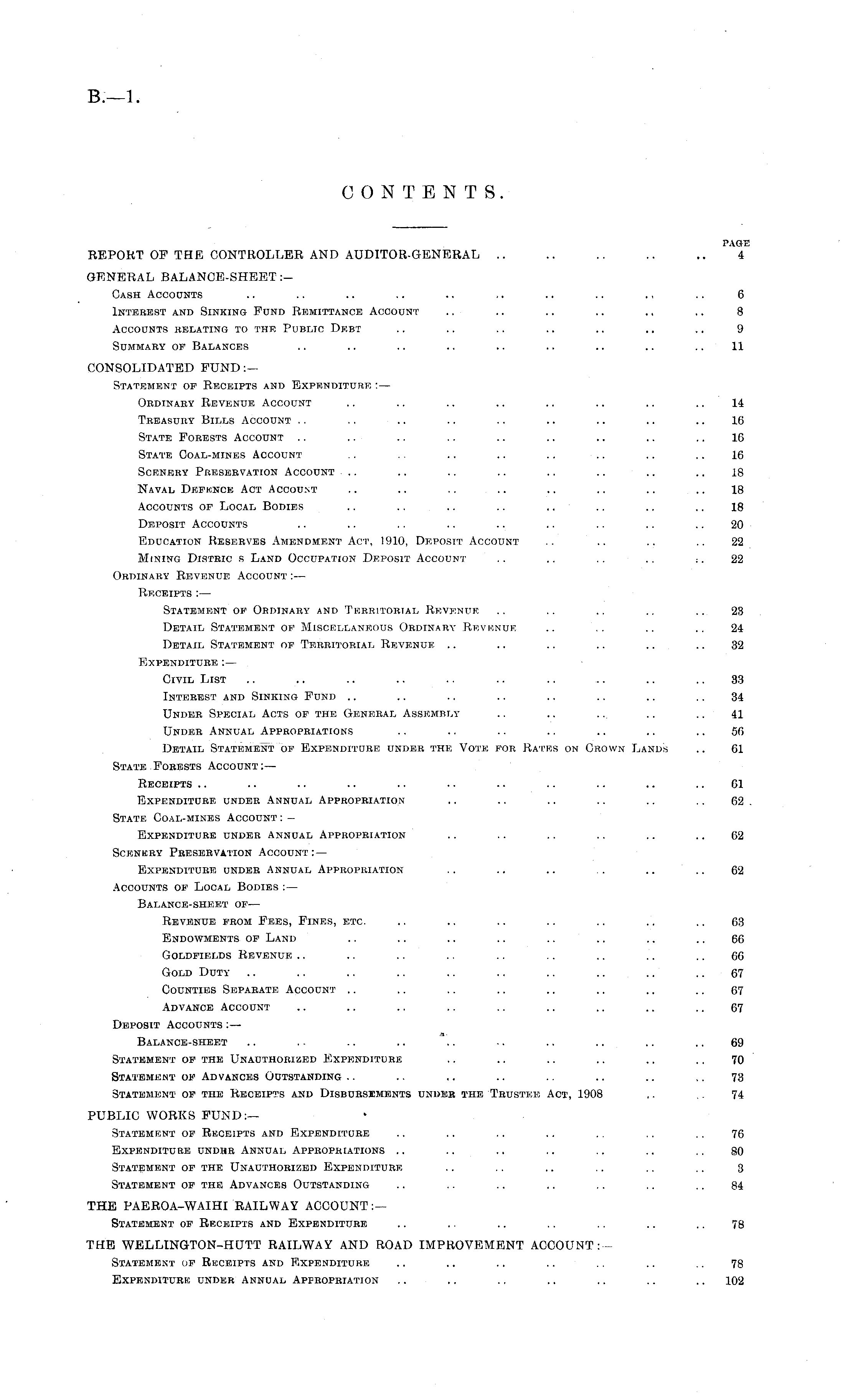 CONTENTS. PAG! REPORT OF THE CONTROLLER AND AUDITOR-GENERAL .. .. .. .. .. 4 GENERAL BALANCE-SHEET :- Gash Accounts .. .. .. .. .. .. .. .. .. .. 6 Intebest and Sinking Fund Remittance Account .. .. .. .. ~ ~ 8 Accounts belating to the Public Df.bt .. .. .. .. .. .. .. 9 summaby of balancks . . . . . . . . . . . . . . . . . . 11 CONSOLIDATED FUND:— Statement of Receipts and Expenditure :— Ordinary Revenue Account .. .. .. .. .. .. .. .. 14 Tbeasuby Bills Account .. .. .. .. .. .. .. .. .. 16 State Fobests Account .. .. .. .. .. .. .. .. .. 1G State Coal-mines Account .. .. .. .. .. .. .. .. 10 Scenery Preservation Account .. .. .. .. .. .. .. .. 18 Naval Defknce Act Account .. .. .. .. .. .. .. .. 18 Accounts of Local Bodies .. .. .. .. .. .. .. .. 18 Deposit Accounts .. .. .. .. .. .. .. .. .. 20 Education Resebves Amendment Act, 1910, Deposit Account .. .. .. .. 22 Mining Distbic s Land Occupation Deposit Account .. .. .. .. : . 22 Ordinary Revenue Account :— Receipts :— Statement of Ordinary and Territorial Revenue .. .. ~ .. .. 23 Detail Statement of Miscellaneous Ordinabv Revknuk .. .. .. .. 24 Detail Statement of Terbitorial Revenue .. .. .. .. .. .. 32 Expenditure :— Civil List .. .. .. .. .. .. .. .. .. .. 33 Interest and Sinking Fund .. .. .. .. .. .. .. .. 34 Undeb Special Acts of the General Assembly .. .. ... .. .. 41 Undeb Annual Appropriations .. .. .. .. .. .. .. 56 Detail Statement of Expenditure undeb the Vote for Rates on Crown Lands .. 61 State Fobests Account :— Receipts .. .. .. .. .. .. .. .. .. .. .. 61 expenditube under annual appropriation . . . . . . . . . . . . 62 State Coal-mines Account : — Expenditure under Annual Appropriation .. .. .. .. .. .. 62 Scenkby Preservation Account :— Expenditure under Annual Appropriation .. .. .. . . .. .. 62 Accounts of Local Bodies :— Balance-sheet of — Revenue from Fees, Fines, etc. .. .. .. .. .. .. .. 63 Endowments of Land .. .. .. .. .. .. .. .. 66 goldfields revenue . . . . . . . . . . . . . . . . . . 66 Gold Duty .. .. .. .. .. .. .. .. .. .. 67 Counties Separate Account .. .. .. .. .. .. .. .. 67 Advance Account .. .. .. .. .. .. .. .. .. 67 Deposit Accounts :—■ Balance-sheet .. .. .. .. .. .. .. .. .. .. 69 Statement of the Unauthorized Expenditure .. .. .. .. .. .. 70 Statement of Advances Outstanding .. .. .. .. .. .. .. ~ 73 Statement of the Receipts and Disbursements under the 'Trustee Act, 1908 ~ .. 74 PUBLIC WORKS FUND:— Statement of Receipts and Expenditure .. .. .. .. .. .. .. 76 Expenditure undhb Annual Appropriations .. .. .. .. .. .. .. 80 Statement of the Unauthorized Expenditure .. .. .. .. .. ~ 3 Statement of the Advances Outstanding .. .. .. .. .. .. .. 84 THE PAEROA-WAIHI RAILWAY ACCOUNT:— Statement of Receipts and Expenditure .. .. .. .. .. .. .. 78 THE WELLINGTON-HUTT RAILWAY AND ROAD IMPROVEMENT ACCOUNT :- Statement of Rbceipts and Expenditure .. .. .. .. .. .. .. 78 Expenditure under Annual Appropriation .. .. .. .. .. .. .. 102