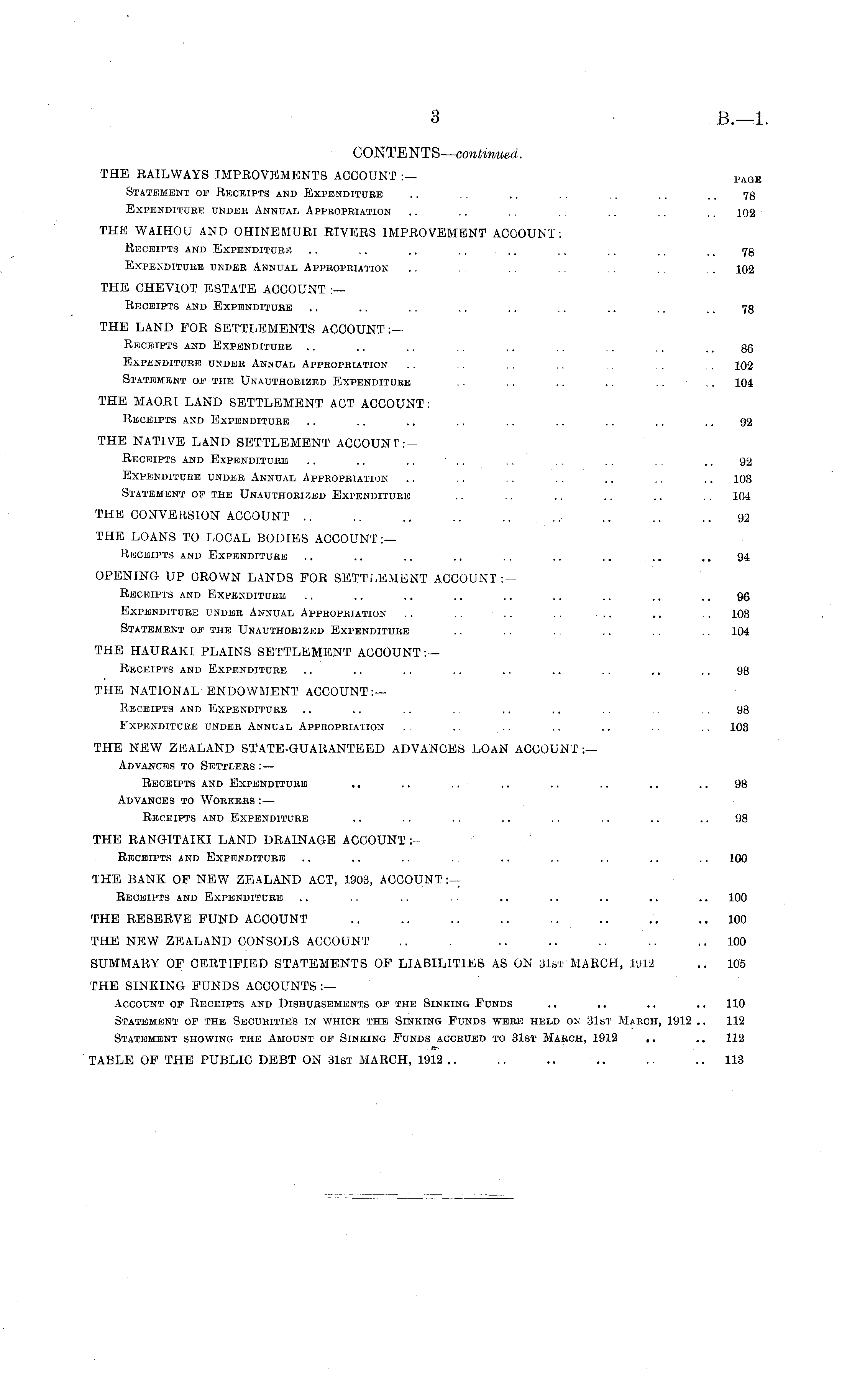 CONTENTS— continued, THE RAILWAYS IMPROVEMENTS ACCOUNT :— p AG] Statement of Receipts and Expenditure .. .. .. .. .. .. .. 78 expenditube under annual appropriation . . . . . . . . . . . . . . Iq2 THE WAIHOU AND OHINEMURI RIVERS IMPROVEMENT ACCOUNT: - Receipts and Expbnditubk .. .. .. .. .. .. .. .. ~ 78 expenditube under annual appropriation . . . . . . . . . . . 102 THE CHEVIOT ESTATE ACCOUNT :— Receipts and Expenditure .. .. .. .. .. .. 78 THE LAND FOR SETTLEMENTS ACCOUNT:— Receipts and Expenditure .. .. .. .. .. .. .. .. .. 86 Expenditure under Annual Appropriation .. .. .. .. .. .. .. 102 Statement of the Unauthorized Expenditure .. .. .. .. . . .. 104 THE MAORI LAND SETTLEMENT ACT ACCOUNT: Receipts and Expenditure .. .. .. .. .. .. .. .. .. 92 THE NATIVE LAND SETTLEMENT ACCOUNT:Receipts and Expenditure .. .. .. ■ .. .. . . ~ .. 92 Expenditure under Annual Appropriation .. .. .. .. .. .. .. 103 Statement of the Unauthorized Expenditure .. . .. .. .. . . 104 THK CONVERSION ACCOUNT .. .. .. .. .. '~... .. .. .. 92 THE LOANS TO LOCAL BODIES ACCOUNT :— Receipts and Expenditure .. .. .. .. .. .. .. .. ~ 94 OPENING UP CROWN LANDS FOR SETTLEMENT ACCOUNT: — Receipts and Expenditure .. .. .. .. .. .. .. .. .. 96 Expenditure under Annual Appropriation .. .. .. .. .. .. .. 103 Statement of the Unauthorized Expenditure .. .. .. .. .. .. 104 THE HAURAKI PLAINS SETTLEMENT ACCOUNT: — Receipts and Expenditure .. .. .. .. .. .. .. .. .. 98 THE NATIONAL ENDOWMENT ACCOUNT:— Receipts and Expenditure .. .. .. .. .. .. .. .. .. 98 fxpenditure under annual appropriation .. .. .. .. .'. . . .. 103 THE NEW ZEALAND STATE-GUARANTEED ADVANCES LOAN ACCOUNT :— Advances to Settlers:— Receipts and Expenditure .. .. .. .. .. .. .. .. 98 Advances to Workers :— Receipts and Expenditure .. .. .. .. .. .. .. .. 98 THE RANGITAIKI LAND DRAINAGE ACCOUNT :- Receipts and Expenditure .. .. .. . . .. .. .. .. .. 100 THE BANK OF NEW ZEALAND ACT, 1908, ACCOUNT:— Receipts and Expenditure .. .. .. .. .. .. .. .. .. 100 THE RESERVE FUND ACCOUNT .. .. .. .. .. .. .. ..100 THE NEW ZEALAND CONSOLS ACCOUNT .. .. .. .. .. .. .. 100 SUMMARY OF CERTIFIED STATEMENTS OF LIABILITIES AS ON 31st MARCH, 1912 .. 105 THE SINKING FUNDS ACCOUNTS :— Account of Receipts and Disbursements of the Sinking Funds .. .. .. .. 110 Statement of the Securities in which the Sinking Funds webe held on 31st March, 1912 .. 112 Statement showing the Amount of Sinking Funds accrued to 31st March, 1912 .. .. 112 TABLE OF THE PUBLIC DEBT ON 31st MARCH, 1912 .. .. .. .. .. ..113