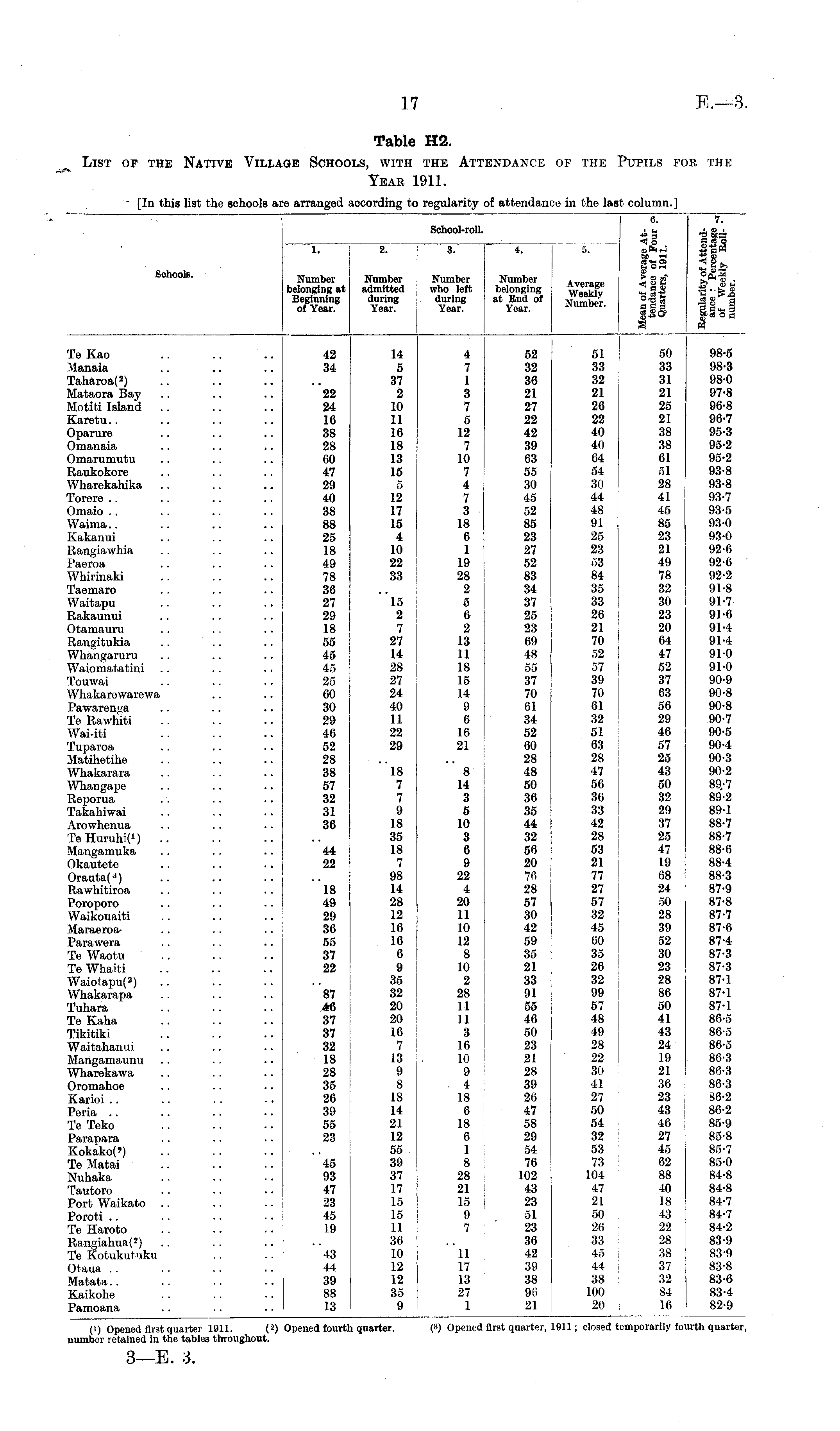 Table H2. List of the Native Village Schools, with the Attendance of the Pupils for the Year 1911. [In this list the schools are arranged according to regularity of attendance in the last column.]