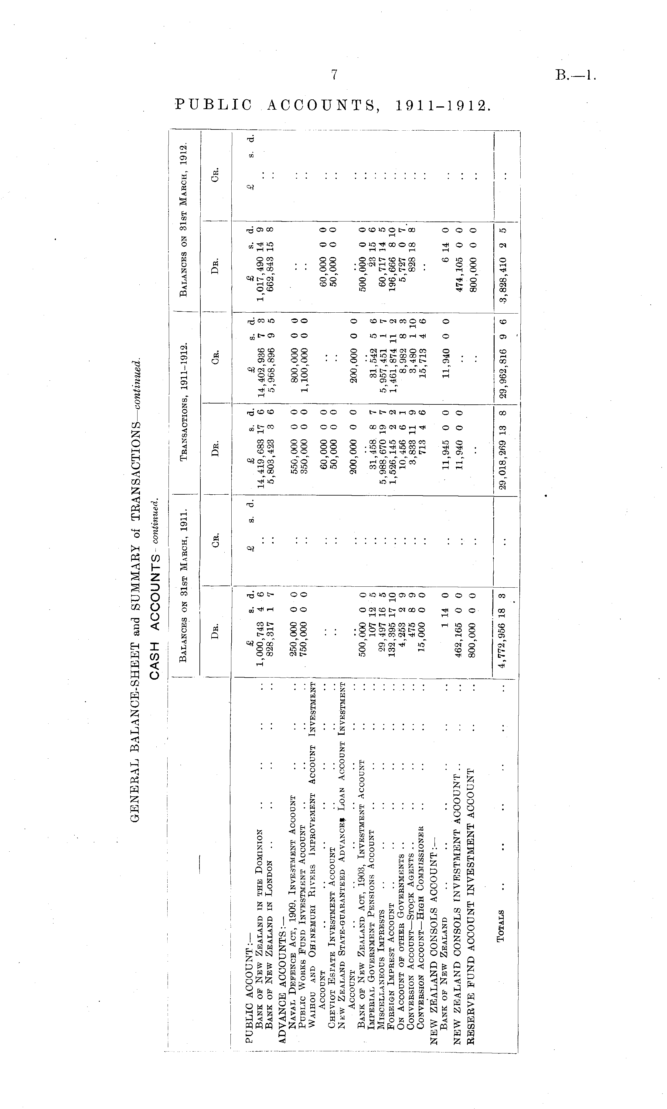 Balances on 31st March, 1911. Transactions, 1911-1912. Balances on 31st March, 1912. Dr. Cr. Dr. Cr. Dr. Or. , PUBLIC ACCOUNT:— Bank op New Zealand in the Dominion Bank op New Zealand in London £ a. d. 1,000,743 4 6 828,317 1 7 £ a. d. £ a. d. 14,419,683 17 6 5,803,423 3 6 £ a. d. 14,402,936 7 3 5,968,896 9 5 £ s. d. 1,017,490 14 9 662,843 15 8 £ a. d. ADVANCE ACCOUNTS:— Naval Defence Act, 1909. Investment Account Public Works Fund Investment Account Waihou and Ohinemuri Rivers Improvement Account Investment Account Cheviot Esi-ate Investment Account New Zealand State-guaranteed Advances Loan Account Investment Account Bank op New Zealand Act, 1903, Investment AccountImperial Government Pensions Account Miscellaneous Imprests Foreign Imprest Account On Account op other Governments Conversion Account —Stock Agents Conversion Account —High Commissioner, NEW ZEALAND CONSOLS ACCOUNT :— Bank of New Zealand NEW ZEALAND CONSOLS INVESTMENT ACCOUNT 250,000 0 0 750,000 0 0 i 500,000 0 0 107 12 5 29,497 16 5 132,395 17 10 4,253 2 9 475 8 9 15,000 0 0 " 550,000 0 0 350,000 0 0 60,000 0 0 50,000 0 0 200,000 0 0 31,458 8 7 5,988,670 19 7 1,526,145 2 2 10,456 6 1 3,833 11 9 713 4 6 800,000 0 0 1,100,000 0 0 200,000 0 0 31,542 5 6 5,957,451 1 7 1,461,874 11 2 8,982 8 3 3,480 1 10 15,713 4 6 60,000 0 0 50,000 0 0 500,000 0 0 23 15 6 60,717 14 5 196,666 8 10 5,727 0 7 828 18 8 i 1 14 0 11,945 0 0 11,940 0 0 6 14 0 462,165 0 0 11,940 0 0 474,105 0 0 RESERVE FUND ACCOUNT INVESTMENT ACCOUNT 800,000 0 0 800,000 0 0 Totals 4,772,956 18 3 ■ 29,018,269 13 8 -- 29,962,816 9 6 3,828,410 2 5