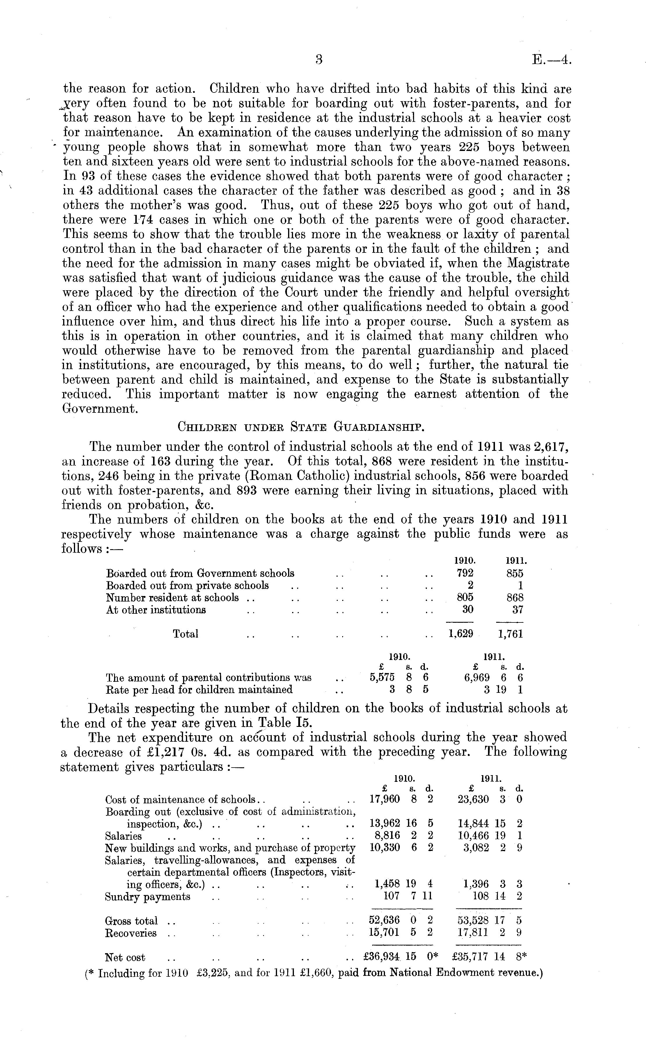 the reason for action. Children who have drifted into bad habits of this kind are often found to be not suitable for boarding out with foster-parents, and for that reason have to be kept in residence at the industrial schools at a heavier cost for maintenance. An examination of the causes underlying the admission of so many young people shows that in somewhat more than two years 225 boys between ten and sixteen years old were sent to industrial schools for the above-named reasons. In 93 of these cases the evidence showed that both parents were of good character ; in 43 additional cases the character of the father was described as good ; and in 38 others the mother's was good. Thus, out of these 225 boys who got out of hand, there were 174 cases in which one or both of the parents were of good character. This seems to show that the trouble lies more in the weakness or laxity of parental control than in the bad character of the parents or in the fault of the children ; and the need for the admission in many cases might be obviated if, when the Magistrate was satisfied that want of judicious guidance was the cause of the trouble, the child were placed by the direction of the Court under the friendly and helpful oversight of an officer who had the experience and other qualifications needed to obtain a good influence over him, and thus direct his life into a proper course. Such a system as this is in operation in other countries, and it is claimed that many children who would otherwise have to be removed from the parental guardianship and placed in institutions, are encouraged, by this means, to do well; further, the natural tie between parent and child is maintained, and expense to the State is substantially reduced. This important matter is now engaging the earnest attention of the Government. Children under State Guardianship. The number under the control of industrial schools at the end of 1911 was 2,617, an increase of 163 during the year. Of this total, 868 were resident in the institutions, 246 being in the private (Eoman Catholic) industrial schools, 856 were boarded out with foster-parents, and 893 were earning their living in situations, placed with friends on probation, &c. The numbers of children on the books at the end of the years 1910 and 1911 respectively whose maintenance was a charge against the public funds were as follows :— 1910. 1911. Boarded out from Government schools .. .. .. 792 855 Boarded out from private schools .. .. . . .. 2 1 Number resident at schools .. .. .. .. .. 805 868 At other institutions .. .. .. .. .. 30 37 Total .. .. .. .. .. 1,629 1,761 1910. 1911. £ s. d. £ s. d. The amount of parental contributions was .. 5,575 8 6 6,969 6 6 Rate per head for children maintained .. 3 8 5 3 19 1 Details respecting the number of children on the books of industrial schools at the end of the year are given in Table 15. The net expenditure on account of industrial schools during the year showed a decrease of £1,217 os. 4d. as compared with the preceding year. The following statement gives particulars :— 1910. 1911. £ s. d. £ s. d. Cost of maintenance of schools.. .. .. 17,960 8 2 23,630 3 0 Boarding out (exclusive of cost of administration, inspection, &c.) .. .. .. .. 13,962 16 5 14,844 15 2 Salaries .. .. .. .. .. 8,816 2 2 10,466 19 1 New buildings and works, and purchase of property 10,330 6 2 3,082 2 9 Salaries, travelling-allowances, and expenses of certain departmental officers (Inspectors, visiting officers, &c.) .. .. .. .•. 1,458 19 i 1,396 3 3 Sundry payments .. .. .. . . 107 711 108 14 2 Gross total .. . . .. .. .. 52,636 0 2 53,528 17 5 Eecoveries . . . . . . .. . . 15,701 5 2 17,811 2 9 Net cost .. .. .. .. .. £36,934 15 0* £35,717 14 8* (* Including for 1910 £3,225, and for 1911 £1,660, paid from National Endowment revenue.)