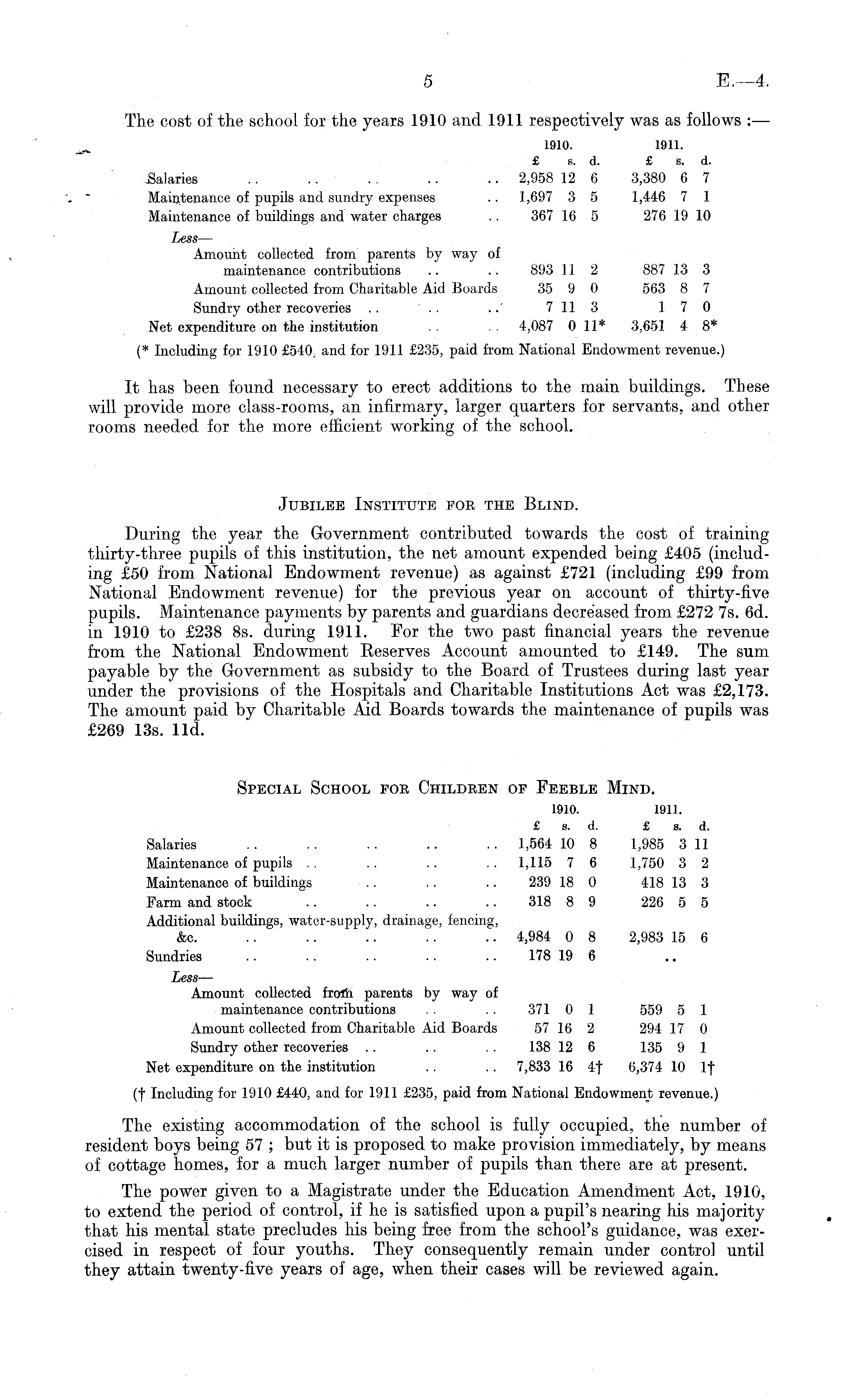 The cost of the school for the years 1910 and 1911 respectively was as follows :— 1910. 1911. £ s. d. £ s. d. .Salaries .. .. . . .. .. 2,958 12 6 3,380 6 7 Maintenance of pupils and sundry expenses .. 1,697 3 5 1,446 7 1 Maintenance of buildings and water charges .. 367 16 5 276 19 10 Less — Amount collected from parents by way of maintenance contributions .. . . 893 11 2 887 13 3 Amount collected from Charitable Aid Boards 35 9 0 563 8 7 Sundry other recoveries .. .. ..' 7113 170 Net expenditure on the institution . . .. 4,087 0 11* 3,651 4 8* (* Including for 1910 £540. and for 1911 £235, paid from National Endowment revenue.) It has been found necessary to erect additions to the main buildings. These will provide more class-rooms, an infirmary, larger quarters for servants, and other rooms needed for the more efficient working of the school. Jubilee Institute for the Blind. During the year the Government contributed towards the cost of training-thirty-three pupils of this institution, the net amount expended being £405 (including £50 from National Endowment revenue) as against £721 (including £99 from National Endowment revenue) for the previous year on account of thirty-five pupils. Maintenance payments by parents and guardians decreased from £272 7s. 6d. in 1910 to £238 Bs. during 1911. For the two past financial years the revenue from the National Endowment Reserves Account amounted to £149. The sum payable by the Government as subsidy to the Board of Trustees during last year under the provisions of the Hospitals and Charitable Institutions Act was £2,173. The amount paid by Charitable Aid Boards towards the maintenance of pupils was £269 13s. lid. Special School for Children of Feeble Mind. 1910. 1911. £ s. d. £ s. d. Salaries .. .. .. .. .. 1,564 10 8 1,985 311 Maintenance of pupils .. .. .. .. 1,115 7 6 1,750 3 2 Maintenance of buildings .. .. .. 239 18 0 418 13 3 Farm and stock .. .. .. .. 318 8 9 226 5 5 Additional buildings, water-supply, drainage, fencing, &c. .. .. .. .. .. 4,984 0 8 2,983 15 6 Sundries .. .. .. .. .. 178 19 6 Less — Amount collected from parents by way of maintenance contributions . . . . 371 0 1 559 5 1 Amount collected from Charitable Aid Boards 57 16 2 294 17 0 Sundry other recoveries .. .. .. 138 12 6 135 9 1 Net expenditure on the institution .. .. 7,833 16 4f 6,374 10 If (f Including for 1910 £440, and for 1911 £235, paid from National Endowment revenue.) The existing accommodation of the school is fully occupied, the number of resident boys being 57 ; but it is proposed to make provision immediately, by means of cottage homes, for a much larger number of pupils than there are at present. The power given to a Magistrate under the Education Amendment Act, 1910, to extend the period of control, if he is satisfied upon a pupil's nearing his majority that his mental state precludes his being free from the school's guidance, was exercised in respect of four youths. They consequently remain under control until they attain twenty-five years of age, when their cases will be reviewed again.