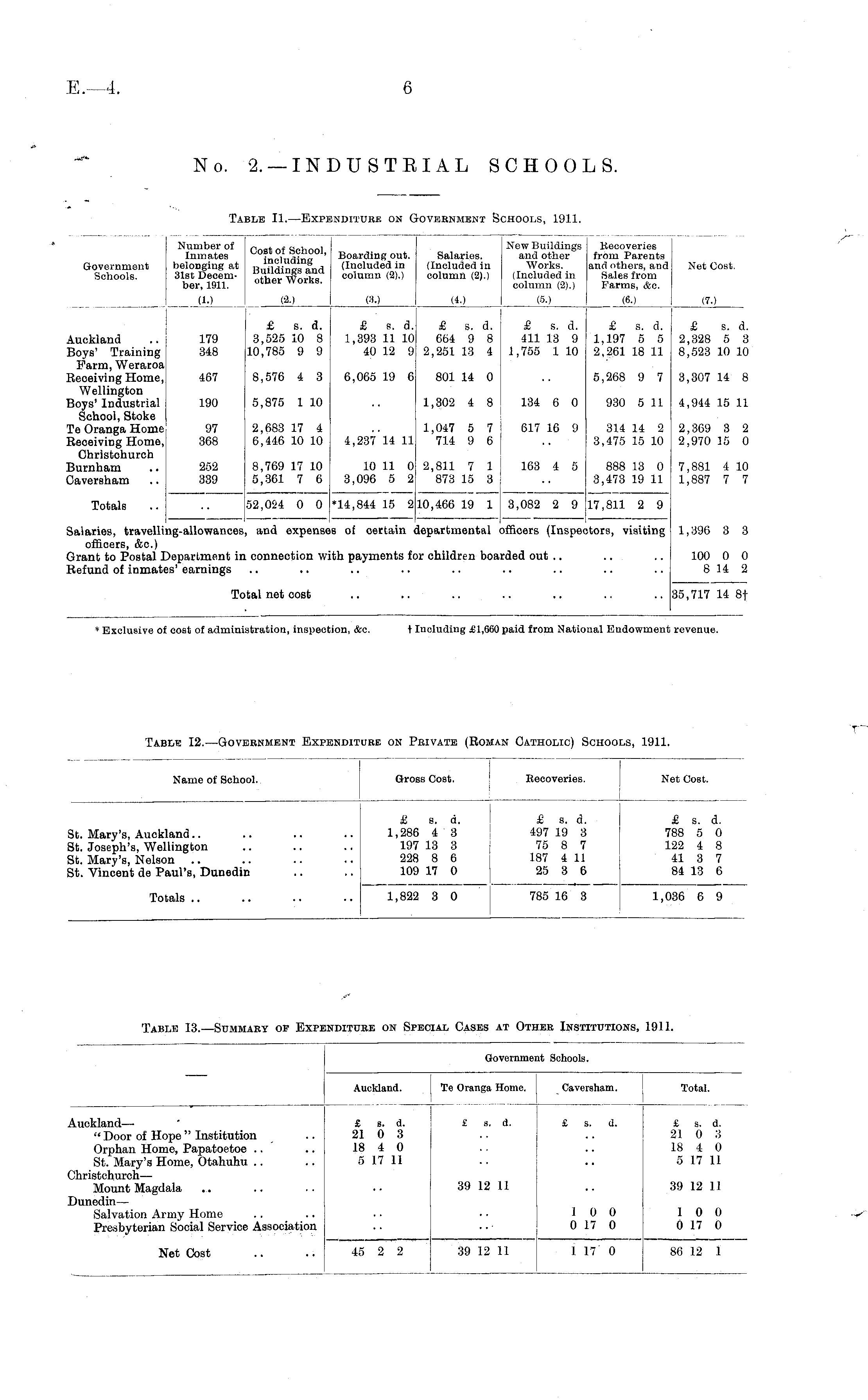Name of School. Gross Cost. Recoveries. Net Cost. St. Mary's, Auckland St. Joseph's, Wellington St. Mary's, Nelson St. Vincent de Paul's, Dunedin £ s. d. 1,286 4 3 197 13 3 228 8 6 109 17 0 1,822 3 0 £ s. d. 497 19 3 75 8 7 187 4 11 25 3 6 785 16 3 £ s. d. 788 5 0 122 4 8 41 3 7 84 13 6 Totals .. 1,036 6 9