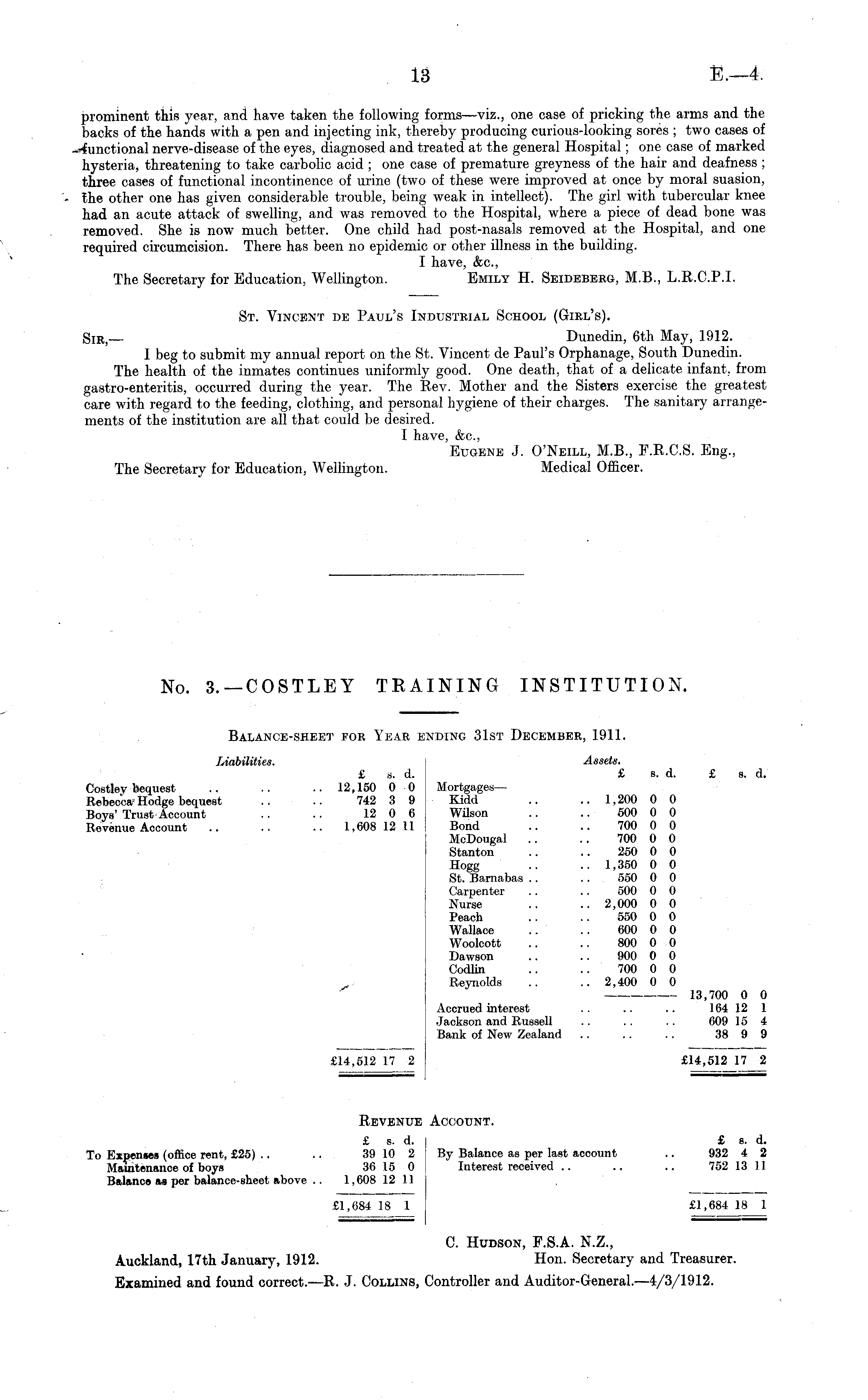 prominent this year, and have taken the following forms —viz., one case of pricking the arms and the backs of the hands with a pen and injecting ink, thereby producing curious-looking sores ; two cases of functional nerve-disease of the eyes, diagnosed and treated at the general Hospital; one case of marked hysteria, threatening to take carbolic acid ; one case of premature greyness of the hair and deafness ; three cases of functional incontinence of urine (two of these were improved at once by moral suasion, the other one has given considerable trouble, being weak in intellect). The girl with tubercular knee had an acute attack of swelling, and was removed to the Hospital, where a piece of dead bone was removed. She is now much better. One child had post-nasals removed at the Hospital, and one required circumcision. There has been no epidemic or other illness in the building. I have, &c, The Secretary for Education, Wellington. Emily H. Seideberg, M.8., L.R.C.P.I. St. Vincent de Paul's Industrial School (Girl's). Sir,_ Dunedin, 6th May, 1912. 1 beg to submit my annual report on the St. Vincent de Paul's Orphanage, South Dunedin. The health of the inmates continues uniformly good. One death, that of a delicate infant., from gastro-enteritis, occurred during the year. The Rev. Mother and the Sisters exercise the greatest care with regard to the feeding, clothing, and personal hygiene of their charges. The sanitary arrangements of the institution are all that could be desired. I have, &c, Eugene J. O'Neill, M.8., F.R.C.S. Eng., The Secretary for Education, Wellington. Medical Officer.