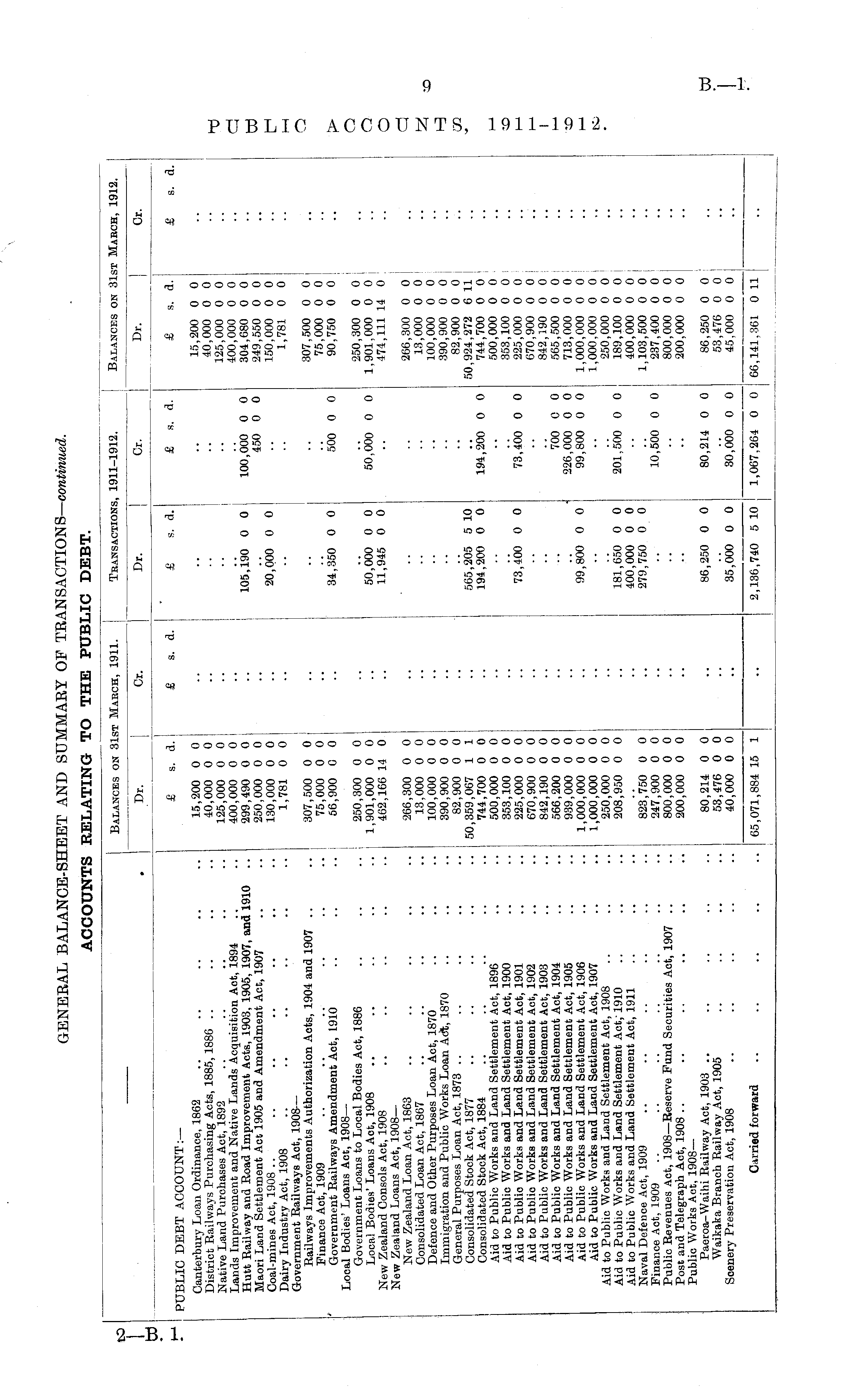 Balances on 31st March, 1911. Teansactioni i, 1911-1912. Balances on 3: st March, 1912. Dr. Cr. Dr. Cr. Dr. Cr. PUBLIC DEBT ACCOUNT:— £ s. d. £ i s. d. & s. d. £ s. d. £ s. a. £ s. d. Canterbury Loan Ordinance, 1862 District Eailways Purchasing Acts, 1885, 1886 Native Land Purchases Act, 1892 Lands Improvement and Native Lands Acquisition Act, 1894 Hutt Railway and Road Improvement Acts, 1903, 1905, 1907, and 1910 Maori Land Settlement Act 1905 and Amendment Act, 1907 Coal-mines Act, 1908 Dairy Industry Act, 1908 Government Railways Aot, 1908 — Eailways Improvements Authorization Acts, 1904 and 1907 .. Finance Act, 1909 Government Railways Amendment Act, L910 Local Bodies' Loans Act, 1908 — Government Loans to Local Bodies Act, 1886 Local Bodies' Loans Act, 1908 New Zealand Consols Act, 1908 New Zealand Loans Act, 1908— New Zealand Loan Act, 1863 Consolidated Loan Act, 1867 Defence and Other Purposes Loan Act, 1870 Immigration and Public Works Loan Ad;, 1870 General Purposes Loan Act, 1873 Consolidated Stock Act, 1877 Consolidated Stock Act, 1884 Aid to Public Works and Land Settlement Act, 1896 Aid to Public Works and Land Settlement Act, 1900 Aid to Publio Works and Land Settlement Act, 1901 Aid to Publio Works and Land Settlement Act, 1902 Aid to Public Works and Land Settlement Act, 1903 Aid to Public Works and Land Settlement Act, 1904 Aid to Public Works and Land Settlement Act, 1905 Aid to Public Works and Land Settlement Act, 1906 Aid to Public Works and Land Settlement Act, 1907 Aid to Public Works and Land Settlement Act, 1908 Aid to Public Works and Land Settlement Act,-1910 Aid to Public Works and Land Settlement Act, 1911 Naval Defence Act, 1909 Finance Act, 1909 Public Revenues Act, 1908 —Reserve Fund Securities Act, 1907 .. Post and Telegraph Act, 1908 Public Works Act, 1908— Paeroa-Waihi Railway Act, 1903 Waikaka Branch Railway Act, 1905 Soenery Preservation Act, 1908 15,200 0 0 40,000 0 0 125,000 0 0 400,000 0 0 i 299,490 0 0 250,000 0 0 130,000 0 0 1,781 0 0 •• 105,190 0 0 100,000 0 0 450 0 0 15,200 0 0 40,000 0 0 125,000 0 0 400,000 0 0 304,680 0 0 249,550 0 0 150,000 0 0 1,781 0 0 20,000 0 0 307,500 0 0 75,000 0 0 56,900 0 0 34,350 0 0 500 0 0 307,500 0 0 75,000 0 0 90,750 0 0 250,300 0 0 1,901,000 0 0 462,166 14 0 50,000 0 0 11,945 0 0 50,000 0 0 250,300 0 0 1,901,000 0 0 474,111 14 0 266,300 0 0 13,000 0 0 100,000 0 0 390,900 0 0 82,900 0 0 50,359,067 1 1 744,700 0 0 500,000 0 0 353,100 0 0 225,000 0 0 670,900 0 0 842,190 0 0 566,200 0 0 939,000 0 0 1,000,000 0 0 1,000,000 0 0 250,000 0 0 208,950 0 0 565,205 5 10 194,200 0 0 73,400 0 0 194,200 0 0 73,400 0 0 266,300 0 0 13,000 0 0 100,000 0 0 390,900 0 0 82,900 0 0 50,924,272 6 11 744,700 0 0 500,000 0 0 353,100 0 0 225,000 0 0 670,900 0 0 842,190 0 0 565,500 0 0 713,000 0 0 1,000,000 0 0 1,000,000 0 0 250,000 0 0 189,100 0 0 400,000 0 0 : 1,103,500 0 0 237,400 0 0 800,000 0 0 200,000 0 0 86,250 0 0 53,476 0 0 45,000 0 0 99,800 0 0 700 0 0 226,000 0 0 99,800 0 0 181,650 0 0 400,000 0 0 279,750 0 0 201,500 0 0 823,750 0 0 247,900 0 0 800,000 0 0 200,000 0 0 10,500 0 0 80,214 0 0 53,476 0 0 40,000 0 0 86,250 0 0 80,214 0 0 35,000 0 0 30,000 0 0 Carried forward 1,067,264 0 0 66,141,361 0 11 65,071,884 15 1 2,136,740 5 10