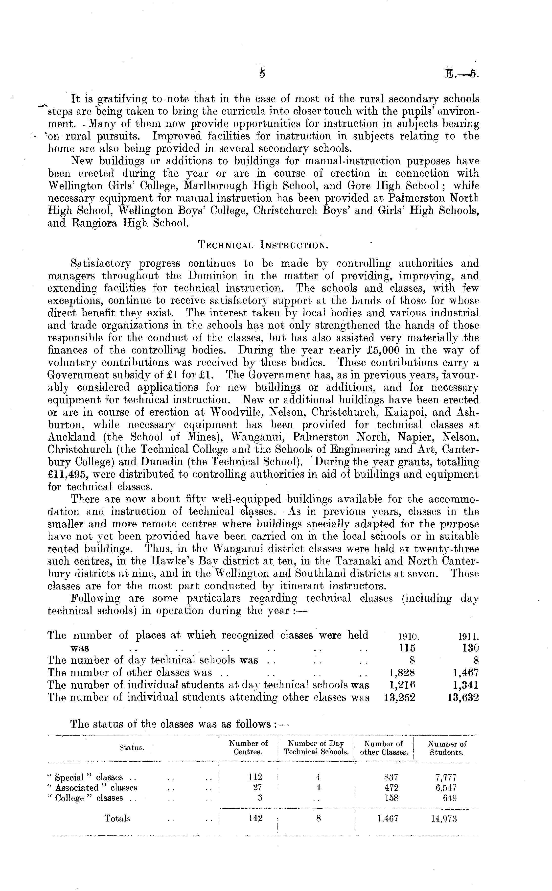 It is gratifying to note that in the case of most of the rural secondary schools steps are being taken to bring the curricula into closer touch with the pupils' environment. - Many of them now provide opportunities for instruction in subjects bearing 'on rural pursuits. Improved facilities for instruction in subjects relating to the home are also being provided in several secondary schools. New buildings or additions to buildings for manual-instruction purposes have been erected during the year or are in course of erection in connection with Wellington Girls' College, Marlborough High School, and Gore High School; while necessary equipment for manual instruction has been provided at Palmerston North High School, Wellington Boys' College, Christchurch Boys' and Girls' High Schools, and Rangiora High School. Technical Instruction. Satisfactory progress continues to be made by controlling authorities and managers throughout the Dominion in the matter of providing, improving, and extending facilities for technical instruction. The schools and classes, with few exceptions, continue to receive satisfactory support at the hands of those for whose direct benefit they exist. The interest taken by local bodies and various industrial and trade organizations in the schools has not only strengthened the hands of those responsible for the conduct of the classes, but has also assisted very materially the finances of the controlling bodies. During the year nearly £5,000 in the way of voluntary contributions was received by these bodies. These contributions carry a Government subsidy of £1 for £1. The Government has, as in previous years, favourably considered applications for new buildings or additions, and for necessary equipment for technical instruction. New or additional buildings have been erected or are in course of erection at Woodville, Nelson, Christchurch, Kaiapoi, and Ashburton, while necessary equipment has been provided for technical classes at Auckland (the School of Mines), Wanganui, Palmerston North, Napier, Nelson, Christchurch (the Technical College and the Schools of Engineering and Art, Canterbury College) and Dunedin (the Technical School). During the year grants, totalling £11,495, were distributed to controlling authorities in aid of buildings and equipment for technical classes. There are now about fifty well-equipped buildings available for the accommodation and instruction of technical classes. As in previous years, classes in the smaller and more remote centres where buildings specially adapted for the purpose have not yet been provided have been carried on in the local schools or in suitable rented buildings. Thus, in the Wanganui district classes were held at twenty-three such centres, in the Hawke's Bay district at ten, in the Taranaki and North Canterbury districts at nine, and in the Wellington and Southland districts at seven. These classes are for the most part conducted by itinerant instructors. Following are some particulars regarding technical classes (including day technical schools) in operation during the year : — The number of places at which recognized classes were held 1910. 1911. was .. .. .. .. .. .. 115 130 The number of day technical schools was .. . . . . 8 8 The number of other classes was . . . . . . . . 1,828 1,467 The number of individual students at day technical schools was 1,216 1,341 The number of individual students attending other classes was 13,252 13,632