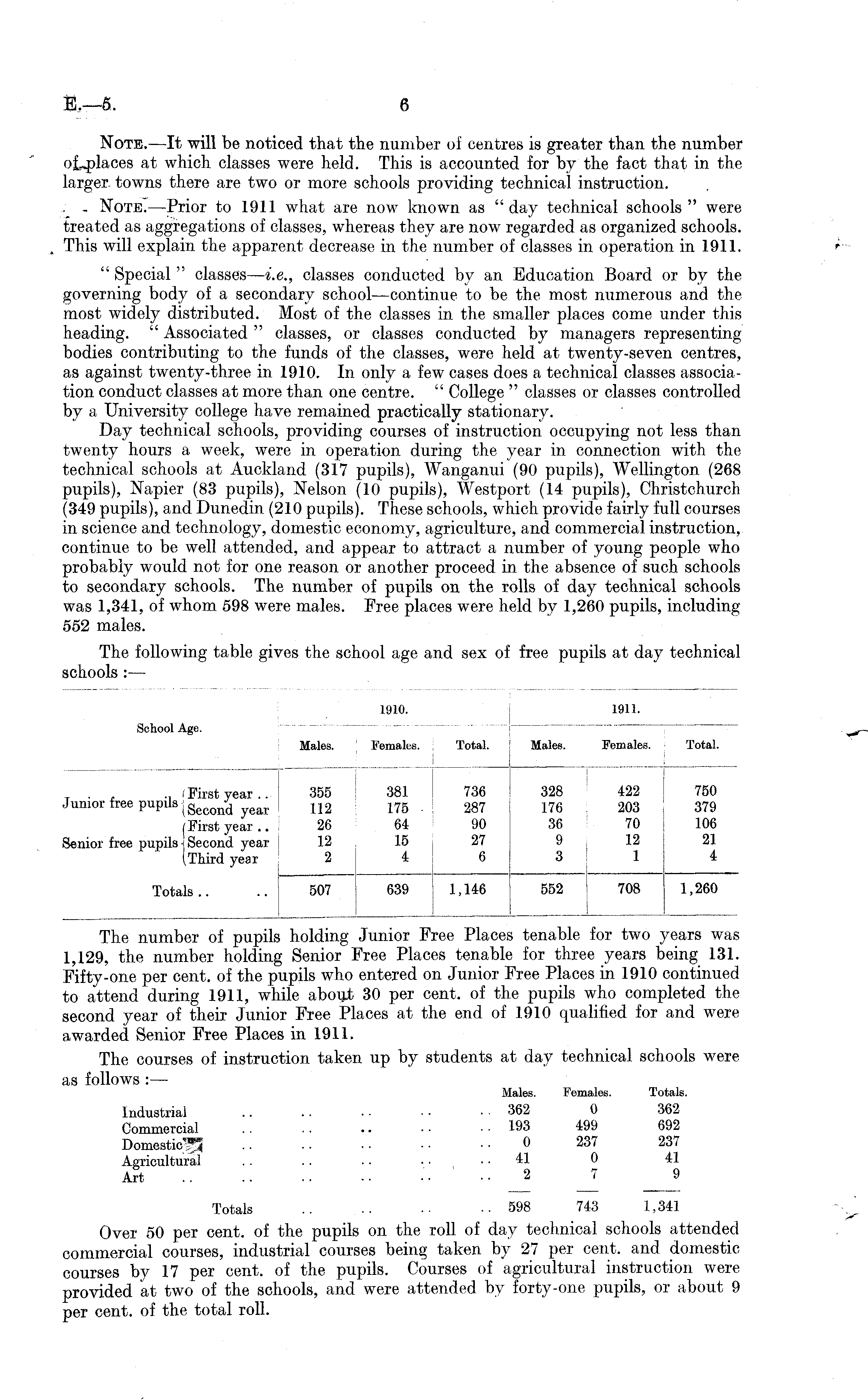 Note.—lt will be noticed that the number of centres is greater than the number ojUplaces at which classes were held. This is accounted for by the fact that in the larger towns there are two or more schools providing technical instruction. ;_ - Note.—Prior to 1911 what are now known as "day technical schools" were treated as aggregations of classes, whereas they are now regarded as organized schools. This will explain the apparent decrease in the number of classes in operation in 1911. " Special " classes— i.e., classes conducted by an Education Board or by the governing body of a secondary school—continue to be the most numerous and the most widely distributed. Most of the classes in the smaller places come under this heading. " Associated " classes, or classes conducted by managers representing bodies contributing to the funds of the classes, were held at twenty-seven centres, as against twenty-three in 1910. In only a few cases does a technical classes association conduct classes at more than one centre. " College " classes or classes controlled by a University college have remained practically stationary. Day technical schools, providing courses of instruction occupying not less than twenty hours a week, were in operation during the year in connection with the technical schools at Auckland (317 pupils), Wanganui (90 pupils), Wellington (268 pupils), Napier (83 pupils), Nelson (10 pupils), Westport (14 pupils), Christchurch (349 pupils), and Dunedin (210 pupils). These schools, which provide fairly full courses in science and technology, domestic economy, agriculture, and commercial instruction, continue to be well attended, and appear to attract a number of young people who probably would not for one reason or another proceed in the absence of such schools to secondary schools. The number of pupils on the rolls of day technical schools was 1,341, of whom 598 were males. Free places were held by 1,260 pupils, including 552 males.