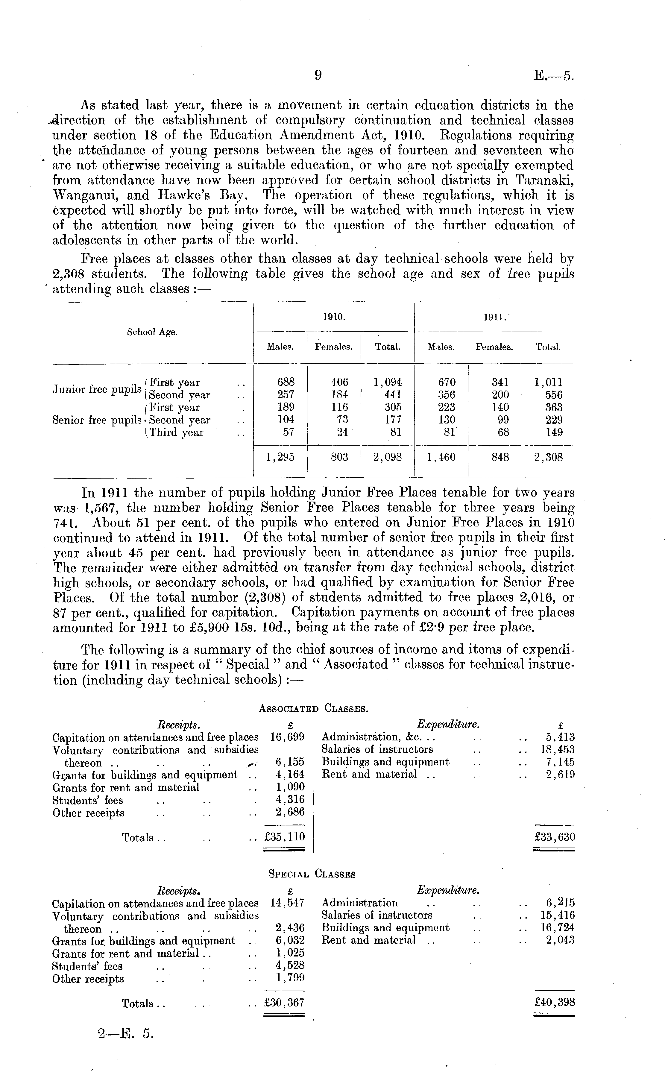 In 1911 the number of pupils holding Junior Free Places tenable for two years was 1,567, the number holding Senior Free Places tenable for three years being 741. About 51 per cent, of the pupils who entered on Junior Free Places in 1910 continued to attend in 1911. Of the total number of senior free pupils in their first year about 45 per cent, had previously been in attendance as junior free pupils. The remainder were either admitted on transfer from day technical schools, district high schools, or secondary schools, or had qualified by examination for Senior Free Places. Of the total number (2,308) of students admitted to free places 2,016, or 87 per cent., qualified for capitation. Capitation payments on account of free places amounted for 1911 to £5,900 15s. 10d., being at the rate of £2*9 per free place. The following is a summary of the chief sources of income and items of expenditure for 1911 in respect of " Special " and " Associated " classes for technical instruction (including day technical schools) : — Associated Classes. Receipts. £ Expenditure. £ Capitation on attendances and free places 16,699 Administration, &c. .. .. .. 5,413 Voluntary contributions and subsidies Salaries of instructors .. .. 18,453 thereon .. .. .. ~ 6,155 Buildings and equipment .. .. 7,145 Grants for buildings and equipment . . 4,164 Eent and material .. . . .. 2,619 Grants for rent and material .. 1,090 Students'fees .. .. . 4,316 Other receipts .. . . . . 2, 686 Totals.. .. .. £35,110 £33,630 Special Classes Receipts. £ Expenditure. Capitation on attendances and free places 14,547 Administration .. .. .. 6,215 Voluntary contributions and subsidies Salaries of instructors .. .. 15,416 thereon .. .. .. . . 2,436 Buildings and equipment .. 16,724 Grants for. buildings and equipment .. 6,032 Rent and material .. .. .. 2,043 Grants for rent and material .. .. 1,025 Students'fees .. .. .. 4,528 Other receipts .." . . .. 1,799 Totals.. .. .. £30,367 £40,398