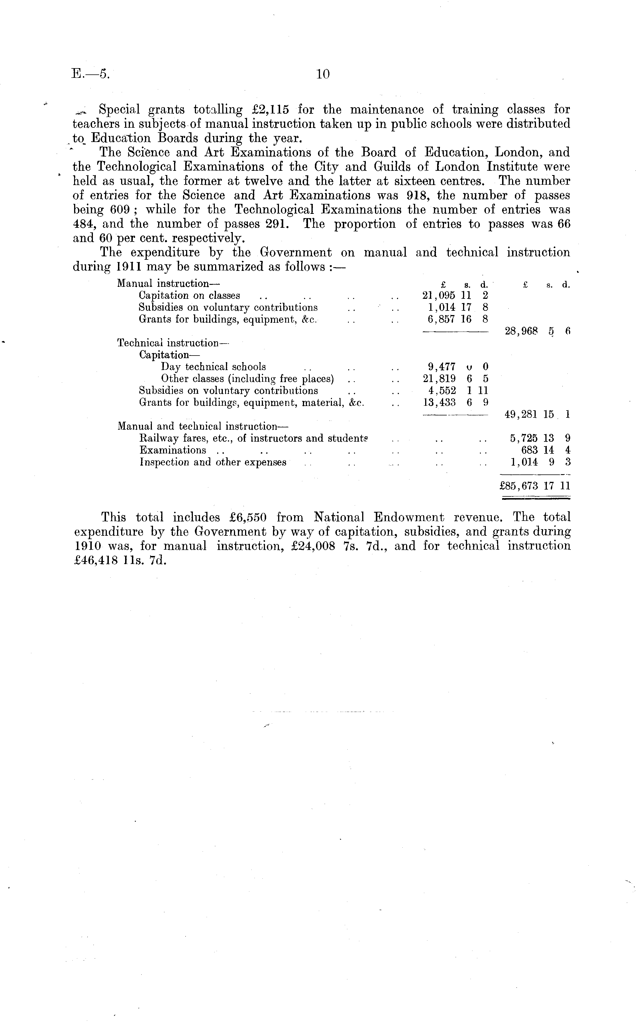 *» Special grants totalling £2,115 for the maintenance of training classes for teachers in subjects of manual instruction taken up in public schools were distributed to. Education Boards during the year. The Science and Art Examinations of the Board of Education, London, and the Technological Examinations of the City and Guilds of London Institute were held as usual, the former at twelve and the latter at sixteen centres. The number of entries for the Science and Art Examinations was 918, the number of passes being 609 ; while for the Technological Examinations the number of entries was 484, and the number of passes 291. The proportion of entries to passes was 66 and 60 per cent, respectively. The expenditure by the Government on manual and technical instruction during 1911 may be summarized as follows :— Manual instruction — £ s. d. £ s. d. Capitation on classes .. . . .. .. 21,095 11 2 Subsidies on voluntary contributions .. .. 1,014 17 8 Grants for buildings, equipment, &c. . . . . 6,857 16 8 28,968 5 6 Technical instruction— Capitation— Day technical schools . . . . . . 9,477 v 0 Other classes (including free places) .. . . 21,819 6 5 Subsidies on voluntary contributions . . . . 4,552 1 11 Grants for buildings, equipment, material, &c. .. 13,433 6 9 49,281 15 1 iManual and technical instruction — Railway fares, etc., of instructors and student? . . .. . . 5,725 13 9 Examinations . . .. . . . . . . . . . . 683 14 4 Inspection and other expenses . . .. ... . . . . . 1,014 9 3 £85,673 17 11 This total includes £6,550 from National Endowment revenue. The total expenditure by the Government by way of capitation, subsidies, and grants during 1910 was, for manual instruction, £24,008 7s. 7d., and for technical instruction £46,418 11s. 7d.
