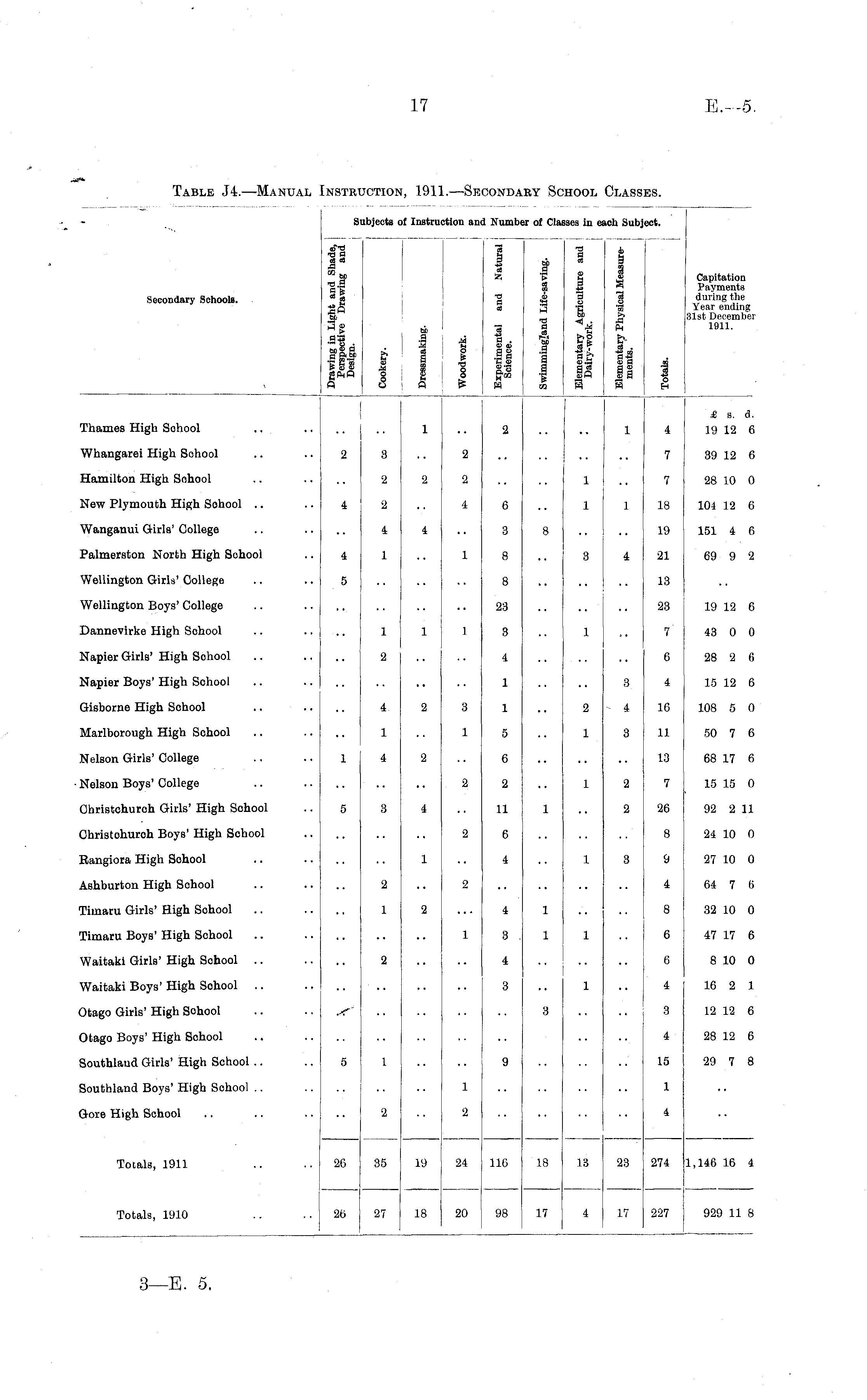 Table J4. — Manual Instruction, 1911.—Secondary School Classes.