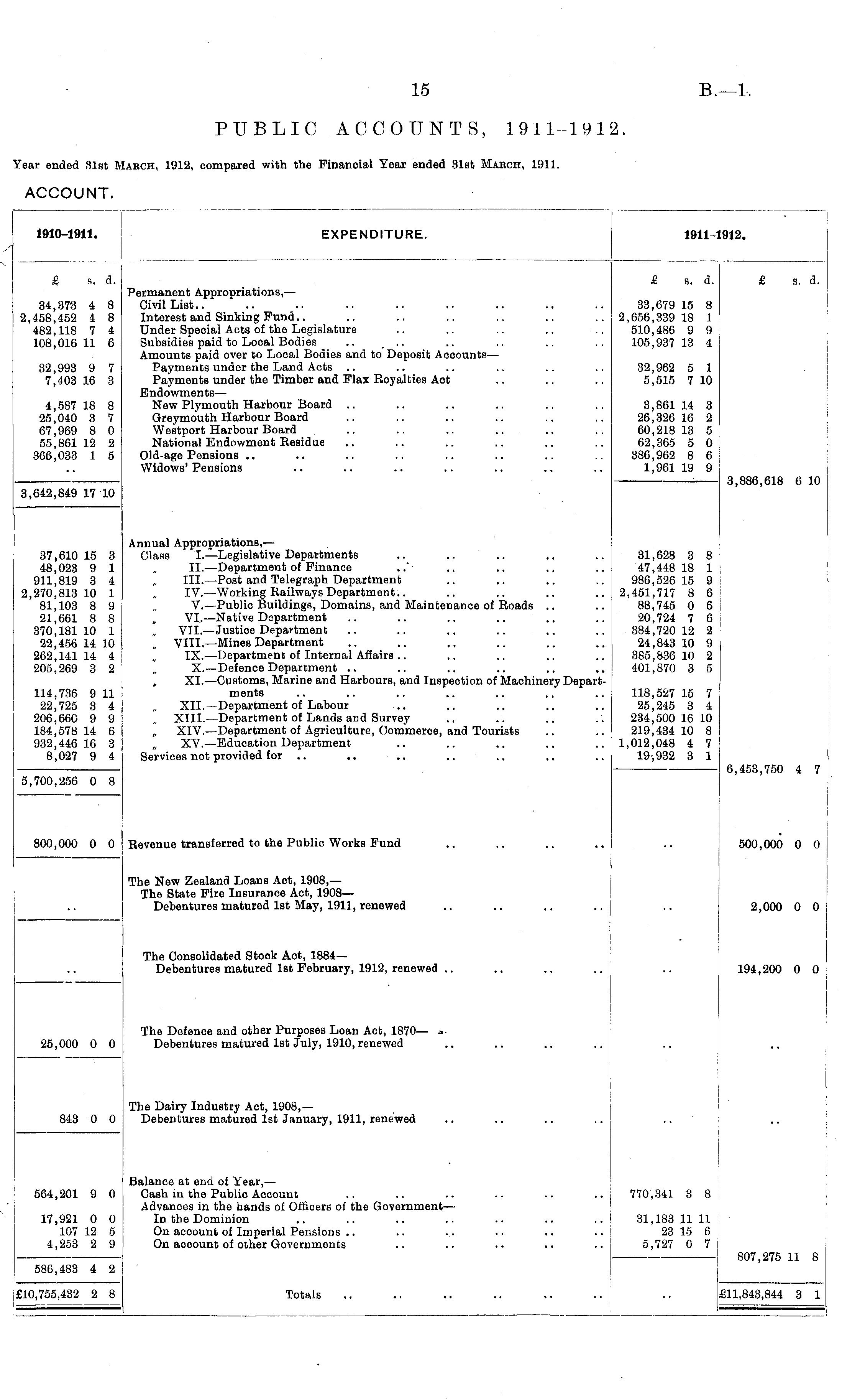 1910-1911. EXPENDITURE. 1911.912. £ s. d. £ s. a. £ s. a. 34,873 4 8 2,458,452 4 8 482,118 7 4 108,016 11 6 32,993 9 7 7,403 16 3 Permanent Appropriations, — Civil List.. Interest ana Sinking Funa.. Under Special Acts of the Legislature Subsidies paid to Local Bodies .. Amounts paia over to Local Bodies and to Deposit Accounts — Payments under the Land Acts Payments under the Timber and Flax Royalties Aot Endowments — New Plymouth Harbour Board Greymouth Harbour Board Westport Harbour Board .. .. .. National Endowment Residue Old-age Pensions Widows' Pensions 33,679 15 8 2,656,339 18 1 510,486 9 9 105,937 13 4 32,962 5 1 5,515 7 10 4,587 18 8 25,040 3 7 67,969 8 0 55,861 12 2 366,033 1 5 3,861 14 3 26,326 16 2 60,218 13 5 62,365 5 0 386,962 8 6 1,961 19 9 3,886,618 6 10 3,642,849 17 10 37,610 15 3 48,023 9 1 911,819 3 4 2,270,813 10 1 81,103 8 9 21,661 8 8 370,181 10 1 22,456 14 10 262,141 14 4 205,269 3 2 Annual Appropriations,— Class I. —Legislative Departments II.—Department of Finance III.—Post and Telegraph Department IV. —Working Railways Department.. V. —Publio Buildings, Domains, and Maintenance of Roads VI.—Native Department „ VII. —Justioe Department VIII. —Mines Department IX. —Department of Internal Affairs X.—Defence Department XI. —Customs, Marine and Harbours, and Inspection of Machinery Departments XII.—Department of Labour XIII. —Department of Lands and Survey XIV. —Department of Agriculture, Commerce, and Tourists XV. —Education Department Services not provided for .. .. .. .... 31,628 3 8 47,448 18 1 986,526 15 9 2,451,717 8 6 88,745 0 6 20,724 7 6 384,720 12 2 24,843 10 9 385,836 10 2 401,870 3 5 114,736 9 11 22,725 3 4 206,660 9 9 184,578 14 6 932,446 16 3 8,027 9 4 118,527 15 7 25,245 3 4 234,500 16 10 219,434 10 8 1,012,048 4 7 19,932 3 1 5,700,256 0 8 6,453,750 4 7 800,000 0 0 Revenue transferred to the Public Works Fund 500,000 0 0 The New Zealand Loans Act, 1908, — The State Fire Insurance Act, 1908— Debentures matured 1st May, 1911, renewed 2,000 0 0 The Consolidated Stook Act, 1884— Debentures matured 1st February, 1912, renewed 194,200 0 0 25,000 0 0 The Defence and other Purposes Loan Act, 1870 — Debentures matured 1st July, 1910, renewed The Dairy Industry Act, 1908,— Debentures matured 1st January, 1911, renewed 843 0 0 Balance at end of Year, — Cash in the Public Account Advances in the hands of Officers of the Government — In the Dominion On acoount of Imperial Pensions On aocount of other Governments 770,341 3 8 564,201 9 0 17,921 0 0 107 12 5 4,253 2 9 31,183 11 11 23 15 6 5,727 0 7 807,275 11 8 586,483 4 2 Totals £10,755,432 2 8 (£11.843,844 3 1