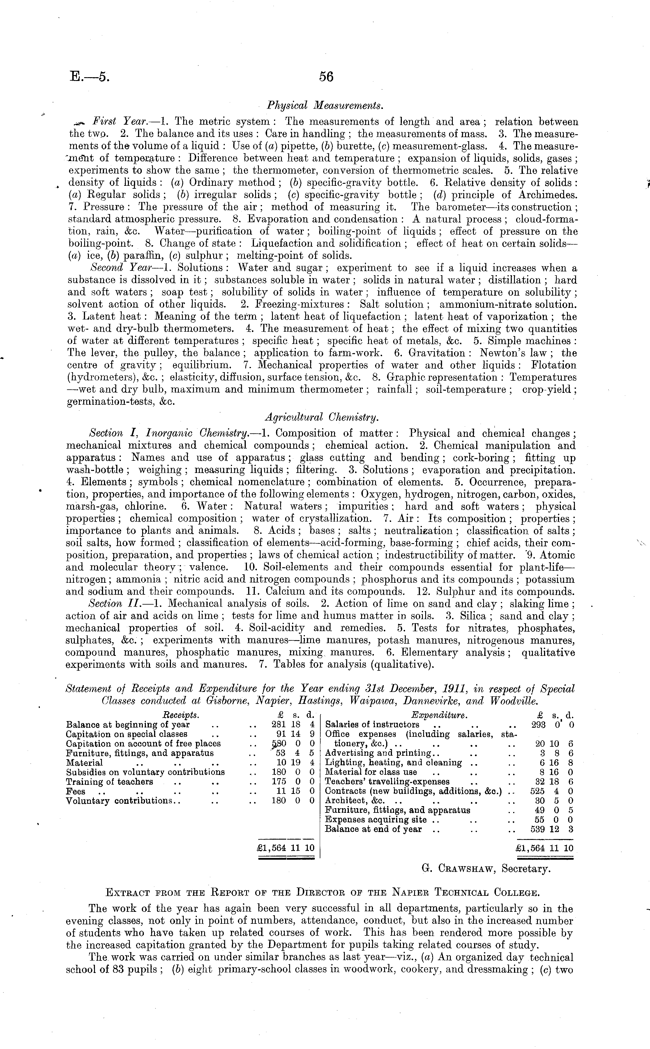 Extract from the Report of the Director of the Napier Technical College. The work of the year has again been very successful in all departments, particularly so in the evening classes, not only in point of numbers, attendance, conduct, but also in the increased number of students who have taken up related courses of work. This has been rendered more possible by the increased capitation granted by the Department for pupils taking related courses of study. The work was carried on under similar branches as last year —viz., (a) An organized day technical school of 83 pupils ; (b) eight primary-school classes in woodwork, cookery, and dressmaking ; (c) two