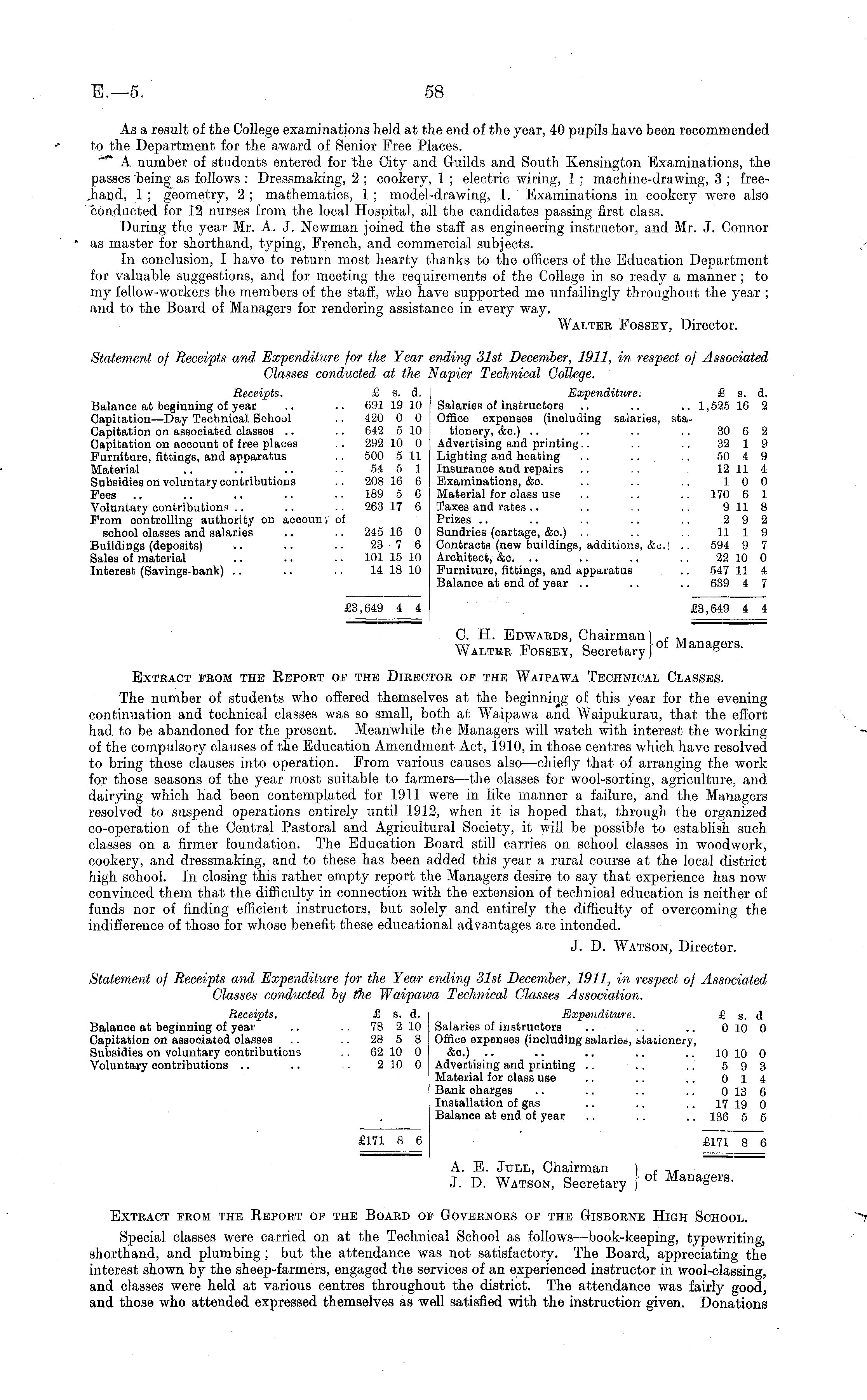 Statement of Receipts and Expenditure for the Year ending 31st December, 1911, in respect of Associated Classes conducted at the Napier Technical College.