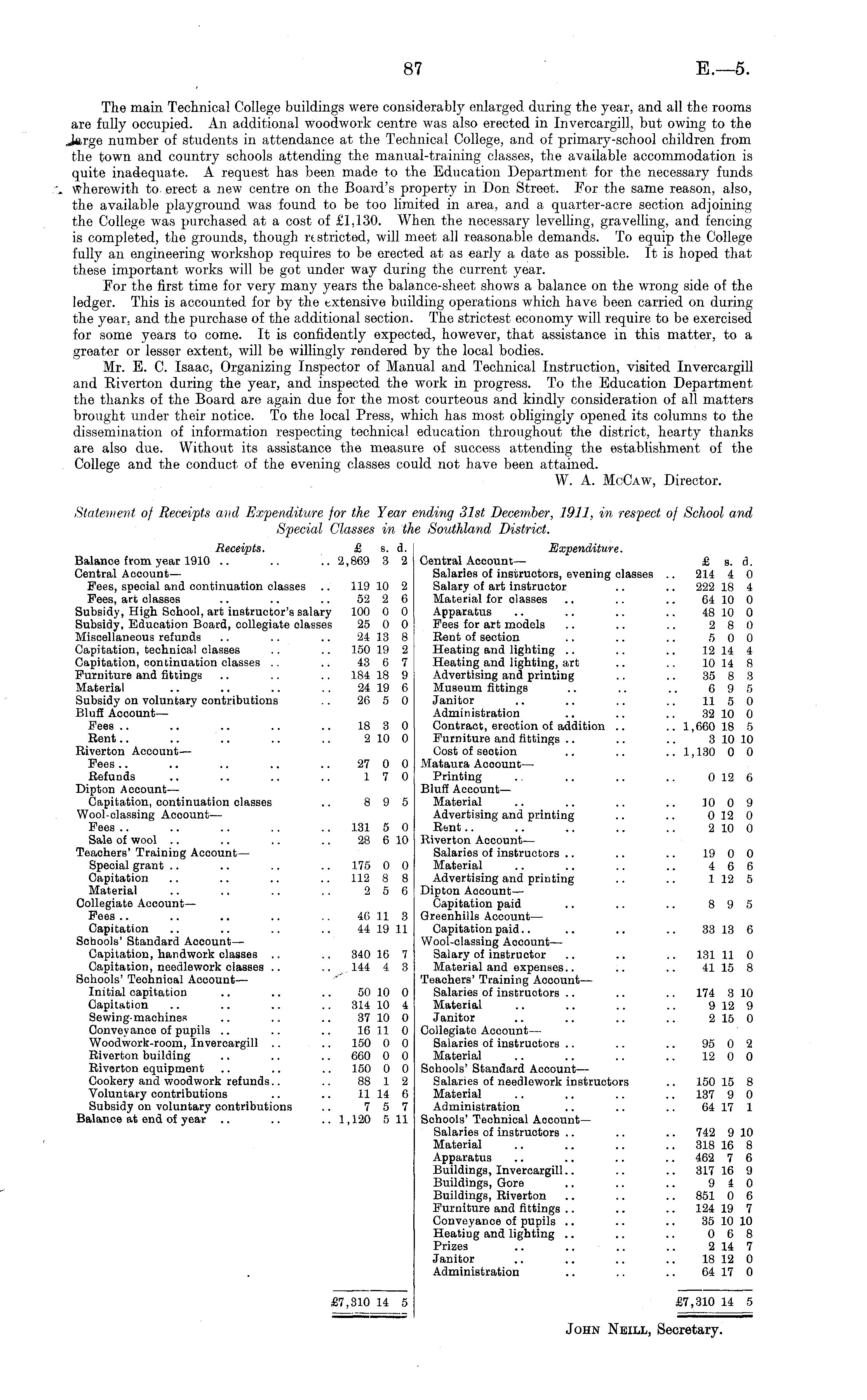 Receipts. £ s. d. Balance from year 1910 .. .. .. 2,869 3 2 Central Account— Fees, special and continuation classes .. 119 10 2 Fees, art classes .. .. .. 52 2 6 Subsidy, High School, art instructor's salary 100 0 0 Subsidy, Education Board, collegiate classes 25 0 0 Miscellaneous refunds .. .. .. 24 13 8 Capitation, technical classes .. .. 150 19 2 Capitation, continuation classes .. .. 43 6 7 Furniture and fittings .. .. .. 184 18 9 Material .. .. .. .. 24 19 6 Subsidy on voluntary contributions .. 26 5 0 Bluff Acoount — Fees .. .. .. .. .. 18 3 0 Rent.. .. .. .. .. 2 10 0 Riverton Account— Fees .. .. .. .. .. 27 0 0 Refunds .. .. .. .. 17 0 Dipton Account— Capitation, continuation classes .. 8 9 5 Wool-classing Acoount— Fees .. .. .. .. 131 5 0 Sale of wool .. .. .. .. 28 6 10 Teachers' Training Account — Special grant .. .. .. .. 175 0 0 Capitation .. .. .. ..11288 Material .. .. .. .. 2 5 6 Collegiate Account — Fees .. .. .. .. .. 46 11 3 Capitation .. .. .. .. 44 19 11 Schools' Standard Account — Capitation, handwork classes .. .. 340 16 7 Capitation, needlework classes .. .. 144 4 3 Schools' Technical Account — Initial capitation .. .. .. 50 10 0 Capitation .. .. .. 314 10 4 Sewing-machines .. .. .. 37 10 0 Conveyance of pupils .. .. .. 16 11 0 Woodwork-room, Invercargill .. .. 150 0 0 Riverton building .. .. .. 660 0 0 Riverton equipment .. .. .. 150 0 0 Cookery and woodwork refunds.. .. 88 1 2 Voluntary contributions .. .. 11 14 6 Subsidy on voluntary contributions .. 7 5 7 Balance at end of year .. .. .. 1,120 5 11 Expenditure. Central Account — £ s. d. Salaries of instructors, evening classes .. 214 4 0 Salary of art instructor .. .. 222 18 4 Material for olasses .. .. .. 64 10 0 Apparatus .. .. .. .. 48 10 0 Fees for art models .. .. .. 2 8 0 Rent of section .. .. .. 5 0 0 Heating and lighting .. .. .. 12 14 4 Heating and lighting, art .. .. 10 14 8 Advertising and printing .. .. 35 8 3 Museum fittings .. .. .. 6 9 5 Janitor .. .. .. .. 11 5 0 Administration .. .. .. 32 10 0 Contract, erection of addition .. .. 1,660 18 5 Furniture and fittings .. .. .. 3 10 10 Cost of seotion .. .. .. 1,130 0 0 Mataura Acoount— Printing .. .. .. .. 0 12 6 Bluff Account— Material .. .. .. .. 10 0 9 Advertising and printing .. .. 0 12 0 Rent.. .. .. .. .. 2 10 0 Riverton Account— Salaries of instructors .. .. .. 19 0 0 Material .. .. .. .. 4 6 6 Advertising and printing .. .. 1 12 5 Dipton Account — Capitation paid .. .. .. 8 9 5 Greenhills Account — Capitation paid.. .. .. .. 33 13 6 Wool-classing Account— Salary of instructor .. .. .. 131 11 0 Material and expenses.. .. .. 41 15 8 Teachers' Training Account — Salaries of instructors .. .. .. 174 3 10 Material .. .. .. .. 9 12 9 Janitor .. .. .. .. 2 15 0 Collegiate Account— Salaries of instructors .. .. .. 95 0 2 Material .. .. .. .. 12 0 0 Schools' Standard Account — Salaries of needlework instructors .. 150 15 8 Material .. .. .. 137 9 0 Administration .. .. .. 64 17 1 Schools' Technical AccountSalaries of instructors .. .. .. 742 9 10 Material .. .. .. 318 16 8 Apparatus .. .. .. .. 462 7 6 Buildings, Invercargill.. .. .. 317 16 9 Buildings, Gore .. .. .. 9 4 0 Buildings, Riverton .. .. .. 851 0 6 Furniture and fittings .. .. .. 124 19 7 Conveyance of pupils .. .. .. 35 10 10 HeatiDg and lighting .. .. .. 0 6 8 Prizes .. .. .. .. 2 14 7 Janitor .. .. .. .. 18 12 0 Administration .. .. .. 64 17 0 £7,310 14 5 £7,310 14 5 John Neill, Secretary.
