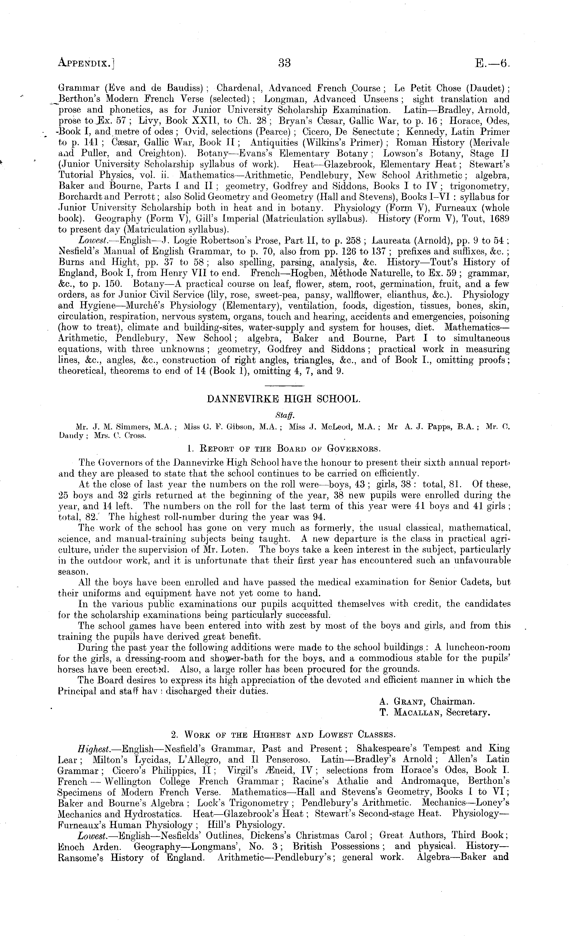 DANNEVIRKE HIGH SCHOOL. Staff. Mr. J. 11. Simmers, M.A. ; Miss G. V. Gibson, M.A. ; Miss J. MoLeod, M.A. ; Mr A. J. Papps, B.A. ; Mr. 0. Dandy ; Mrs. C. Cross. 1. Report of the Board of Governors. The Governors of the Dannevirke High School have the honour to present their sixth annual report' and they are pleased to state that the school continues to be carried on efficiently. At the close of last year the numbers on the roll were —boys, 43 ; girls, 38 : total, 81. Of these, 25 boys and 32 girls returned at the beginning of the year, 38 new pupils were enrolled during the year, and 14 left. The numbers on the roll for the last term of this year were 41 boys and 4] girls : total, 82.' The highest roll-number during the year was 94. The work of the school has gone on very much as formerly, the usual classical, mathematical, science, and manual-training subjects being taught. A new departure is the class in practical agriculture, under the supervision of Mr. Loten. The boys take a keen interest in the subject, particularly in the outdoor work, and it is unfortunate that their first year has encountered such an unfavourable season. All the boys have been enrolled and have passed the medical examination for Senior Cadets, but their uniforms and equipment have not yet come to hand. In the various public examinations our pupils acquitted themselves with credit, the candidates for the scholarship examinations being particularly successful. The school games have been entered into with zest by most of the boys and girls, and from this training the pupils have derived great benefit. During the past year the following additions were made to the school buildings.: A luncheon-room for the girls, a dressing-room and sho.wer-bath for the boys, and a commodious stable foi- the pupils' horses have been erecfoid. Also, a large roller has been procured for the grounds. The Board desires to express its high appreciation of the devoted and efficient manner in which the Principal and staff hay : discharged their duties. A. Grant, Chairman. T. Macallan, Secretary. 2. Work of the Highest and Lowest Classes. Highest. —English—Nesfield's Grammar, Past and Present ; Shakespeare's Tempest and King Lear; Milton's Lycidas, L'Allegro, and 11 Penseroso. Latin —Bradley's Arnold; Allen's Latin Grammar; Cicero's Philippics, II; Virgil's iEneid, IV; selections from Horace's Odes, Book I. French — Wellington College French Grammar; Racine's Athalie and Andromaque, Berthon's Specimens of Modern French Verse. Mathematics—Hall and Stevens's Geometry, Books 1 to VI; Baker and Bourne's Algebra ; Lock's Trigonometry ; Pendlebury's Arithmetic. Mechanics—Loney's Mechanics and Hydrostatics. Heat—Glazebrook's Heat; Stewart's Second-stage Heat. Physiology — Furneaux's Human Physiology ; Hill's Physiology. Lowest. —English —Nesfields , Outlines, Dickens's Christmas Carol; Great Authors, Third Book; Enoch Arden. Geography:—Longmans', No. 3; British Possessions; and physical. History— Ransome's History of England. Arithmetic —Pendlebury's; general work. Algebra —Baker and