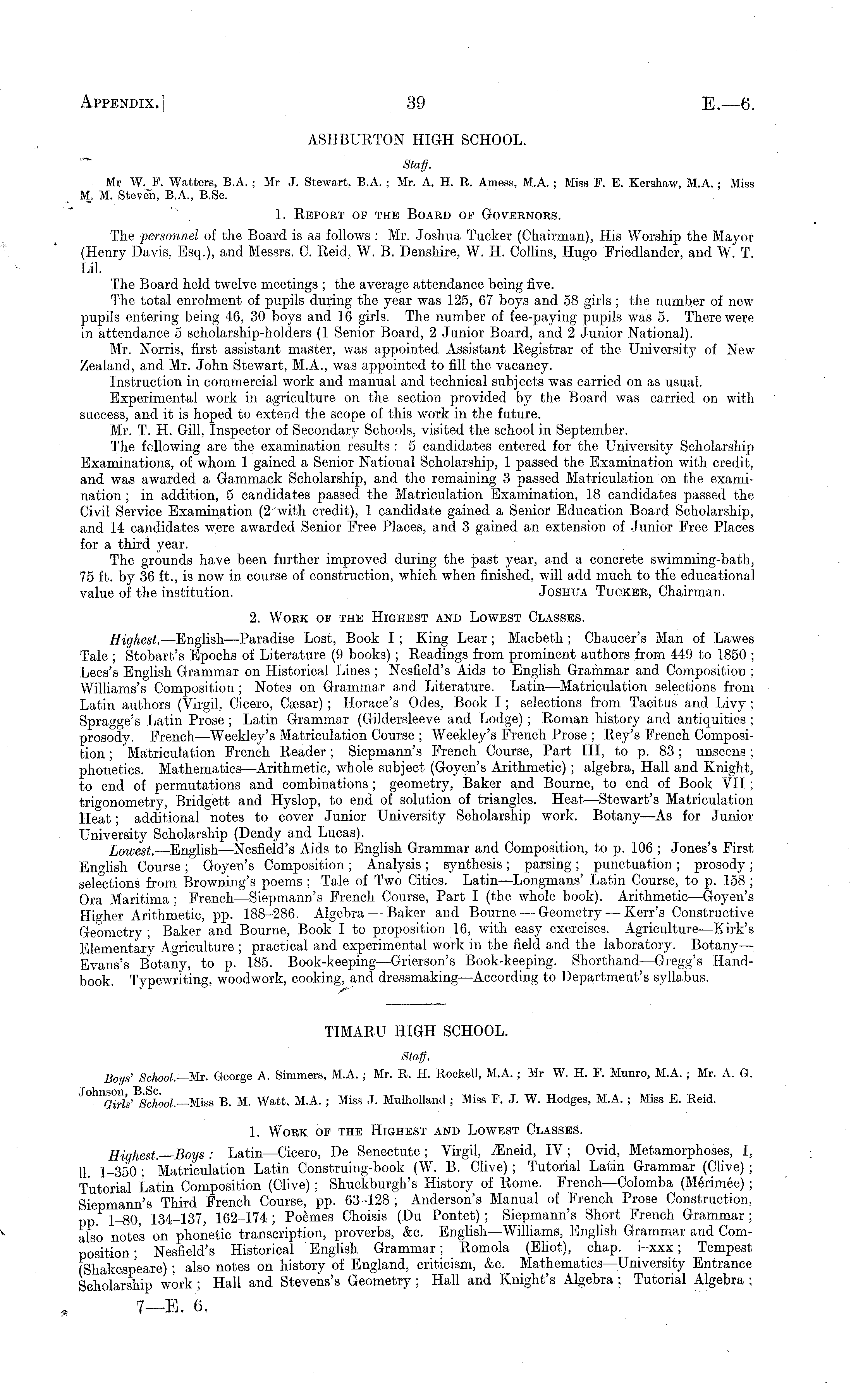 Staff. Mr W. F. Walters, B.A. ; Mr J. Stewart. B.A. ; Mr. A. H. R. Amess, M.A. ; Miss F. E. Kershaw, M.A. ; Miss M. M. Steven, 8.A., B.Sc. 1. Report of the Board op Governors. The personnel of the Board is as follows : Mr. Joshua Tucker (Chairman), His Worship the Mayor (Henry Davis. Esq.), and Messrs. C. Reid, W. B. Denshire, W. H. Collins, Hugo Friedlander, and W. T. Lil. The Board held twelve meetings ; the average attendance being five. The total enrolment of pupils during the year was 125, 67 boys and 58 girls ; the number of hew pupils entering being 46, 30 boys and 16 girls. The number of fee-paying pupils was 5. There were in attendance 5 scholarship-holders (1 Senior Board, 2 Junior Board, and 2 Junior National). Mr. Norris, first assistant master, was appointed Assistant Registrar of the University of New Zealand, and Mr. John Stewart, M.A., was appointed to fill the vacancy. Instruction in commercial work and manual and technical subjects was carried on as usual. Experimental work in agriculture on the section provided by the Board was carried on with success, and it is hoped to extend the scope of this work in the future. Mr. T. H. Gill, Inspector of Secondary Schools, visited the school in September. The following are the examination results : 5 candidates entered for the University Scholarship Examinations, of whom 1 gained a Senior National Scholarship, 1 passed the Examination with credit, and was awarded a Gammack Scholarship, and the remaining 3 passed Matriculation on the examination ; in addition, 5 candidates passed the Matriculation Examination, 18 candidates passed the Civil Service Examination (2'with credit), 1 candidate gained a Senior Education Board Scholarship, and 14 candidates were awarded Senior Free Places, and 3 gained an extension of Junior Free Places for a third year. The grounds have been further improved during the past year, and a concrete swimming-bath, 75 ft. by 36 ft., is now in course of construction, which when finished, will add much to the educational value of the institution. Joshua Tucker, Chairman. 2. Work of the Highest and Lowest Classes. Highest. —English —Paradise Lost, Book I ; King Lear ; Macbeth ; Chaucer's Man of Lawes Tale ; Stobart's Epochs of Literature (9 books) ; Readings from prominent authors from 449 to 1850 ; Lees's English Grammar on Historical Lines ; Nesfield's Aids to English Grammar and Composition ; Williams's Composition ; Notes on Grammar a.nd. Literature. Latin—Matriculation selections from Latin authors (Virgil, Cicero, Caesar) ; Horace's Odes, Book I; selections from Tacitus and Livy ; Spragge's Latin Prose ; Latin Grammar (Gildersleeve and Lodge) ; Roman history and antiquities ; prosody. French —Weekley's Matriculation Course ; Weekley's French Prose ; Rey's French Composition ; Matriculation French Reader; Siepmann's French Course, Part 111, to p. 83; unseens; phonetics. Mathematics —Arithmetic, whole subject (Goyen's Arithmetic) ; algebra, Hall and Knight, to end of permutations and combinations ; geometry, Baker and Bourne, to end of Book VII; trigonometry, Bridgett and Hyslop, to end of solution of triangles. Heat—Stewart's Matriculation Heat; additional notes to cover Junior University Scholarship work. Botany —As for Junior University Scholarship (Dendy and Lucas). Lowest. —English —Nesfield's Aids to English Grammar and Composition, to p. 106 ; Jones's First English Course ; Goyen's Composition ; Analysis ; synthesis ; parsing ; punctuation ; prosody ; selections from Browning's poems ; Tale of Two Cities. Latin —Longmans' Latin Course, to p. 158 ; Ora Maritima : French—Siepmann's French Course, Part I (the whole book). Arithmetic—Goyen's Higher Arithmetic, pp. 188-286. Algebra — Baker and Bourne — Geometry — Kerr's Constructive Geometry ; Baker and Bourne, Book Ito proposition 16, with easy exercises. Agriculture—Kirk's Elementary Agriculture ; practical and experimental work in the field and the laboratory. Botany— Evans's Botany, to p. 185. Book-keeping —Grierson's Book-keeping. Shorthand —Gregg's Handbook. Typewriting, woodwork, cooking, and dressmaking —According to Department's syllabus.