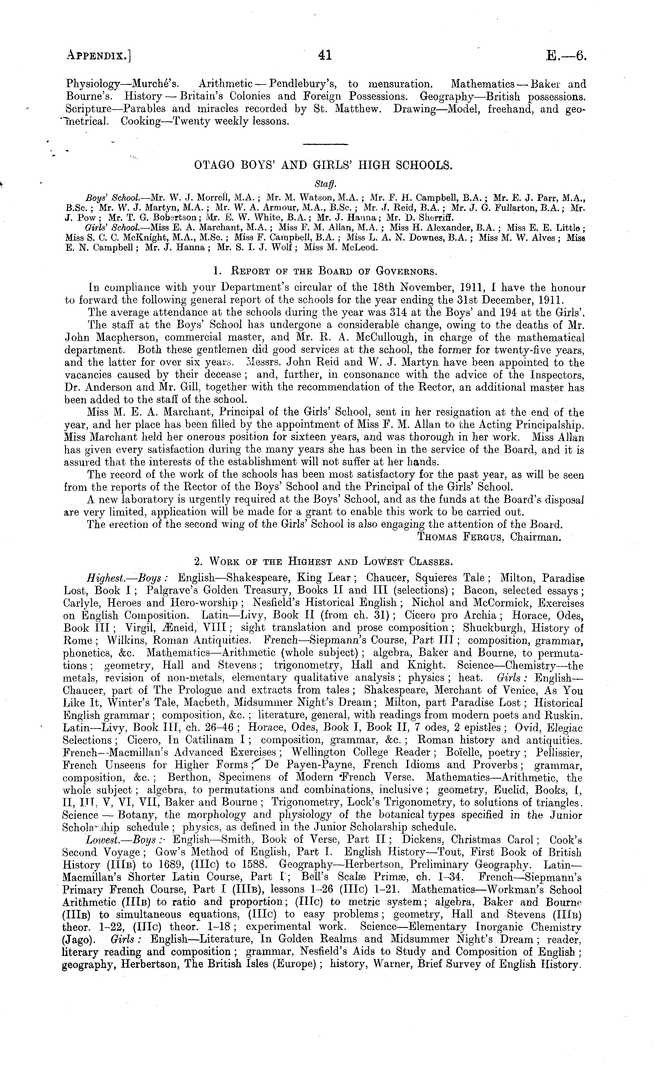 OTAGO BOYS' AND GIRLS' HIGH SCHOOLS. Staff. Boys' School.—Mi. W. J. Morrell, M.A. ; Mr. M. Watson, M.A. ; Mr. F. H. Campbell, B.A. ; Mr. E. J. Parr, M.A., B.Sc. ; Mr. W. J. Martyn, M.A. ; Mr. W. A. Armour, M.A., B.Sc. ; Mr. J. Reid, 8.A.; Mr. J. G. Fullarton, 8.A.; Mr. J. Pow; Mr. T. G. Bob-jrtsou; Mr. E. W. White, 8.A.; Mr. J. Haana; Mr. B. SlierriS. Girls' School— Miss E. A. Marchant, M.A. ; Miss F. M. Allan, M.A. ; Miss H. Alexander, B.A. ; Miss E. E. Little; Miss S. C. C. McKnight, M.A., M.Se. ; Miss F. Campbell, B.A. ; Miss L. A. N. Dowries, 8.A.; Miss M. W. Alves; Miss E. N. Campbell; Mr. J. Hanna; Mr. S. I. J. Wolf; Miss M. McLeod. 1. Report of the Board of Governors. In compliance with your Department's circular of the 18th November, 1911, I have the honour to forward the following general report of the schools for the year ending the 31st December, 1911. The average attendance at the schools during the year was 314 at the Boys' and 194 at the Girls'. The staff at the Boys' School has undergone a considerable change, owing to the deaths of Mr. John Macpherson, commercial master, and Mr. R. A. McCullough, in charge of the mathematical department. Both these gentlemen did good services at the school, the former for twenty-five years, and the latter for over six yeard. Messrs. John Reid and W. J. Martyn have been appointed to the vacancies caused by their decease ; and, further, in consonance with the advice of the Inspectors, Dr. Anderson and Mr. Gill, together with the recommendation of the Rector, an additional master has been added to the staff of the school. Miss M. E. A. Marchant, Principal of the Girls' School, sent in her resignation at the end of the year, and her place has been filled by the appointment of Miss F. M. Allan to the Acting Principalship. Miss Marchant held her onerous position for sixteen years, and was thorough in her work. Miss Allan has given every satisfaction during the many years she has been in the service of the Board, and it is assured that the interests of the establishment will not suffer at her hands. The record of the work of the schools has been most satisfactory for the past year, as will be seen from the reports of the Rector of the Boys' School and the Principal of the Girls' School. A new laboratory is urgently required at the Boys' School, and as the funds at the Board's disposal are very limited, application will be made for a grant to enable this work to be carried out. The erection of the second wing of the Girls' School is also engaging the attention of the Board. Thomas Fergus, Chairman. 2. Work of the Highest and Lowest Classes. Highest. — Boys : English —Shakespeare, King Lear ; Chaucer, Squieres Tale ; Milton, Paradise Lost, Book I ; Palgrave's Golden Treasury, Books II and 111 (selections) ; Bacon, selected essays ; Carlyle, Heroes and Hero-worship ; Nesfield's Historical English ; Nichol and McCormick, Exercises on English Composition. Latin—Livy, Book II (from eh. 31) ; Cicero pro Archia ; Horace, Odes, Book 111 ; Virgil, jEneid, VIII ; sight translation and prose composition ; Shuckburgh, History of Rome ; Wilkins, Roman Antiquities. French —Siepmann's Course, Part 111 ; composition, grammar, phonetics, &c. Mathematics —Arithmetic (whole subject) ; algebra, Baker and Bourne, to permutations ; geometry, Hall and Stevens; trigonometry, Hall and Knight. Science—Chemistry—the metals, revision of non-metals, elementary qualitative analysis ; physics ; heat. Girls : English— Chaucer, part of The Prologue and extracts from tales ; Shakespeare, Merchant of Venice, As You Like It, Winter's Tale, Macbeth, Midsummer Night's Dream; Milton, part Paradise Lost; Historical English grammar ; composition, &c. ; literature, general, with readings from modern poets and Ruskin. Latin —Livy, Book 111, eh. 26-46 ; Horace, Odes, Book I, Book 11, 7 odes, 2 epistles ; Ovid, Elegiac Selections ; Cicero, In Catilinam I ; composition, grammar, &c. ; Roman history and antiquities. French —Macmillan's Advanced Exercises ; Wellington College Reader; Bo'ielle, poetry ; Pellissier, French Unseens for Higher Forms fDe Payen-Payne, French Idioms and Proverbs; grammar, composition, &c. ; Berthon, Specimens of Modern 'French Verse. Mathematics—Arithmetic, the whole subject; algebra, to permutations and combinations, inclusive ; geometry, Euclid, Books, I, 11, ITT. V, VI, VII, Baker and Bourne ; Trigonometry, Lock's Trigonometry, to solutions of triangles. Science — Botany, the morphology and physiology of the botanical types specified in the Junior Schola , jhip schedule ; physics, as defined in the Junior Scholarship schedule. Lowest. — Boys :■ English —Smith, Book of Verse, Part II; Dickens, Christmas Carol; Cook's Second Voyage ; Gow's Method of English, Part I. English History —Tout, First Book of British History (IHb) to 1689, (IIIc) to 1588. Geography—Herbertson, Preliminary Geography. Latin— Macmillan's Shorter Latin Course, Part I ; Bell's Scalae Primse, eh. 1-34. French—Siepmann's Primary French Course, Part I (IIIb), lessons 1-26 (IIIc) 1-21. Mathematics—Workman's School Arithmetic (IIIb) to ratio and proportion; (IIIc) to metric system; algebra, Baker and Bourne (IIIb) to simultaneous equations, (IIIc) to easy problems; geometry, Hall and Stevens (IIIb) theor. 1-22, (IIIc) theor. 1-18; experimental work. Science—Elementary Inorganic Chemistry (Jago). Girls: English—Literature, In Golden Realms and Midsummer Night's Dream; reader, literary reading and composition ; grammar, Nesfield's Aids to Study and Composition of English ; geography, Herbertson, The British Isles (Europe) ; history, Warner, Brief Survey of English History.