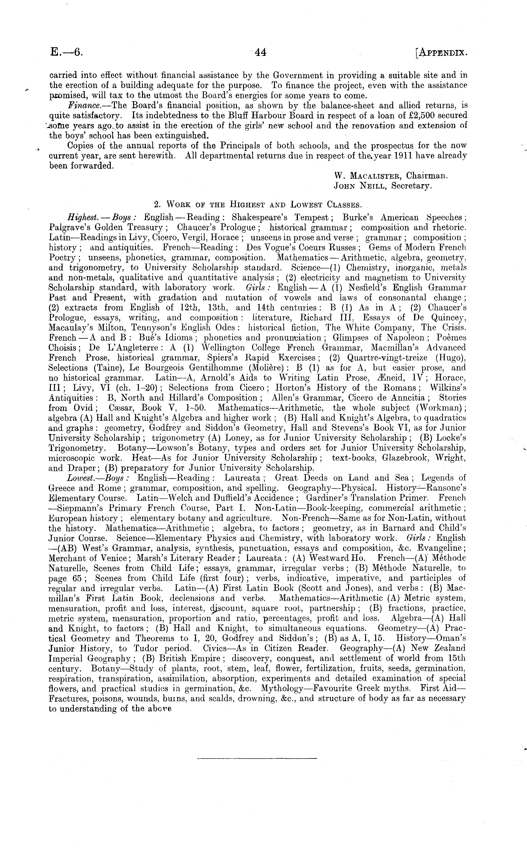 carried into effect without financial assistance by the Government in providing a suitable site and in the erection of a building adequate for the purpose. 'Co finance the project, even with the assistance promised, will tax to the utmost the Board's energies for some years to come. Finance. —The Board's financial position, as shown by the balance-sheet and allied returns, is quite satisfactory. Its indebtedness to the Bluff Harbour Board in respect of a loan of £2,500 secured .some years ago to assist in the erection of the girls' new school and the renovation and extension of the boys' school has been extinguished. Copies of the annual reports of the Principals of both schools, and the prospectus for the now current year, are sent herewith. All departmental returns due in respect of the,year 1911 have already been forwarded. W. Macalistee, Chairman. John Neill, Secretary. 2. Work of the Highest and Lowest Classes. Highest. — Boys: English — Reading: Shakespeare's Tempest; Burkes American Speeches; Palgrave's Golden Treasury ; Chaucer's Prologue ; historical grammar ; composition and rhetoric. Latin —Readings in Livy, Cicero, Vergil, Horace ; unseens in prose and verse ; grammar ; composition ; history ; and antiquities. French —Reading : Dcs Vogue's Coeurs Russes ; Gems of Modern French Poetry ; unseens, phonetics, grammar, composition. Mathematics — Arithmetic, algebra, geometry. and trigonometry, to University Scholarship standard. Science —(1) Chemistry, inorganic, metals and non-metals, qualitative and quantitative analysis ; (2) electricity and magnetism to University Scholarship standard, with laboratory work. Girls: English — A (1) Nesfield's English Grammar Past and Present, with gradation and mutation of vowels and laws of consonantal change; (2) extracts from English of 12th, 13th, and 14th centuries: B (1) As in A; (2) Chaucer's Prologue, essays, writing, and composition : literature, Richard 111, Essays of De Quincey, Macaulay's Milton, Tennyson's English Odes : historical fiction, The White Company, The Crisis. French — A and B: Bue's Idioms; phonetics and pronunciation; Glimpses of Napoleon; Poemes Choisis; De L'Angleterre : A (1) Wellington College French Grammar, Macmillan's Advanced French Prose, historical grammar, Spiers's Rapid Exercises; (2) Quartre-vingt-treize (Hugo), Selections (Tame), Le Bourgeois Gentilhomme (Moliere) : B (1) as for A, but easier prose, and no historical grammar. Latin —A, Arnold's Aids to Writing Latin Prose, iEneid, IV ; Horace, III; Livy, VI (eh. 1-20) ; Selections from Cicero; Horton's History of the Romans ; Wilkins's Antiquities : B, North and Hillard's Composition ; Allen's Grammar, Cicero de Anncitia ; Stories from Ovid; Caesar, Book V, 1-50. Mathematics—Arithmetic, the whole subject (Workman); algebra (A) Hall and Kuight's Algebra and higher work ; (B) Hall and Knight's Algebra, to quadratics and graphs : geometry, Godfrey and Siddon's Geometry, Hall and Stevens's Book VI, as for Junior University Scholarship ; trigonometry (A) Loney, as for Junior University Scholarship ; (B) Locke's Trigonometry. Botany —Lowson's Botany, types and orders set for Junior University Scholarship, microscopic work. Heat—As for Junior University Scholarship ; text-books, Glazebrook, Wright, and Draper; (B) preparatory for Junior University Scholarship. Lamest. — Boys : English—Reading : Laureata : Great Deeds on Land and Sea ; Legends of Greece and Rome ; grammar, composition, and spelling. Geography —Physical. History —Ransone's Elementary Course. Latin—Welch and Dufrield's Accidence ; Gardiner's Translation Primer. French —Siepmann's Primary French Course, Part I. Non-Latin —Book-keeping, commercial arithmetic ; European history ; elementary botany and agriculture. Non-French —Same as for Non-Latin, without the history. Mathematics—Arithmetic ; algebra, to factors ; geometry, as in Barnard and Child's Junior Course. Science —Elementary Physics and Chemistry, with laboratory work. Girls: English —(AB) West's Grammar, analysis, synthesis, punctuation, essays and composition, &c. Evangeline; Merchant of Venice; Marsh's Literary Reader ; Laureata : (A) Westward Ho. French— (A) Methode Naturelle, Scenes from Child Life; essays, grammar, irregular verbs; (B) Methode Naturelle, to page 65 ; Scenes from Child Life (first four) ; verbs, indicative, imperative, and participles of regular and irregular verbs. Latin —(A) First Latin Book (Scott and Jones), and verbs : (B) Macmillan's First Latin Book, declensions and verbs. Mathematics —-Arithmetic (A) Metric system, mensuration, profit and loss, interest, discount, square root, partnership ; (B) fractions, practice, metric system, mensuration, proportion and ratio, percentages, profit and loss. Algebra —(A) Hall and Knight, to factors ; (B) Hall and Knight, to simultaneous equations. Geometry—(A) Practical Geometry and Theorems to I, 20, Godfrey and Siddon's ; (B) as A, 1, 15. History—Oman's Junior History, to Tudor period. Civics—As in Citizen Reader. Geography —(A) New Zealand Imperial Geography ; (B) British Empire ; discovery, conquest, and settlement of world from 15th century. Botany —Study of plants, root, stem, leaf, flower, fertilization, fruits, seeds, germination, respiration, transpiration, assimilation, absorption, experiments and detailed examination of special flowers, and practical studies in germination, &c. Mythology —Favourite Greek myths. First Aid — Fractures, poisons, wounds, bums, and scalds, drowning, &c, and structure of body as far as necessary to understanding of the above