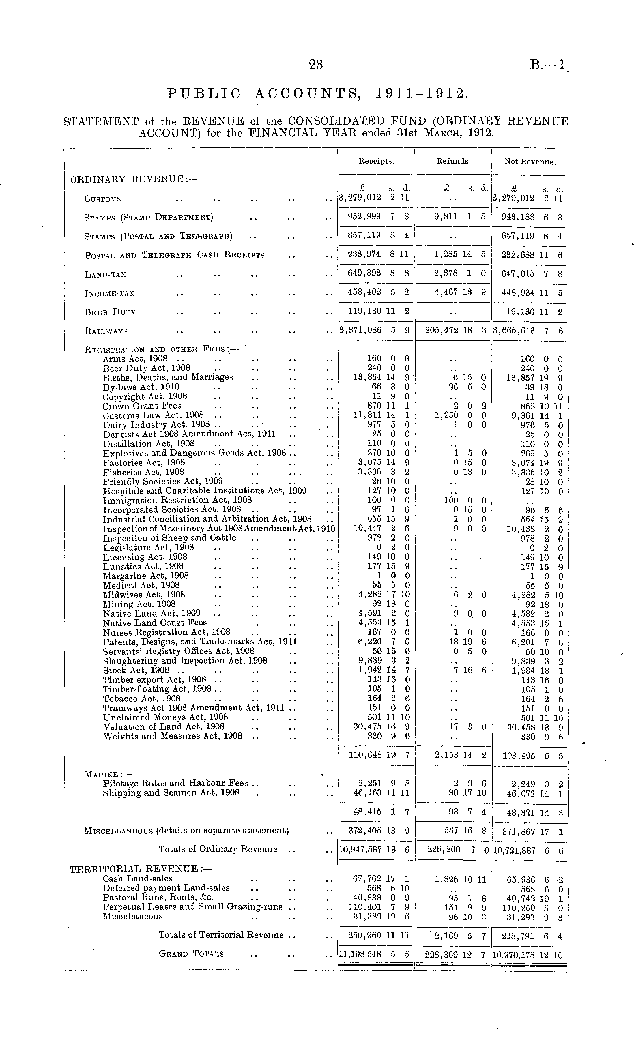 Receipts. Refunds. Net Revenue. ORDINARY REVENUE:— Customs £ s. d. 3,279,012 2 11 £ s. a. £ s. d. 13,279,012 2 11 Stamps (Stamp Department) 952,999 7 8 9,811 1 5 943,188 6 3 Stamps (Postal and Telegraph) 857,119 8 4 857,119 8 4 Postal and Telegraph Cash Receipts 233,974 8 11 649,393 8 8 1,285 14 5 232,688 14 6 Land-tax 2,378 1 0 647,015 7 8 Income-tax 453,402 5 2 4,467 13 9 448,934 11 5 Beer Duty 119,130 11 2 119,130 11 2 Railways 3,871,086 5 9 205,472 18 3 13,665,613 7 6 Registration and other Fees :— Arms Act, 1908 Beer Duty Act, 1908 Births, Deaths, and Marriages By-laws Act, 1910 Copyright Act, 1908 Crown Grant Fees Customs Law Act, 1908 Dairy Industry Act, 1908 Dentists Aot 1908 Amendment Act, 1911 Distillation Act, 1908 Explosives and Dangerous Goods Act, 1908 Factories Act, 1908 Fisheries Act, 1908 Friendly Societies Act, 1909 Hospitals and Charitable Institutions Act, 1909 Immigration Restriction Act, 1908 Incorporated Societies Act, 1908 Industrial Conciliation ana Arbitration Act, 1908 Inspection of Machinery Act 1908 Amenament Act, 1910 Inspection of Sheep ana Cattle Legislature Act, 1908 Licensing Act, 1908 Lunatics Act, 1908 Margarine Act, 1908 Meaical Aot, 1908 Midwives Act, 1908 Mining Act, 1908 Native Land Act, 1909 Native Land Court Fees Nurses Registration Act, 1908 Patents, Designs, and Trade-marks Act, 1911 Servants' Registry Offices Act, 1908 Slaughtering and Inspection Act, 1908 Stock Act, 1908 Timber-export Act, 1908 Timber-floating Act, 1908 Tobacco Act, 1908 Tramways Act 1908 Amendment Act, 1911 Unclaimed Moneys Act, 1908 Valuation of Land Act, 1908 Weights and Measures Act, 1908 160 0 0 240 0 0 13,864 14 9 66 3 0 11 9 0 870 11 1 11,311 14 1 977 5 0 25 0 0 110 0 0 270 10 0 3,075 14 9 3,336 3 2 28 10 0 127 10 0 100 0 0 97 1 6 555 15 9 10,447 2 0 978 2 0 0 2 0 149 10 0 177 15 9 10 0 55 5 0 4,282 7 10 92 18 0 4,591 2 0 4,553 15 1 167 0 0 6,220 7 0 50 15 0 9,839 3 2 1,942 14 7 143 16 0 105 1 0 164 2 6 151 0 0 501 11 10 30,475 16 9 330 9 6 6 15 0 ; 26 5 0 2 0 2; 1,950 0 0 10 0 15 0 0 15 0 0 13 0 100 0 0 0 15 0 10 0 9 0 0 160 0 0 240 0 0 13,857 19 9 39 18 0 11 9 0 868 10 11 9,361 14 1 976 5 0 25 0 0 110 0 0 269 5 0 3,074 19 9 3,335 10 2 28 10 0 127 10 0 96 6 6 554 15 9 10,438 2 6 978 2 0 0 2 0 149 10 0 177 15 9 10 0 55 5 0 4,282 5 10 92 IS 0 4,582 2 0 4,553 15 1 166 0 0 6,201 7 6 50 10 0 9,839 3 2 1,934 18 1 143 16 0 105 1 0 164 2 6 151 0 0 501 11 10 30,458 13 9 330 9 6 •• 0 2 0 9 0. 0 10 0 18 19 6 | 0 5 0 7 16 6 17 3 0 2,153 14 2 108,495 5 5 110,648 19 7 Marine :— Pilotage Rates and Harbour Fees Shipping and Seamen Act, 1908 2,251 9 8 46,163 11 11 2 9 6 90 17 10 2,249 0 2 46,072 14 1 48,415 1 7 93 7 4 48,321 14 3 Miscellaneous (details on separate statement) 371,867 17 1 372,405 13 9 537 16 8 Totals of Ordinary Revenue 10,947,587 13 6 226,200 7 0 10,721,387 6 6 TERRITORIAL REVENUE:— Cash Land-sales Deferred-payment Land-sales .. Pastoral Runs, Rents, &c. Perpetual Leases and Small Grazing-runs Miscellaneous 67,762 17 1 568 6 10 40,838 0 9 110,401 7 9 31,389 19 6 1,826 10 11 95 1 8 151 2 9 96 10 3 65,936 6 2 568 6 10 40,742 19 1 110,250 5 0 31,293 9 3 Totals of Territorial Revenue 250,960 11 11 '2,169 5 7 248,791 6 4 Grand Totals 10,970,178 12 10 11,198,548 5 5 228,369 12 7
