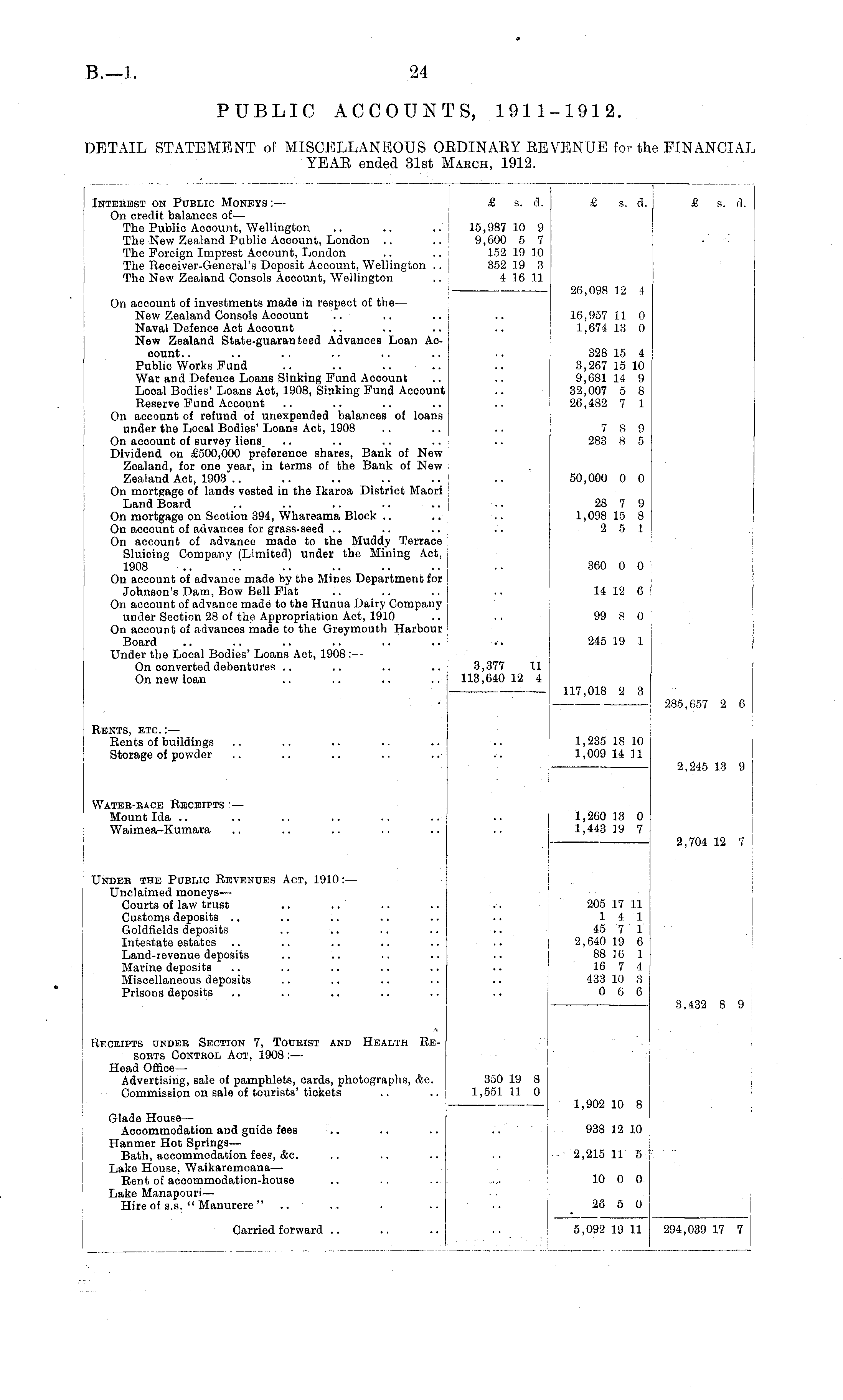 Interest on Public Moneys :— On creait balances of— The Public Account, Wellington The New Zealand Public Account, London The Foreign Imprest Account, London The Receiver-General's Deposit Account, Wellington .. The New Zealand Consols Account, Wellington £ s. a. £ s. d. £ s. a. 15,987 10 9 9,600 5 7 152 19 10 352 19 3 4 16 11 26,098 12 4 On aocount of investments made in respect of the— New Zealand Consols Aocount Naval Defence Act Account New Zealand State-guaranteed Advances Loan Acoount Publio Works Fund War and Defence Loans Sinking Fund Account Looal Bodies' Loans Act, 1908, Sinking Funa Acoount Reserve Fund Acoount On account of refund of unexpended balances of loans under the Local Bodies' Loans Aot, 1908 On account of survey liens Dividend on £500,000 preference shares, Bank of New Zealand, for one year, in terms of the Bank of New Zealand Act, 1903 On mortgage of lands vested in the Ikaroa District Maori Land Board On mortgage on Section 394, Whareama Block On account of advances for grass-seed On account of advance made to the Muddy Terrace Sluicing Company (Limited) under the Mining Act, 1908 On account of advance made by the Mines Department for Johnson's Dam, Bow Bell Flat On account of advance made to the Hunua Dairy Company under Section 28 of the Appropriation Act, 1910 On account of advances made to the Greymouth Harbour Board Under the Local Bodies' Loans Act, 1908 :— On converted debentures On new loan 16,957 11 0 1,674 13 0 328 15 4 3,267 15 10 9,681 14 9 32,007 5 8 26,482 7 1 7 8 9 283 8 5 50,000 0 0 28 7 9 1,098 15 8 2 5 1 360 0 0 14 12 6 99 8 0 245 19 1 3,377 11 113,640 12 4 117,018 2 3 Rents, etc. :— Rents of buildings Storage of powder 285,657 2 6 1,235 18 10 1,009 14 11 2,245 13 9 Water-race Receipts :— Mount Ida Waimea-Kumara 1,260 13 0 1,443 19 7 2,704 12 7 Under the Public Revenues Act, 1910:— Unclaimed moneys — Courts of law trust Customs deposits Goldflelds deposits Intestate estates Land-revenue deposits Marine deposits Miscellaneous deposits Prisons deposits 205 17 11 14 1 45 7 1 2,640 19 6 88 16 1 16 7 4 433 10 3 0 6 6 3,432 8 9 Receipts under Section 7, Tourist and Health Resorts Control Act, 1908 :— Head Office— Advertising, sale of pamphlets, cards, photographs, Ac. Commission on sale of tourists' tickets 350 19 8 1,551 11 0 1,902 10 8 Glade House— Accommoaation and guide fees Hanmer Hot Springs— Bath, accommodation fees, &c. Lake House, Waikaremoana — Rent of accommodation-house Lake Manapouri— Hire of s.s. " Manurere " 938 12 10 2,215 11 5 10 0 0 26 5 0 Carried forward 5,092 19 11 294,039 17 7