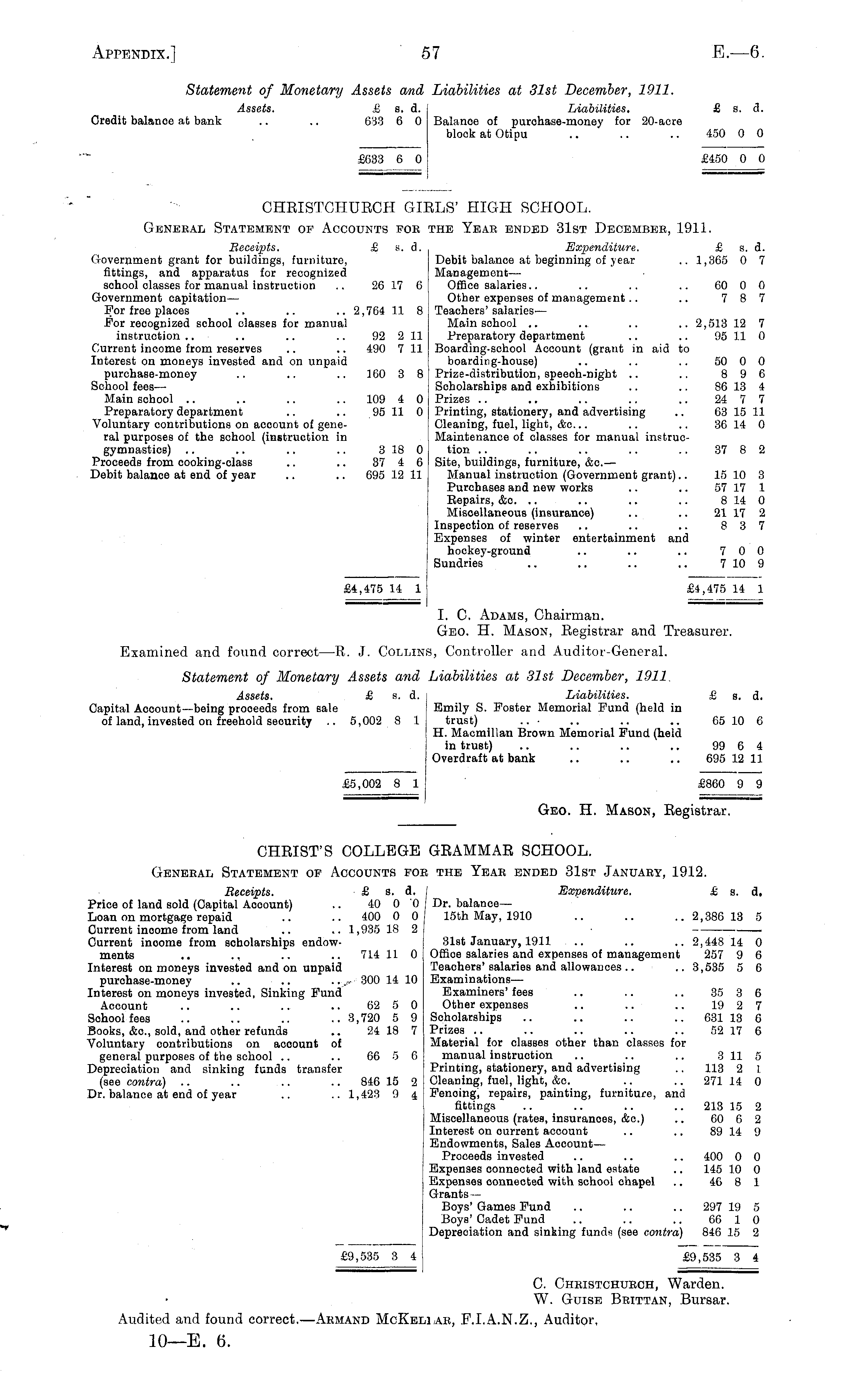 CHRISTCHUECH GIRLS' HIGH SCHOOL. Genbbal Statement op Accounts foe the Yeae ended 31st December, 1911. Receipts. £ s. d. Expenditure. £ s. d. Government grant for buildings, furniture, Debit balanoe at beginning of year .. 1,365 0 7 fittings, and apparatus for recognized Management— school classes for manual instruction .. 26 17 6 Office salaries.. .. .. .. 60 0 0 Government capitation— Other expenses of management.. .. 7 8 7 For free places .. .. .. 2,764 11 8 Teachers'salaries— For recognized school claßses for manual Main school .. .. .. .. 2,513 12 7 instruction .. .. .. .. 92 211 Preparatory department .. .. 95 11 0 Current income from reserves .. .. 490 7 11 Boarding-school Account (grant in aid to Interest on moneys invested and on unpaid boarding-house) .. .. .. 50 0 0 purchase-money .. .. .. 160 3 8 Prize-distribution, speeoh-night .. .. 8 9 6 School fees— Soholarshipe and exhibitions .. .. 86 13 4 Main sohool .. .. .. 109 i 0 Prizes .. .. .. .. .. 24 7 7 Preparatory department .. .. 95 11 0 Printing, stationery, and advertising .. 63 15 11 Voluntary contributions on account of gene- Gleaning, fuel, light, &c.. .. .. 36 14 0 ral purposes of the school (instruction in Maintenance of classes for manual instrucgymnastics) .. .. .. .. 318 0 tion .. .. .. .. .. 37 8 2 Proceeds from cooking-class .. .. 37 4 6 Site, buildings, furniture, &c.— Debit balance at end of year .. .. 695 12 11 Manual instruction (Government grant).. 15 10 3 Purchases and new works .. .. 57 17 1 Eepairs, &c. .. .. .. .. 8 14 0 Miscellaneous (insurance) .. .. 21 17 2 Inspection of reserves .. .. .. 8 3 7 Expenses of winter entertainment and hockey-ground .. .. .. 7 0 0 Sundries .. .. .. .. 7 10 9 £4,475 14 1 £4,475 14 1 I. C. Adams, Chairman. Geo. H. Mason, Registrar and Treasurer. Examined and found correct —R. J. Collins, Controller and Auditor-General. Statement of Monetary Assets and Liabilities at 31st December, 1911 Assets. £ a. d. i Liabilities. £ s. d. Capital Account—being prooeeds from sale Emily S. Foster Memorial Fund (held in of land, invested on freehold security .. 5,002 8 1 trust) .. • .. .. .. 65 10 6 H. Macmillan Brown Memorial Fund (held in trust) .. .. .. .. 99 6 4 Overdraft at bank .. .. .. 695 12 11 £5,002 8 1 £860 9 9 Geo. H. Mason, Registrar.