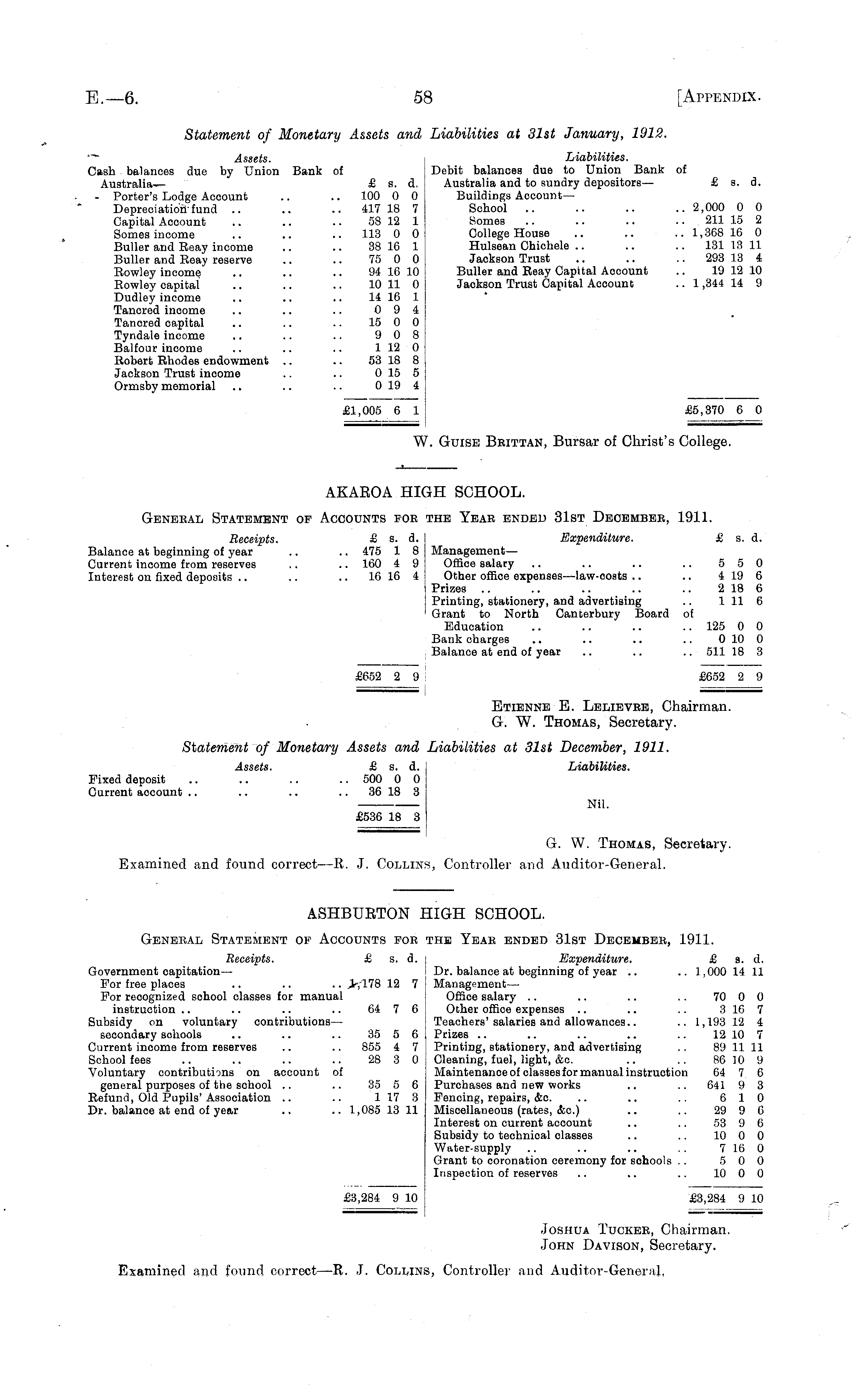 AKAEOA HIGH SCHOOL. Geneeal Statement op Accounts fob the Year ended 31st December, 1911. Receipts. £ s. d. Expenditure. £ s. d. Balance at beginning of year .. .. 475 1 8 ManagementCurrent income from reserves .. .. 160 4 9 Office salary .. .. .. .. 5 5 0 Interest on fixed deposits .. .. .. 16 16 4 Other office expenses—law-oosts .. .. 419 6 Prizes .. .. .. .. .. 2 18 6 Printing, stationery, and advertising .. 111 6 ' Grant to North Canterbury Board of Education .. .. .. .. 125 0 0 Bank charges .. .. .. .. 0 10 0 Balance at end of year .. .. .. 511 18 3 £652 2 9 < £652 2 9 Etienne E. Lelievre, Chairman. G. W. Thomas, Secretary. Statement of Monetary Assets and Liabilities at 31st December, 1911. Assets. £ s. d. Liabilities. Fixed deposit .. .. .. .. 500 0 0 Current account .. .. .. 36 18 3 Nil. £536 18 3 G. W. Thomas, Secretary. Examined and found correct —It. J. Collins, Controller and Auditor-General.