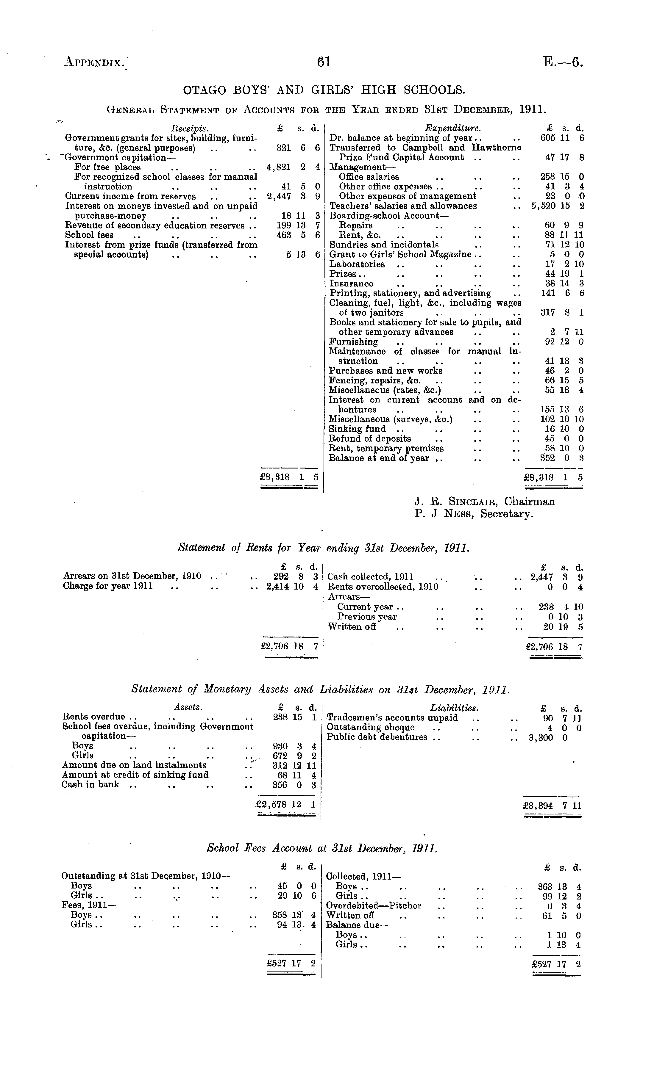 OTAGO BOYS' AND GIRLS' HIGH SCHOOLS. General Statement of Accounts fob the Year ended 31st December, 1911. Receipts, £ s. d. Expenditure. £ s. d. Government grante for sites, building, furni- Dr. balance at beginning of year.. .. 605 11 6 ture, &c. (general purposes) .. .. 821 6 6 Transferred to Campbell and Hawthorne • "Government capitation— Prize Fund Capital Account .. .. 47 17 8 For free places .. .. .. 4,821 2 4 Management— For recognized sohool classes for manual Office salaries .. .. .. 258 15 0 instruction .. .. .. 41 5 0 Other office expenses .. .. .. 41 3 4 Current income from reserves .. .. 2,447 3 9 Other expenses of management .. 23 0 0 Interest on moneys invested and on unpaid Teachers'salaries and allowances .. 5,520 15 2 purchase-money .. .. .. 18 11 3 Boarding-school Account— Revenue of secondary education reserves .. 199 13 7 Repairs .. .. .. .. 60 9 9 School fees .. .. .. .. 463 5 6 Bent, &c. .. .. .. .. 88 11 11 Interest from prize funds (transferred from Sundries and incidentals .. .. 71 12 10 speoial acoounts) .. .. .. 5 13 6 Grant io Girls' School Magazine .. .. 5 0 0 Laboratories .. .. .. .. 17 210 Prizes.. .. .. .. .. 44 19 1 Insurance .. .. .. .. 38 14 3 Printing, stationery, and advertising .. 141 6 6 Cleaning, fuel, light, &c, including wages of two janitors .. .. .. 317 8 1 Books and stationery for sale to pupils, and other temporary advances .. .. 2 7 11 Furnishing .. .. .. .. 92 12 0 Maintenance of classes for manual instruction .. .. .. .. 41 13 3 Purohases and new works .. .. 46 2 0 Fencing, repairs, &c. .. .. .. 66 15 5 Miscellaneous (rates, &c.) .. .. 55 18 4 Interest on ourrent account and on debentures .. .. .. .. 155 13 6 Miscellaneous (surveys, &c.) .. .. 102 10 10 Sinking fund .. .. .. .. 16 10 0 Refund of deposits .. .. .. 45 0 0 Rent, temporary premises .. .. 58 10 0 Balance at end of year .. .. .. 352 0 3 £8,318 1 5 £8,318 1 5 J. E. Sinclair, Chairman P. J Ness, Secretary. Statement of Rents for Year ending 31st December, 1911. £ s. d. f s. d. Arrears on 31st December, 1910 .. .. 292 8 3 Cash collected, 1911 .. .. .. 2,447 3 9 Charge for year 1911 .. .. .. 2,414 10 4 Rents overcollected, 1910 .. .. 0 0 4 Arrears— Current year .. .. .. .. 238 4 10 Previous year .. .. .. 0 10 3 Written off .. .. .. .. 20 19 5 £2,706 18 7 £2,706 18 7 Statement of Monetary Assets and Liabilities on 31st December, 1911. Assets. £ s. d. Liabilities. £ s. d. Rents overdue .. .. .. .. 238 15 1 Tradesmen's accounts unpaid .. .. 90 711 School fees overdue, including Government Outstanding oheque .. .. .. 4 0 0 capitation— Public debt debentures .. .. .. 3,300 0 Boys .. .. .. .. 930 3 4 Girls .. .. .. .. 672 9 2 Amount due on land instalments .. 312 12 11 Amount at credit of sinking fund .. 68 11 4 Cash in bank .. .. .. .. 356 0 3 £2,578 12 1 £3,394 7 11 School Fees Account at 31st December, 1911. £ s. d. £ s. d. Outstanding at 31st December, 1910— Collected, 1911— Boys .. .. .. .. 45 0 0 Boys.. .. .. .. .. 363 13 4 Girls .. .. ... .. .. 29 10 6 Girls .. .. .. .. .. 99 12 2 Fees, 1911— Overdebited—Pitcher .. .. .. 0 3 4 Boys .. .. .. .. 358 13' 4 Written off .. .. .. .. 61 5 0 Girls.. .. .. .. .. 94 13. 4 Balance dueBoys .. .. .. .. .. 1 10 0 Girls.. .. .. .. .. 1 13 4 £527 17 2 £527 17 2