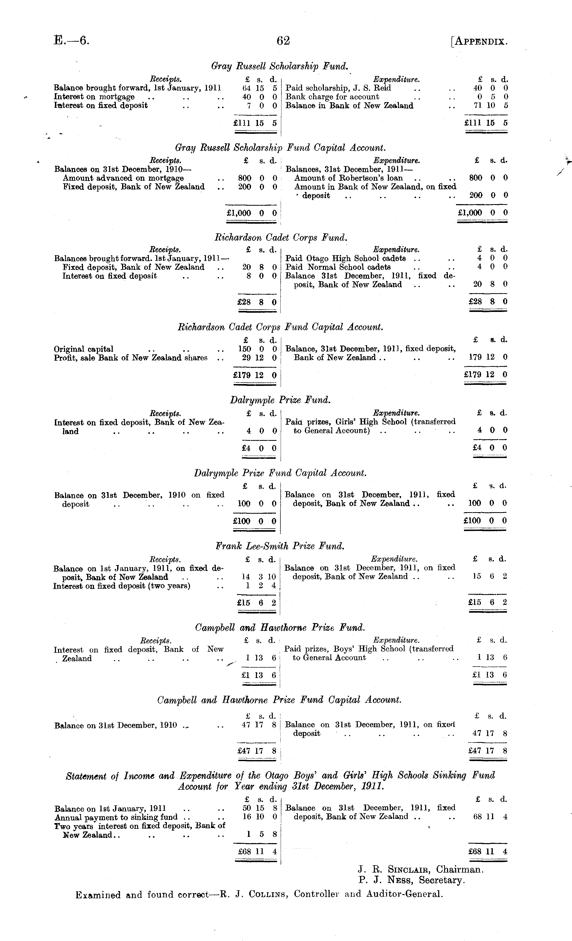 Gray Russell Scholarship Fund. Receipts. £ a. d. Expenditure. £ s. d. Balance brought forward, Ist January, 1911 t>4 15 5 Paid scholarship, J. S. Eeid .. .. 40 0 0 Interest on mortgage .. .. .. 40 0 0 I Bank charge for account .. .. 0 5 0 Interest on fixed deposit .. .. 7 00 j Balance in Bank of New Zealand .. 71 10 5 £111 15 5 £111 15 5 Gray Russell Scholarship Fund Capital Account. , Receipts. £ s. d. Expenditure. £ s. d. Balances on 31st December, 1910 — Balances, 31st December, 1911— Amount advanced on mortgage .. 800 0 0 Amount of Robertson's loan .. .. 800 0 0 Fixed deposit, Bank of New Zealand .. 200 0 0 Amount in Bank of New Zealand, on fixed • deposit .. .. .. .. 200 0 0 £1,000 0 0 £1,000 0 0 Richardson Cadet Corps Fund. Receipts. £ s. d. Expenditure. £ s. dBalances brought forward. Ist January, 1911— Paid Otago High School cadets .. .. 4 0 0 Fixed deposit, Bank of New Zealand .. 20 8 0 Paid Normal School cadets .. .. 4 0 0 Interest on fixed deposit .. .. 8 0 0 Balance 31st December, 1911, fixed deposit, Bank of New Zealand .. .. 20 8 0 £28 8 0 £28 8 0 Richardson Cadet Corps Fund Capital Account. £ s. d. £ s. d. Original capital .. .. .. 150 0 0 Balance, 31st December, 1911, fixed deposit, Profit, sale Bank of New Zealand shares .. 29 12 0 Bank of New Zealand .. .. .. 179 12 0 £179 12 0 £179 12 0 Dalrymple Prize Fund. Receipts. £ s. d. ] Expenditure. £ s. d. Interest on fixed deposit, Bank of New Zea- Paid prizes, Girls' High School (transferred land .. .. .. .. 4 0 0: to General Account) .. .. .. 4 0 0 £4 0 0 £4 0 0 Dalrymple Prize Fund Capital Account. £ s. d. I £ a. d. Balance on 31st December, 1910 on fixed i Balance on 31st December, 1911. fixed deposit .. .. .. 100 0 0 deposit, Bank of New Zealand .. .. 100 0 0 £100 0 0 £100 0 0 Frank Lee-Smith Prize Fund. Receipts. £ s. d. Expenditure. £ s. d. Balance on Ist January, 1911, on fixed de- Balance on 31st December, 1911, on fixed posit, Bank of New Zealand .. .. 14 310 deposit, Bank of New Zealand .. .. 15 6 2 Interest on fixed deposit (two years) .. 12 4 £15 6 2 : £15 6 2 Campbell and Hawthorne Prize Fund. Receipts. £ s. d. Expenditure. £ s. d. Interest on fixed deposit, Bank of New Paid prizes, Boys' High School (transferred Zealand .. .. .. .. 1 13 6 to General Account .. .. .. 1 13 6 s" • £1 13 6 £1 13 6 Campbell and Hawthorne Prize Fund Capital Account. £ s. d. j £ s. d. Balance on 31st December, 1910 .. .. 47 17 8 Balance on 31st December, 1911, on fixed deposit .. .. .. .. 47 17 8 £47 17 8 ; £47 17 8 Statement of Income and Expenditure of the Otago Boys' and Girls , High Schools Sinking Fund Account for Year ending 31st December, 1911. £ s. d. i £ s. d. Balance on Ist January, 1911 .. .. 50 15 8 Balance on 31st December, 1911, fixed Annual payment to sinking fund .. .. 16 10 0 deposit, Bank of New Zealand .. .. 68 11 4 Two years interest on fixed deposit, Bank of , New Zealand.. .. .. .. 1 5 8 i £68 11 4 £68 11 4 i J. E. Sinclaib, Chairman. P. J. Ness, Secretary. Examined and found correct —R. J. Collins, Controller and Auditor-General.