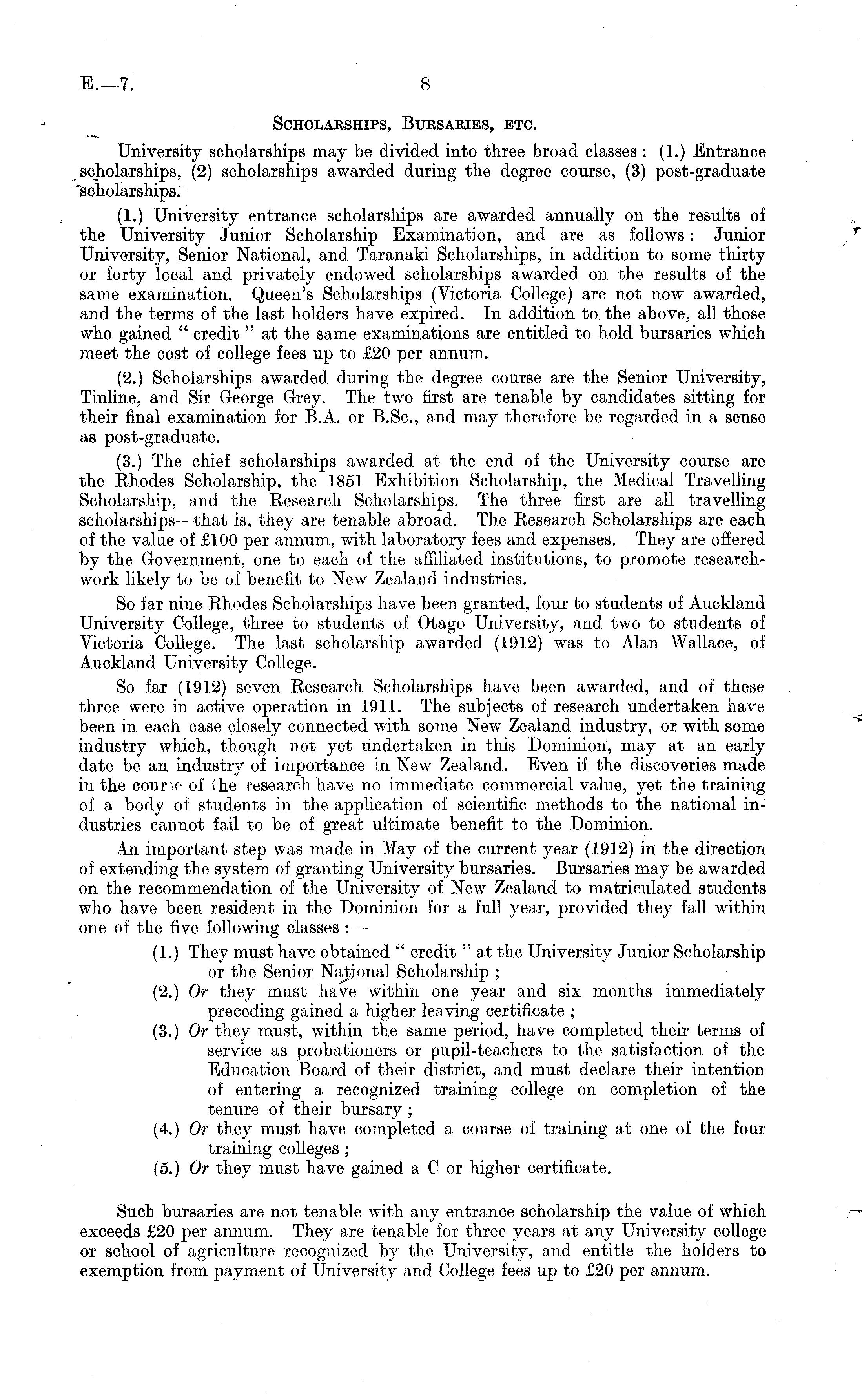 Scholarships, Bursaries, etc. University scholarships may be divided into three broad classes : (1.) Entrance scholarships, (2) scholarships awarded during the degree course, (3) post-graduate "scholarships. (1.) University entrance scholarships are awarded annually on the results of the University Junior Scholarship Examination, and are as follows: Junior University, Senior National, and Taranaki Scholarships, in addition to some thirty or forty local and privately endowed scholarships awarded on the results of the same examination. Queen's Scholarships (Victoria College) are not now awarded, and the terms of the last holders have expired. In addition to the above, all those who gained " credit " at the same examinations are entitled to hold bursaries which meet the cost of college fees up to £20 per annum. (2.) Scholarships awarded during the degree course are the Senior University, Tinline, and Sir George Grey. The two first are tenable by candidates sitting for their final examination for B.A. or B.Sc, and may therefore be regarded in a sense as post-graduate. (3.) The chief scholarships awarded at the end of the University course are the Rhodes Scholarship, the 1851 Exhibition Scholarship, the Medical Travelling Scholarship, and the Research Scholarships. The three first are all travelling scholarships—that is, they are tenable abroad. The Research Scholarships are each of the value of £100 per annum, with laboratory fees and expenses. They are offered by the Government, one to each of the affiliated institutions, to promote researchwork likely to be of benefit to New Zealand industries. So far nine Rhodes Scholarships have been granted, four to students of Auckland University College, three to students of Otago University, and two to students of Victoria College. The last scholarship awarded (1912) was to Alan Wallace, of Auckland University College. So far (1912) seven Research Scholarships have been awarded, and of these three were in active operation in 1911. The subjects of research undertaken have been in each case closely connected with some New Zealand industry, or with some industry which, though not yet undertaken in this Dominion, may at an early date be an industry of importance in New Zealand. Even if the discoveries made in the cour;e of the research have no immediate commercial value, yet the training of a body of students in the application of scientific methods to the national industries cannot fail to be of great ultimate benefit to the Dominion. An important step was made in May of the current year (1912) in the direction of extending the system of granting University bursaries. Bursaries may be awarded on the recommendation of the University of New Zealand to matriculated students who have been resident in the Dominion for a full year, provided they fall within one of the five following classes : — (1.) They must have obtained " credit " at the University Junior Scholarship or the Senior National Scholarship ; (2.) Or they must have within one year and six months immediately preceding gained a higher leaving certificate ; (3.) Or they must, within the same period, have completed their terms of service as probationers or pupil-teachers to the satisfaction of the Education Board of their district, and must declare their intention of entering a recognized training college on completion of the tenure of their bursary ; (4.) Or they must have completed a course of training at one of the four training colleges ; (5.) Or they must have gained a C or higher certificate. Such bursaries are not tenable with any entrance scholarship the value of which exceeds £20 per annum. They are tenable for three years at any University college or school of agriculture recognized by the University, and entitle the holders to exemption from payment of University and College fees up to £20 per annum.