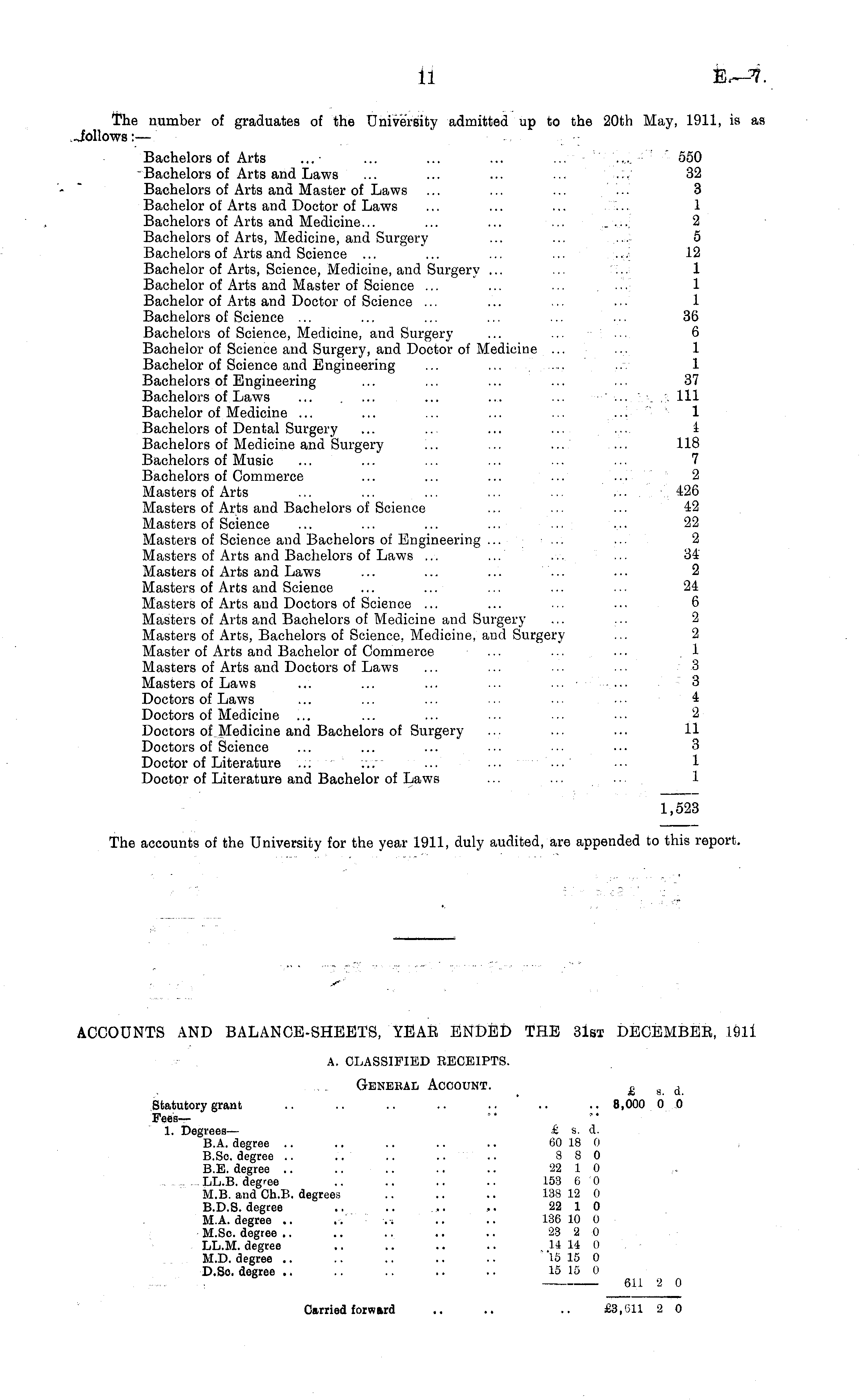 The number of graduates of the University admitted up to the 20th May, 1911, is as follows;— Bachelors of Arts ...■ ... ... ... ... ..... : 550 Bachelors of Arts and Laws ... ... ... ... ... 32 Bachelors of Arts and Master of Laws ... ... ... ... 3 Bachelor of Arts and Doctor of Laws ... ... ... ... 1 Bachelors of Arts and Medicine... ... ... ... .... 2 Bachelors of Arts, Medicine, and Surgery ... ... ... 5 Bachelors of Arts and Science ... ... ... ... ... 12 Bachelor of Arts, Science, Medicine, and Surgery ... ... ... 1 Bachelor of Arts and Master of Science ... ... ... . •••: 1 Bachelor of Arts and Doctor of Science ... ... ... ... 1 Bachelors of Science ... ... ... ... ... ... 36 Bachelors of Science, Medicine, and Surgery ... .;. ... 6 Bachelor of Science and Surgery, and Doctor of Medicine ... ... 1 Bachelor of Science and Engineering ... ... . ■■•• ■• 1 Bachelors of Engineering ... ... ... ... ... 37 Bachelors of Laws ... ... ... ... ... ...„,;. 11l Bachelor of Medicine ... ... ... ... ... ... 1 Bachelors of Dental Surgery ... ... ... ... ... 4 Bachelors of Medicine and Surgery ... ... ... ... 118 Bachelors of Music ... ... ... ... ... ... 7 Bachelors of Commerce ... ... ... ... ... 2 Masters of Arts ... ... ... ... ... .... 426 Masters of Arts and Bachelors of Science ... ... ... 42 Masters of Science ... ... ... ... ... ... 22 Masters of Science and Bachelors of Engineering ... ... ... 2 Masters of Arts and Bachelors of Laws ... ... ... ... 34 Masters of Arts and Laws ... ... ... ... ... 2 Masters of Arts and Science ... ... ... ... ... 24 Masters of Arts and Doctors of Science ... ... ... ... 6 Masters of Arts and Bachelors of Medicine and Surgery ... ... 2 Masters of Arts, Bachelors of Science, Medicine, and Surgery ... 2 Master of Arts and Bachelor of Commerce ... ... ... .1 Masters of Arts and Doctors of Laws ... ... - - • ... 3 Masters of Laws ... ... ... •-• ... - 3 Doctors of Laws ... ... ... • -• -•- ••• 4 Doctors of Medicine ... ... ... ... ■•• ••• 2 Doctors of Medicine and Bachelors of Surgery ... ... ... 11 Doctors of Science ... ... ... •-. •-■ ••• 3 Doctor of Literature ... ... ... •-• ... ... 1 Doctor of Literature and Bachelor of Laws ... ... .. 1 1,523 The accounts of the University for the year 1911, duly audited, are appended to this report.