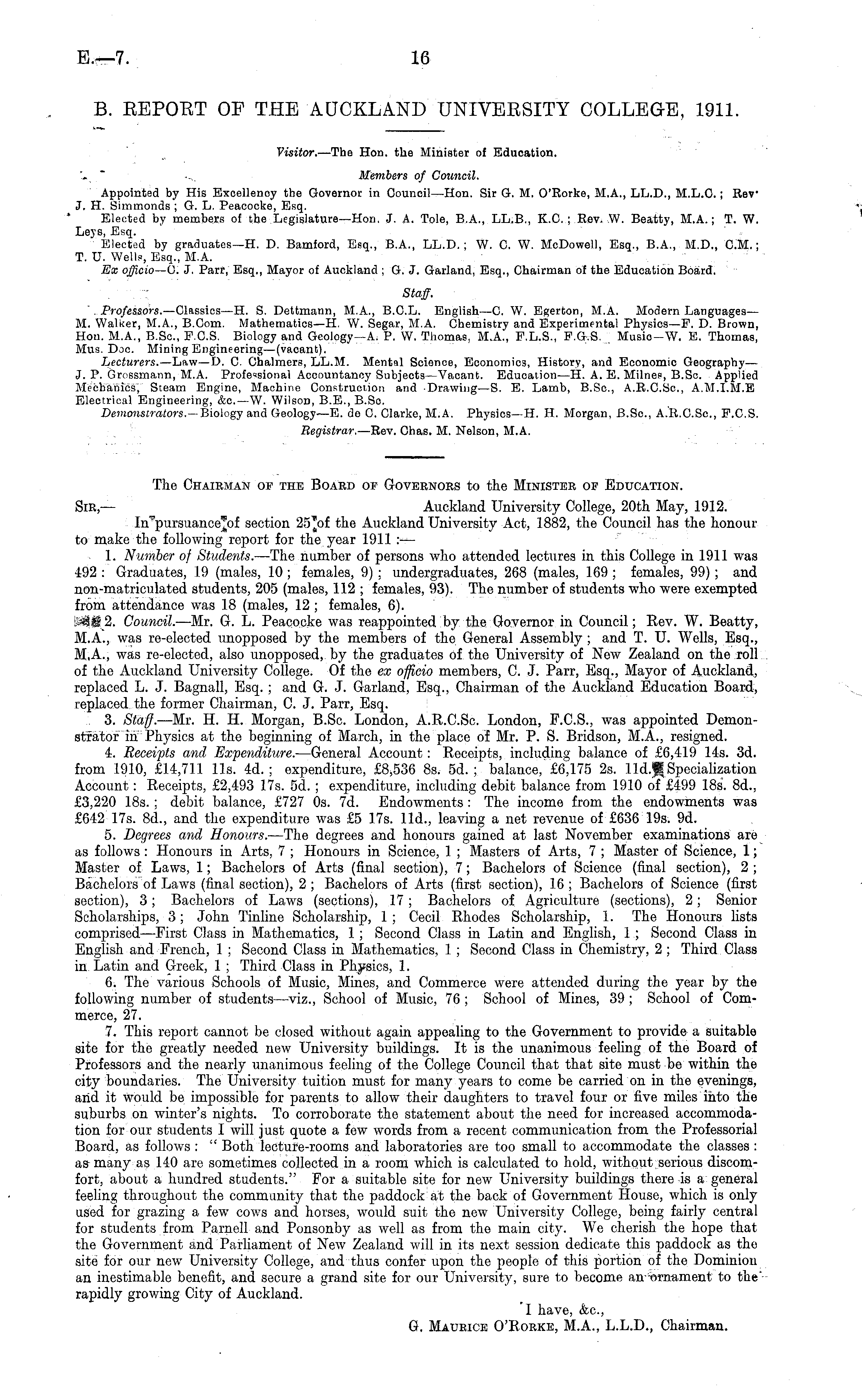 The Chairman op the Board op Governors to the Minister of Education. Sir,— Auckland University College, 20th May, 1912. In'pursuance'of section 25* of the Auckland University Act, 1882, the Council has the honour to make the following report for the year 1911 : — 1. Number of Students. —The number of persons who attended lectures in this College in 1911 was •192 : Graduates, 19 (males, 10 ; females, 9); undergraduates, 268 (males, 169 ; females, 99) ; and non-matriculated students, 205 (males, 112 ; females, 93). The number of students who were exempted from attendance was 18 (males, 12 ; females, 6). 2. Council. —Mr. G. L. Peacocke was reappointed by the Governor in Council; Eev. W. Beatty, M.A., was re-elected unopposed by the members of the General Assembly ; and T. U. Wells, Esq., M.A., was re-elected, also unopposed,, by the graduates of the University of New Zealand on the roll of the Auckland University College. Of the ex officio members, C. J. Parr, Esq., Mayor of Auckland, replaced L. J. Bagnall, Esq. ; and G. J. Garland, Esq., Chairman of the Auckland Education Board, replaced the former Chairman, C. J. Parr, Esq. 3. Staff. —Mr. H. H. Morgan, B.Sc. London, A.R.C.Sc. London, F.C.S., was appointed Demonstrator in Physics at the beginning of March, in the place of Mr. P. S. Bridson, M.A., resigned. 4. Receipts and Expenditure. —General Account: Receipts, including balance of £6,419 14s. 3d. from 1910, £14,711 lis. 4d. ; expenditure, £8,536 Bs. sd. ; balance, £6,175 2s. lld.J|Specialization Account: Receipts, £2,493 17s. sd. ; expenditure, including debit balance from 1910 of £499 18s. Bd., £3,220 18s.; debit balance, £727 os. 7d. Endowments: The income from the endowments was £642 17s. Bd., and the expenditure was £5 17s. lid., leaving a net revenue of £636 19s. 9d. 5. Degrees and Honours. —The degrees and honours gained at last November examinations are as follows: Honours in Arts, 7 ; Honours in Science, 1 ; Masters of Arts, 7 ; Master of Science, 1; Master of Laws, 1; Bachelors of Arts (final section), 7; Bachelors of Science (final section), 2 ; Bachelors of Laws (final section), 2; Bachelors of Arts (first section), 16; Bachelors of Science (first section), 3; Bachelors of Laws (sections), 17 ; Bachelors of Agriculture (sections), 2; Senior Scholarships, 3; John Tinline Scholarship, 1 ; Cecil Rhodes Scholarship, 1. The Honours lists comprised—First Class in Mathematics, 1; Second Class in Latin and English, 1 ; Second Class in English and French, 1 ; Second Class in Mathematics, 1 ; Second Class in Chemistry, 2 ; Third Class in Latin and Greek, 1 ; Third Class in Physics, 1. 6. The various Schools of Music, Mines, and Commerce were attended during the year by the following number of students —viz., School of Music, 76 ; School of Mines, 39 ; School of Commerce, 27. 7. This report cannot be closed without again appealing to the Government to provide a suitable site for the greatly needed new University buildings. It is the unanimous feeling of the Board of Professors and the nearly unanimous feeling of the College Council that that site must be within the city boundaries. The University tuition must for many years to come be carried on in the evenings, and it would be impossible for parents to allow their daughters to travel four or five miles into the suburbs on winter's nights. To corroborate the statement about the need for increased accommodation for our students I will just quote a few words from a recent communication from the Professorial Board, as follows : " Both lecture-rooms and laboratories are too small to accommodate the classes : as many as 140 are sometimes collected in a room which is calculated to hold, without serious discomfort, about a hundred students." For a suitable site for new University buildings there is a general feeling throughout the community that the paddock at the back of Government House, which is only used for grazing a few cows and horses, would suit the new University College, being fairly central for students from Parnell and Ponsonby as well as from the main city. We cherish the hope that the Government and Parliament of New Zealand will in its next session dedicate this paddock as the site for our new University College, and thus confer upon the people of this portion of the Dominiou an inestimable benefit, and secure a grand site for our University, sure to become an "ornament to the' rapidly growing City of Auckland. I have, &c, G. Maurice O'Rorke, M.A., L.L.D., Chairman.