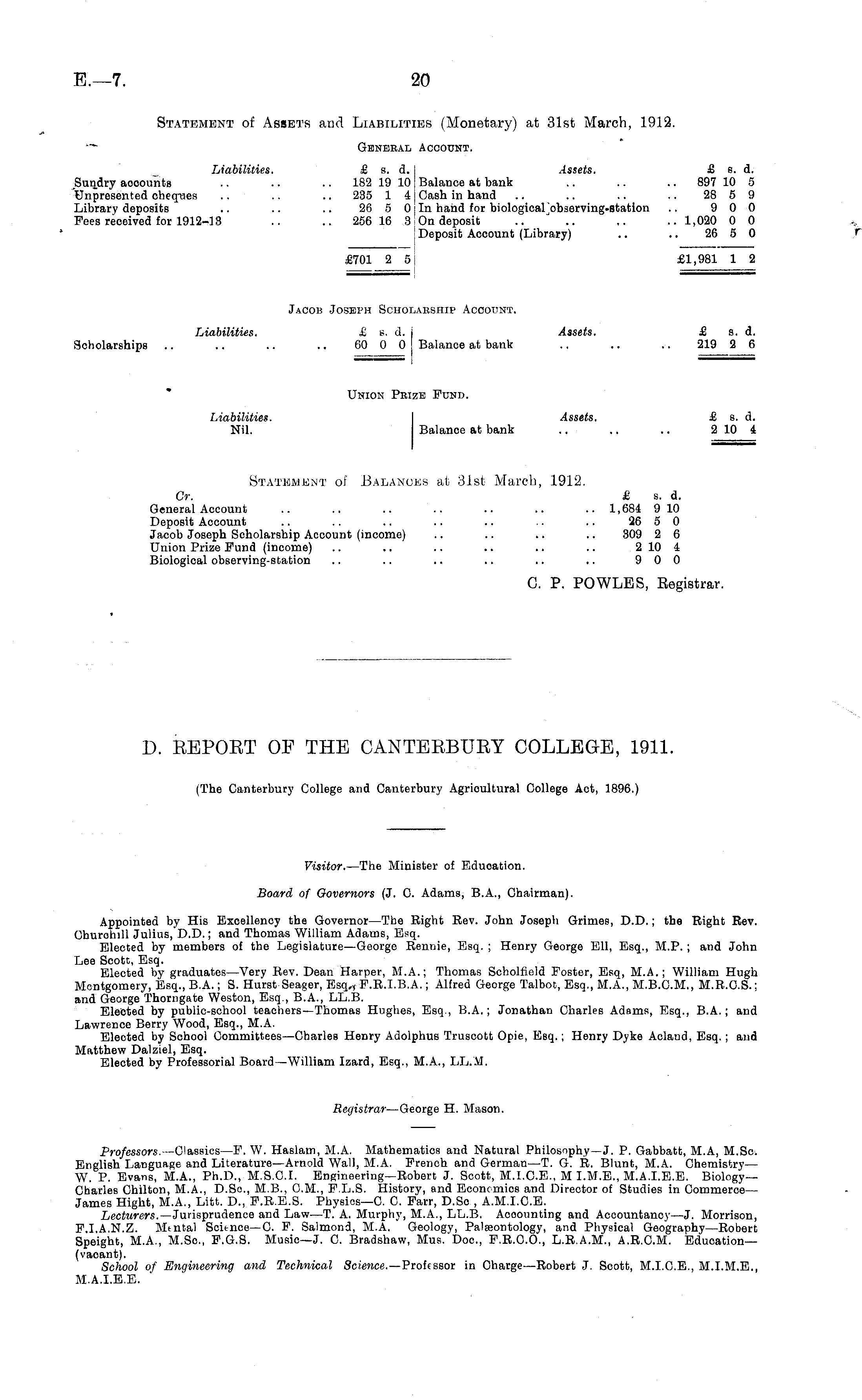 D. EEPOET OF THE CANTEEBUEY COLLEGE, 1911. (The Canterbury College and Canterbury Agricultural College Act, 1896.)
