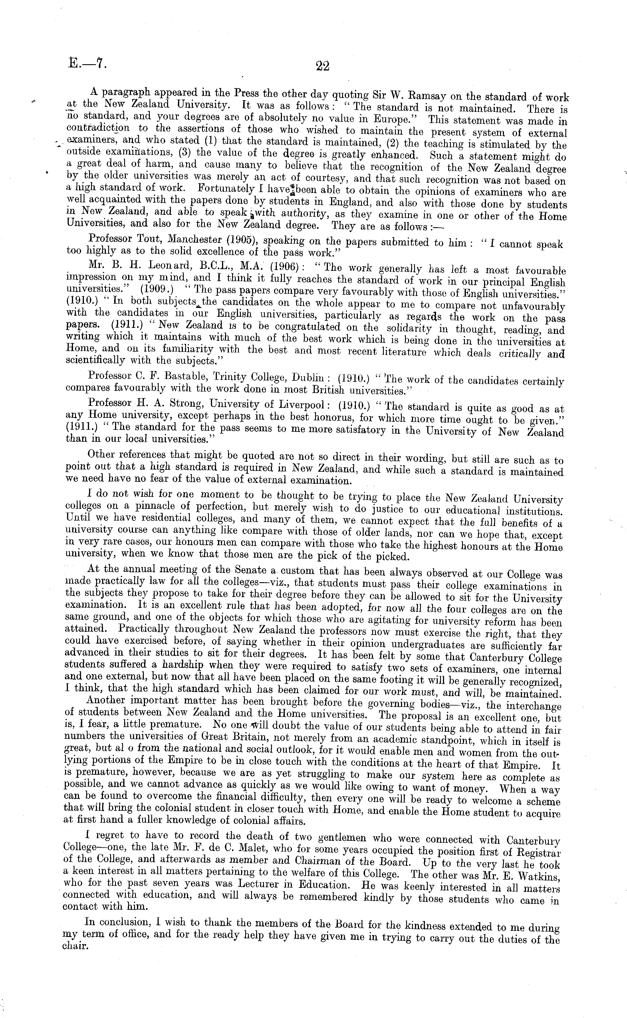 A paragraph appeared m the Press the other day quoting Sir W. Ramsay on the standard of work at the New Zealand University. It was as follows : " The standard is not maintained. There is no standard, and your degrees are of absolutely no value in Europe." This statement was made in contradiction to the assertions of those who wished to maintain the present system of external exammers, and who stated (1) that the standard is maintained, (2) the teaching is stimulated by the outside examinations, (3) the value of the degree is greatly enhanced. Such a statement might do a great deal of harm, and cause many to believe that the recognition of the New Zealand decree by the older universities was merely an act of courtesy, and that such recognition was not based on a high standard of work. Fortunately I able to obtain the opinions of examiners who are well acquainted with the papers done by students in England, and also with those done by students in JNew Zealand, and able to speak jwith authority, as they examine in one or other of the Home Universities, and also for the New Zealand degree. They are as follows :— Professor Tout, Manchester (1905), speaking on the papers submitted to him : " I cannot speak too highly as to the solid excellence of the pass work." Mr. B. H. Leonard, B C.L. M.A. (1906) : << The work generally has left a most favourable impression on my mind and I think it fully reaches the standard of work in our principal English universities/ (1909.) • The pass papers compare very favourably with those of English universities." (1910.) In both subjectsjiie candidates on the whole appear to me to compare not unfavourably with the candidates in our English universities, particularly as regards the work on the pass papers. (1911.) " New Zealand is to be congratulated on the solidarity in thought, reading, and writing which it maintains with much of the best work which is being done in the universities at Home and on its familiarity with the best and most recent literature which deals critically and scientifically with the subjects." J Professor C. F Bastable, Trinity College, Dublin : (1910.) " The work of the candidates certainly compares favourably with the work done in most British universities." Professor H. A. Strong, University of Liverpool: (1910.) " The standard is quite as good as at f 1 n /,^Tnu UnlVei ' S1 1 ty ' 1 c J XCept perlla P S in the best hcmorus, for which more time ought to be given " (1911.) lhe standard lor the pass seems to me more satisfatory in the University of New Zealand than m our local universities." Other references that might be quoted are not so direct in their wording, but still are such as to point out that a high standard is required in New Zealand, and while such a standard is maintained we need have no fear of the value of external examination. I do not wish for one moment to be thought to be trying to place the New Zealand University colleges on a pinnacle of perfection, but merely wish to do justice to our educational institutions. Until we have residential colleges, and many of them, we cannot expect that the full benefits of a university course can anything like compare with those of older lands, nor can we hope that except m very rare cases, our honours men can compare with those who take the highest honours at the Home university, when we know that those men are the pick of the picked. At the annual meeting of the Senate a custom that has been always observed at our College was made practically law for all the colleges-viz., that students must pass their college examinations in the subjects they propose to take for their degree before they can be allowed to sit for the University examination It is an excellent rule that has been adopted, for now all the four colleges are on the same ground, and one of the objects for which those who are agitating for university reform has been attained. Practically throughout New Zealand the professors now must exercise the right that they could have exercised before, of saying whether in their opinion undergraduates are sufficiently far advanced in their studies to sit for their degrees. It has been felt by some that Canterbury College students suffered a hardship when they were required to satisfy two sets of examiners one internal and one external, but now that all have been placed on the same footing it will be generally recognized I think, that the high standard which has been claimed for our work must, and will be maintained' * r?.l ™P orta S* matt( f h f s b f™ br °ught before the governing bodies-viz.,'the interchange of students between New Zealand and the Home universities. The proposal is an excellent one but is, I fear, a little premature. No one will doubt the value of our students being able to attend in failnumbers the universities of Great Britain, not merely from an academic standpoint, which in itself is great, but al o from the national and social outlook, for it would enable men and women from the outlying portions of the Empire to be m close touch with the conditions at the heart of that Empire It is premature, however, because we are as yet struggling to make our system here as complete as possible, and we cannot advance as quickly as we would like owing to want of money When a wav can be found to overcome the financial difficulty, then every one will be ready to welcome a scheme that will bring the colonial student m closer touch with Home, and enable the Home student to acquire at first hand a fuller knowledge of colonial affairs. I regret to have to record the death of two gentlemen who were connected with Canterbury °!f ge^,i ne ' I , ide°- Ma 6t ' Wh ° fOT Some years OCC "Ped the position first of Registrar of the College, and afterwards as member and Chairman of the Board. Up to the very last he took a keen interest m ail matters pertaining to the welfare of this College. The other was Mr E Watkins who for the past seven years was Lecturer in Education. He was ke