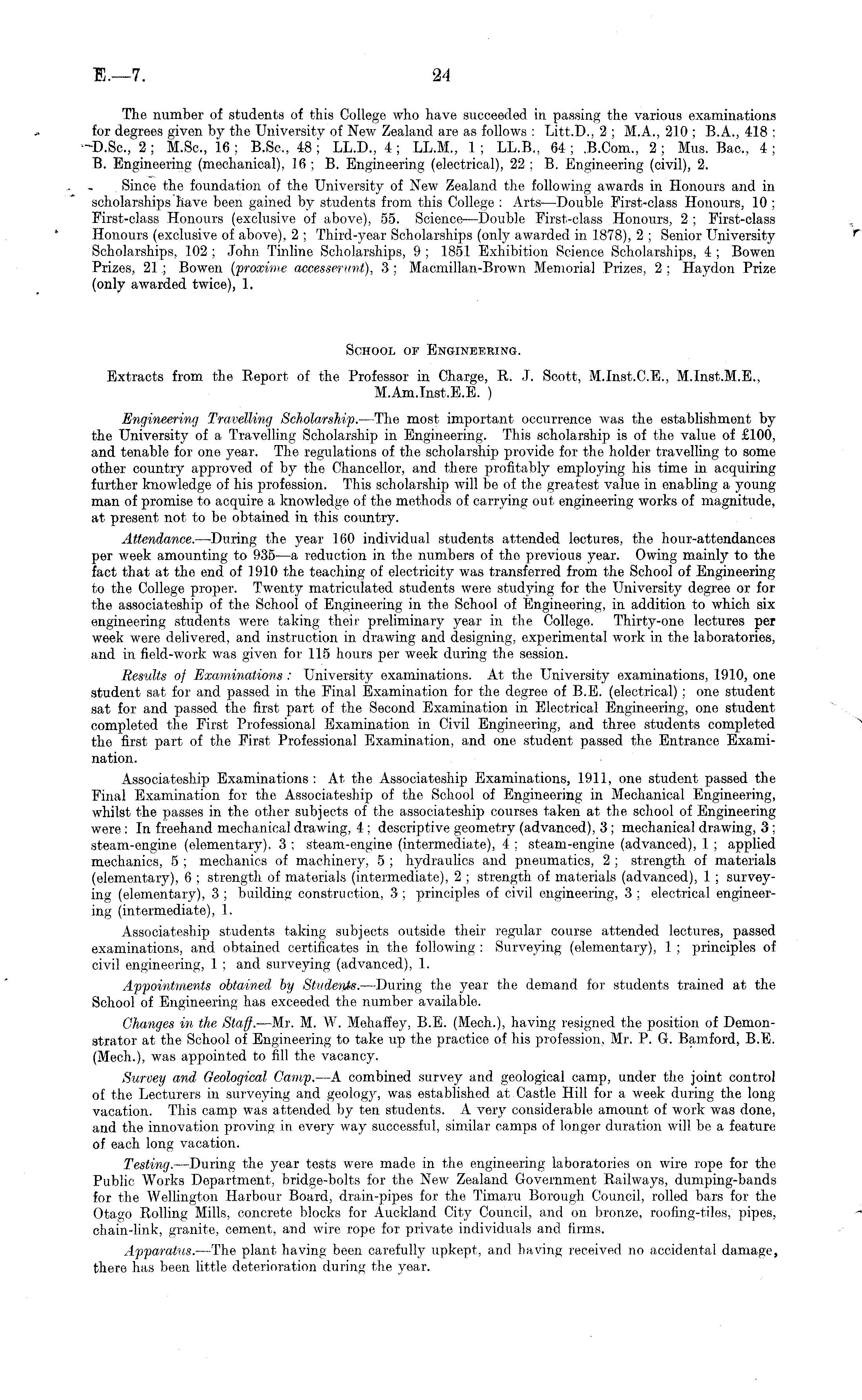 The number of students of this College who have succeeded in passing the various examinations for degrees given by the University of New Zealand are as follows : Litt.D., 2 ; M.A., 210 ; 8.A., 418 ; ~D.Sc, 2 ; M.Sc, 16 ; B.Sc, 48 ; LL.D., 4 ; LL.M., 1 ; LL.B., 64 ; 8.C0m., 2 ; Mus. Bac, 4 ; B. Engineering (mechanical), 16 ; B. Engineering (electrical), 22 ; B. Engineering (civil), 2. Since the foundation of the University of New Zealand the following awards in Honours and in scholarships have been gained by students from this College : Arts—Double First-class Honours, 10 ; First-class Honours (exclusive of above), 55. Science-—Double First-class Honours, 2 ; First-class Honours (exclusive of above), 2 ; Third-year Scholarships (only awarded in 1878), 2 ; Senior University Scholarships, 102 ; John Tinline Scholarships, 9 ; 1851 Exhibition Science Scholarships, 4 ; Bowen Prizes, 21 ; Bowen (proxime accesserunt), 3 ; Macmillan-Brown Memorial Prizes, 2 ; Haydon Prize (only awarded twice), 1. School of Engineering. Extracts from the Report of the Professor in Charge, R. J. kScott, M.lnst.C.E., M.lnst.M.E.. M.Am.lnst.E.E. ) Engineering Travelling Scholarship. —The most important occurrence was the establishment by the University of a Travelling Scholarship in Engineering. This scholarship is of the value of £100, and tenable for one year. The regulations of the scholarship provide for the holder travelling to some other country approved of by the Chancellor, and there profitably employing his time in acquiring further knowledge of his profession. This scholarship will be of the greatest value in enabling a young man of promise to acquire a knowledge of the methods of carrying out engineering works of magnitude, at present not to be obtained in this country. Attendance. —During the year 160 individual students attended lectures, the hour-attendances per week amounting to 935 —a reduction in the numbers of the previous year. Owing mainly to the fact that at the end of 1910 the teaching of electricity was transferred from the School of Engineering to the College proper. Twenty matriculated students were studying for the University degree or for the associateship of the School of Engineering in the School of Engineering, in addition to which six engineering students were taking their preliminary year in the College. Thirty-one lectures per week were delivered, and instruction in drawing and designing, experimental work in the laboratories, and in field-work was given for 115 hours per week during the session. Results of Examinations : University examinations. At the University examinations, 1910, one student sat for and passed in the Final Examination for the degree of B.E. (electrical); one student sat for and passed the first part of the Second Examination in Electrical Engineering, one student completed the First Professional Examination in Civil Engineering, and three students completed the first part of the First Professional Examination, and one student passed the Entrance Examination. Associateship Examinations : At the Associateship Examinations, 1911, one student passed the Final Examination for the Associateship of the School of Engineering in Mechanical Engineering, whilst the passes in the other subjects of the associateship courses taken at the school of Engineering were: In freehand mechanical drawing, 4; descriptive geometry (advanced), 3; mechanical drawing, 3; steam-engine (elementary), 3 ; steam-engine (intermediate), 4 ; steam-engine (advanced), 1 ; applied mechanics, 5 ; mechanics of machinery, 5 ; hydraulics and pneumatics, 2 ; strength of materials (elementary), 6 ; strength of materials (intermediate), 2 ; strength of materials (advanced), 1 ; surveying (elementary), 3 ; building construction, 3 ; principles of civil engineering, 3 ; electrical engineering (intermediate), 1. Associates!)ip students taking subjects outside their regular course attended lectures, passed examinations, and obtained certificates in the following : Surveying (elementary), 1 ; principles of civil engineering, 1 ; and surveying (advanced), 1. Appointments obtained by StudenAs. —During the year the demand for students trained at the School of Engineering has exceeded the number available. Changes in the Staff. —Mr. M. W. Mehaffey, B.E. (Mech.), having resigned the position of Demonstrator at the School of Engineering to take up the practice of his profession, Mr. P. G. Bamford, B.E. (Mech.), was appointed to fill the vacancy. Survey and Geological Camp. —A combined survey and geological camp, under the joint control of the Lecturers in surveying and geology, was established at Castle Hill for a week during the long vacation. This camp was attended by ten students. A very considerable amount of work was done, and the innovation proving in every way successful, similar camps of longer duration will be a feature of each long vacation. Testing. —During the year tests were made in the engineering laboratories on wire rope for the Public Works Department, bridge-bolts for the New Zealand Government Railways, dumping-bands for the Wellington Harbour Board, drain-pipes for the Timaru Borough Council, rolled bars for the Otago Rolling Mills, concrete blocks for Auckland City Council, and on bronze, roofing-tiles, pipes, chain-link, granite, cement, and wire rope for private individuals and firms. Apparatus. —The plant having been carefully upkept, and having received no accidental damage, there has been little, deterioration during the year.