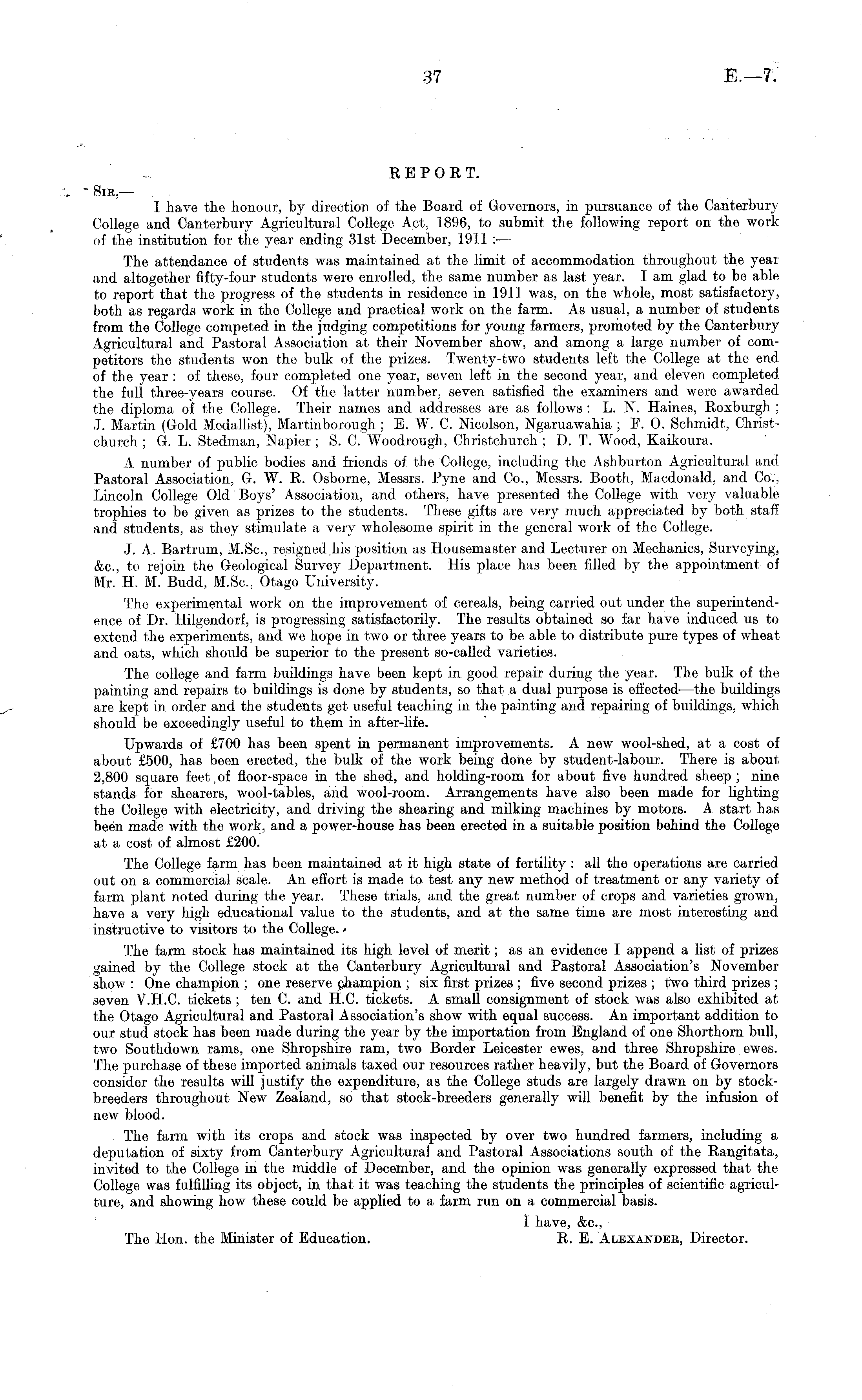 R E P 0 E T. Sir, — I have the honour, by direction of the Board of Governors, in pursuance of the Canterbury College and Canterbury Agricultural College Act, 1896, to submit the following report on the work of the institution for the year ending 31st December, 1911 : — The attendance of students was maintained at the limit of accommodation throughout the year and altogether fifty-four students were enrolled, the same number as last year. lam glad to be able to report that the progress of the students in residence in 1911 was, on the whole, most satisfactory, both as regards work in the College and practical work on the farm. As usual, a number of students from the College competed in the judging competitions for young farmers, promoted by the Canterbury Agricultural and Pastoral Association at their November show, and among a large number of competitors the students won the bulk of the prizes. Twenty-two students left the College at the end of the year : of these, four completed one year, seven left in the second year, and eleven completed the full three-years course. Of the latter number, seven satisfied the examiners and were awarded the diploma of the College. Their names and addresses are as follows :L. N. Haines, Roxburgh ; J. Martin (Gold Medallist), Martinborough ; E. W. C. Nieolson, Ngaruawahia ; F. 0. Schmidt, Christchurch ; G. L. Stedman, Napier ; S. C. Woodrough, Christchurch ; D. T. Wood, Kaikoura. A number of public bodies and friends of the College, including the Ashburton Agricultural and Pastoral Association, G. W. R. Osborne, Messrs. Pyne and Co., Messrs. Booth, Macdonald, and Co., Lincoln College Old Boys' Association, and others, have presented the College with very valuable trophies to be given as prizes to the students. These gifts are very much appreciated by both, staff and students, as they stimulate a very wholesome spirit in the general work of the College. J. A. Barti'um, M.Sc, resigned his position as Housemaster and Lecturer on Mechanics, Surveying, &c, to rejoin the Geological Survey Department. His place has been filled by the appointment of Mr. H. M. Budd, M.Sc, Otago University. The experimental work on the improvement of cereals, being carried out under the superintendence of Dr. Hilgendorf, is progressing satisfactorily. The results obtained so far have induced us to extend the experiments, and we hope in two or three years to be able to distribute pure types of wheat and oats, which should be superior to the present so-called varieties. The college and farm buildings have been kept in good repair during the year. The bulk of the painting and repairs to buildings is done by students, so that a dual purpose is effected- —the buildings are kept in order and the students get useful teaching in the painting and repairing of buildings, which should be exceedingly useful to them in after-life. Upwards of £700 has been spent in permanent improvements. A new wool-shed, at a cost of about £500, has been erected, the bulk of the work being done by student-labour. There is about 2,800 square feet of floor-space in the shed, and holding-room for about five hundred sheep; nine stands for shearers, wool-tables, and wool-room. Arrangements have also been made for lighting the College with electricity, and driving the shearing and milking machines by motors. A start has been made with the work, and a power-house has been erected in a suitable position behind the College at a cost of almost £200. The College farm has been maintained at it high state of fertility : all the operations are carried out on a commercial scale. An effort is made to test any new method of treatment or any variety of farm plant noted during the year. These trials, and the great number of crops and varieties grown, have a very high educational value to the students, and at the same time are most interesting and instructive to visitors to the College. • The farm stock has maintained its high level of merit; as an evidence I append a list of prizes gained by the College stock at the Canterbury Agricultural and Pastoral Association's November show : One champion ; one reserve champion ; six first prizes ; five second prizes ; two third prizes ; seven V.H.C. tickets; ten C. and H.C. tickets. A small consignment of stock was also exhibited at the Otago Agricultural and Pastoral Association's show with equal success. An important addition to our stud stock has been made during the year by the importation from England of one Shorthorn bull, two Southdown rams, one Shropshire ram, two Border Leicester ewes, and three Shropshire ewes. The purchase of these imported animals taxed our resources rather heavily, but the Board of Governors consider the results will justify the expenditure, as the College studs are largely drawn on by stockbreeders throughout New Zealand, so that stock-breeders generally will benefit by the infusion of new blood. The farm with its crops and stock was inspected by over two hundred farmers, including a deputation of sixty from Canterbury Agricultural and Pastoral Associations south of the Rangitata, invited to the College in the middle of December, and the opinion was generally expressed that the College was fulfilling its object, in that it was teaching the students the principles of scientific agriculture, and showing how these could be applied to a farm run on a commercial basis. 1 have, &c, The Hon. the Minister of Education. R. E. Alexander, Director.