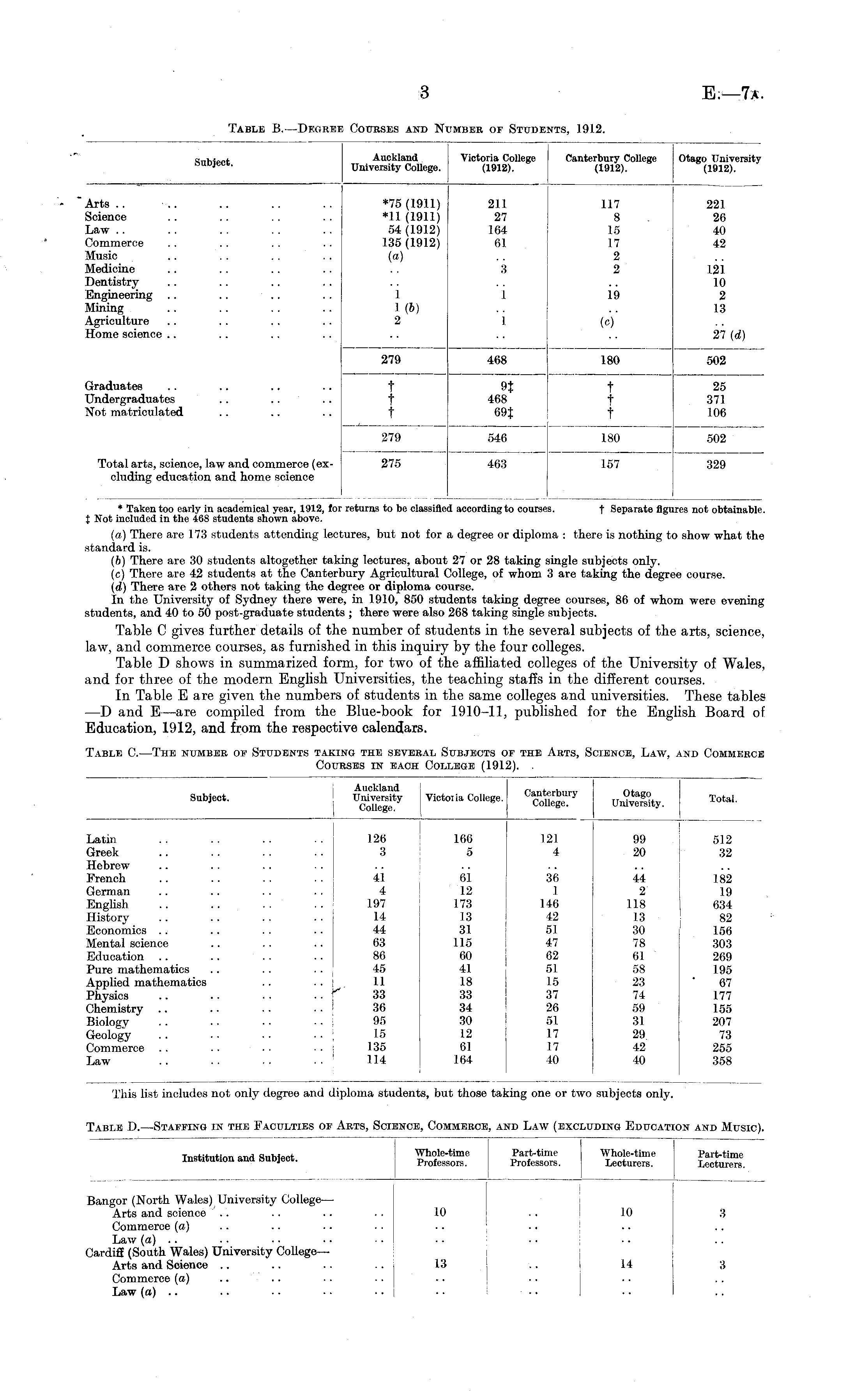 * Taken too early in academical year, 1912, for returns to be classified according to courses. t Separate figures not obtainable. ± Not included in the 468 students shown above. (a) There are 173 students attending lectures, but not for a degree or diploma : there is nothing to show what the standard is. (6) There are 30 students altogether taking lectures, about 27 or 28 taking single subjects only. (c) There are 42 students at the Canterbury Agricultural College, of whom 3 are taking the degree course. (d) There are 2 others not taking the degree or diploma course. In the University of Sydney there were, in 1910, 850 students taking degree courses, 86 of whom were evening students, and 40 to 50 post-graduate students ; there were also 268 taking single subjects. Table C gives further details of the number of students in the several subjects of the arts, science, law, and commerce courses, as furnished in this inquiry by the four colleges. Table D shows in summarized form, for two of the affiliated colleges of the University of Wales, and for three of the modern English Universities, the teaching staffs in the different courses. In Table E are given the numbers of students in the same colleges and universities. These tables —D and E—are compiled from the Blue-book for 1910-11, published for the English Board of Education, 1912, and from the respective calendars.