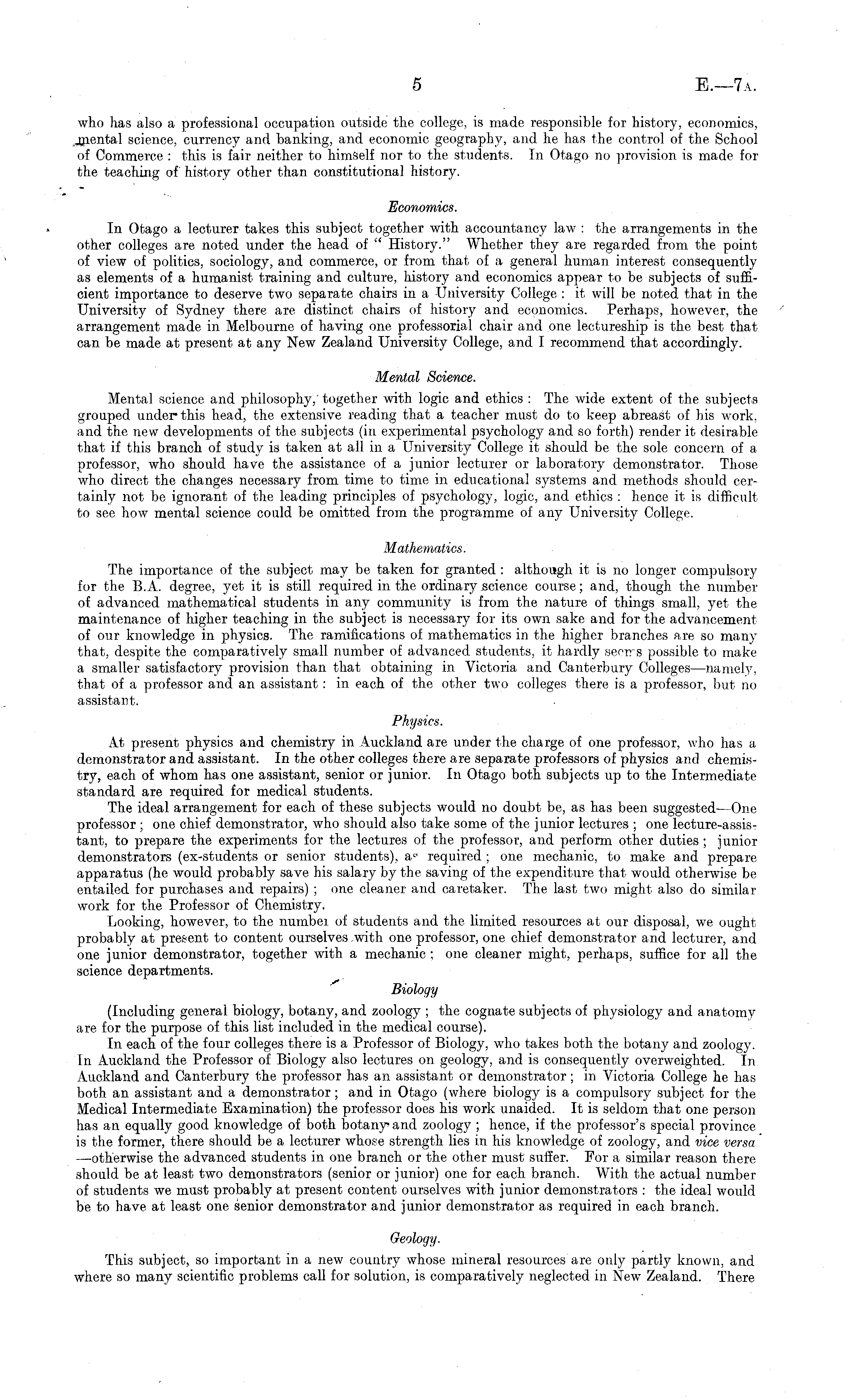 who has also a professional occupation outside the college, is made responsible for history, economics, mental science, currency and banking, and economic geography, and he has the control of the School of Commerce : this is fair neither to himself nor to the students. In Otago no provision is made for the teaching of history other than constitutional history. Economics. In Otago a lecturer takes this subject together with accountancy law : the arrangements in the other colleges are noted under the head of " History." Whether they are regarded from the point of view of politics, sociology, and commerce, or from that of a general human interest consequently as elements of a humanist training and culture, history and economics appear to be subjects of sufficient importance to deserve two separate chairs in a University College : it will be noted that in the University of Sydney there are distinct chairs of history and economics. Perhaps, however, the arrangement made in Melbourne of having one professorial chair and one lectureship is the best that can be made at present at any New Zealand University College, and I recommend that accordingly. Mental Science. Mental science and philosophy, together with logic and ethics : The wide extent of the subjects grouped under this head, the extensive reading that a teacher must do to keep abreast of his work, and the new developments of the subjects (in experimental psychology and so forth) render it desirable that if this branch of study is taken at all in a University College it should be the sole concern of a professor, who should have the assistance of a junior lecturer or laboratory demonstrator. Those who direct the changes necessary from time to time in educational systems and methods should certainly not be ignorant of the leading principles of psychology, logic, and ethics : hence it is difficult to see how mental science could be omitted from the programme of any University College. Mathematics. The importance of the subject may be taken for granted : although it is no longer compulsory for the B.A. degree, yet it is still required in the ordinary science course; and, though the number of advanced mathematical students in any community is from the nature of things small, yet the maintenance of higher teaching in the subject is necessary for its own sake and for the advancement of our knowledge in physics. The ramifications of mathematics in the higher branches are so many that, despite the comparatively small number of advanced students, it hardly seerrs possible to make a smaller satisfactory provision than that obtaining in Victoria and Canterbury Colleges—namely, that of a professor and an assistant : in each of the other two colleges there is a professor, but no assistant. Physics. At present physics and chemistry in Auckland are under the charge of one professor, who has a demonstrator and assistant. In the other colleges there are separate professors of physics and chemistry, each of whom has one assistant, senior or junior. In Otago both subjects up to the Intermediate standard are required for medical students. The ideal arrangement for each of these subjects would no doubt be, as has been suggested—One professor ; one chief demonstrator, who should also take some of the junior lectures ; one lecture-assis-tant, to prepare the experiments for the lectures of the professor, and perform other duties ; junior demonstrators (ex-students or senior students), a" required ; one mechanic, to make and prepare apparatus (he would probably save his salary by the saving of the expenditure that would otherwise be entailed for purchases and repairs) ; one cleaner and caretaker. The last two might also do similar work for the Professor of Chemistry. Looking, however, to the numbei of students and the limited resources at our disposal, we ought probably at present to content ourselves with one professor, one chief demonstrator and lecturer, and one junior demonstrator, together with a mechanic ; one cleaner might, perhaps, suffice for all the science departments. Biology (Including general biology, botany, and zoology ; the cognate subjects of physiology and anatomy are for the purpose of this list included in the medical course). In each of the four colleges there is a Professor of Biology, who takes both the botany and zoology. In Auckland the Professor of Biology also lectures on geology, and is consequently overweighted. In Auckland and Canterbury the professor has an assistant or demonstrator ; in Victoria College he has both an assistant and a demonstrator ; and in Otago (where biology is a compulsory subject for the Medical Intermediate Examination) the professor does his work unaided. It is seldom that one person has an equally good knowledge of both botany- and zoology ; hence, if the professor's special province is the former, there should be a lecturer whose strength lies in his knowledge of zoology, and vice versa —otherwise the advanced students in one branch or the other must suffer. For a similar reason there should be at least two demonstrators (senior or junior) one for each branch. With the actual number of students we must probably at present content ourselves with junior demonstrators : the ideal would be to have at least one senior demonstrator and junior demonstrator as required in each branch. Geology. This subject, so important in a new country whose mineral resources are only partly known, and where so many scientific problems call for solution, is comparatively neglected in New Zealand. There